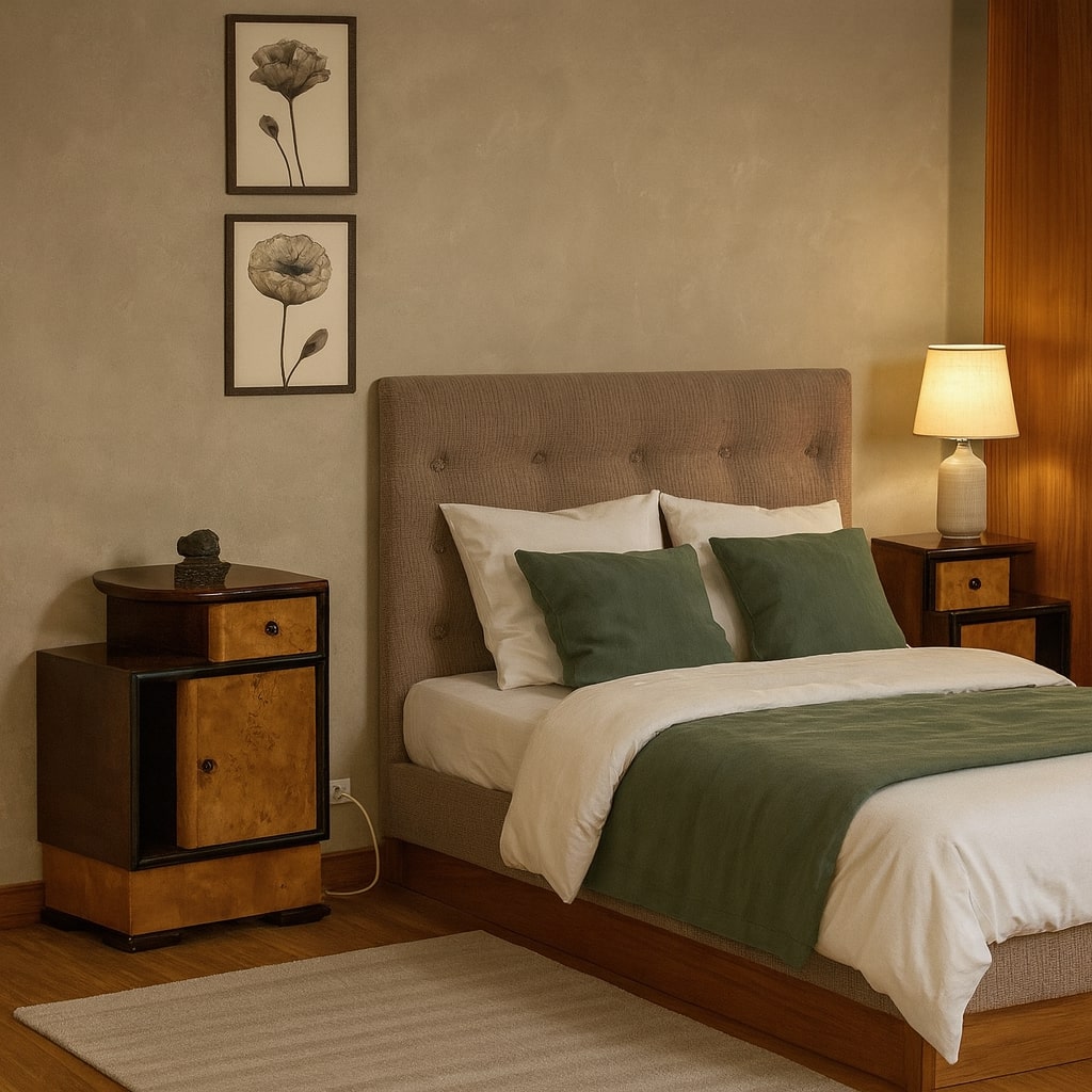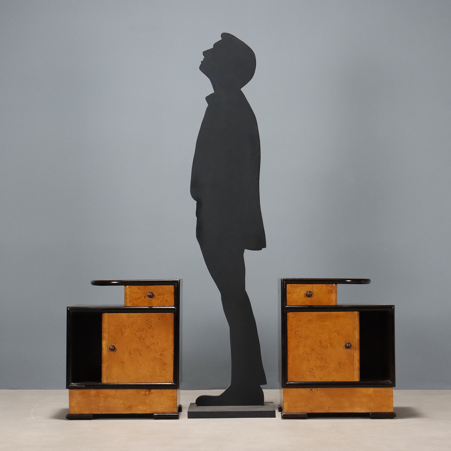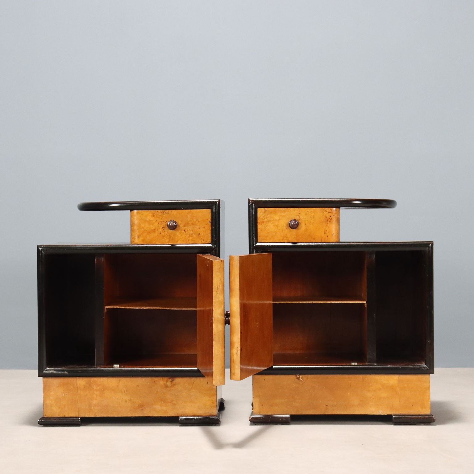 Coppia di comodini di gusto déco con impiallacciatura in legno esotico e radica.