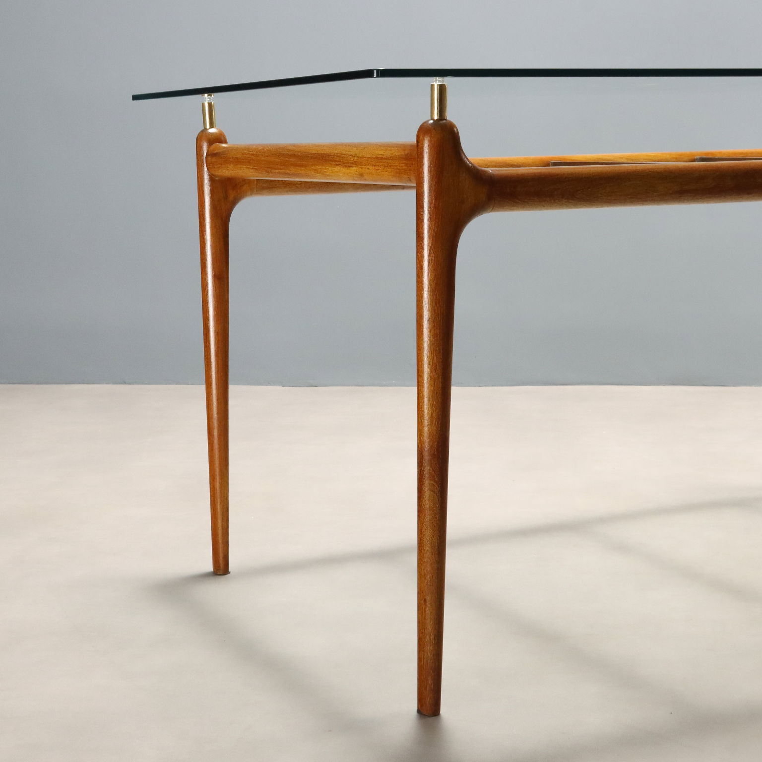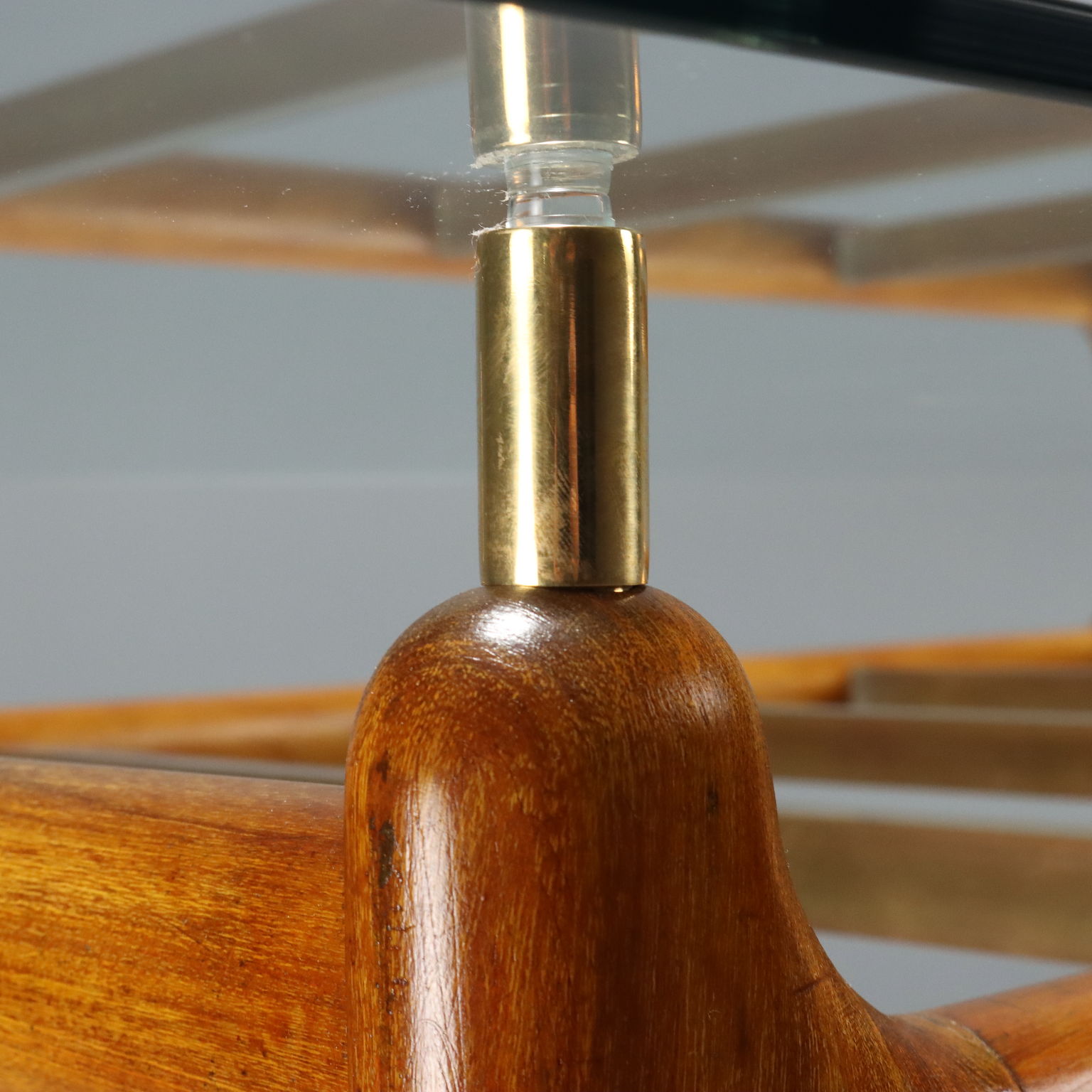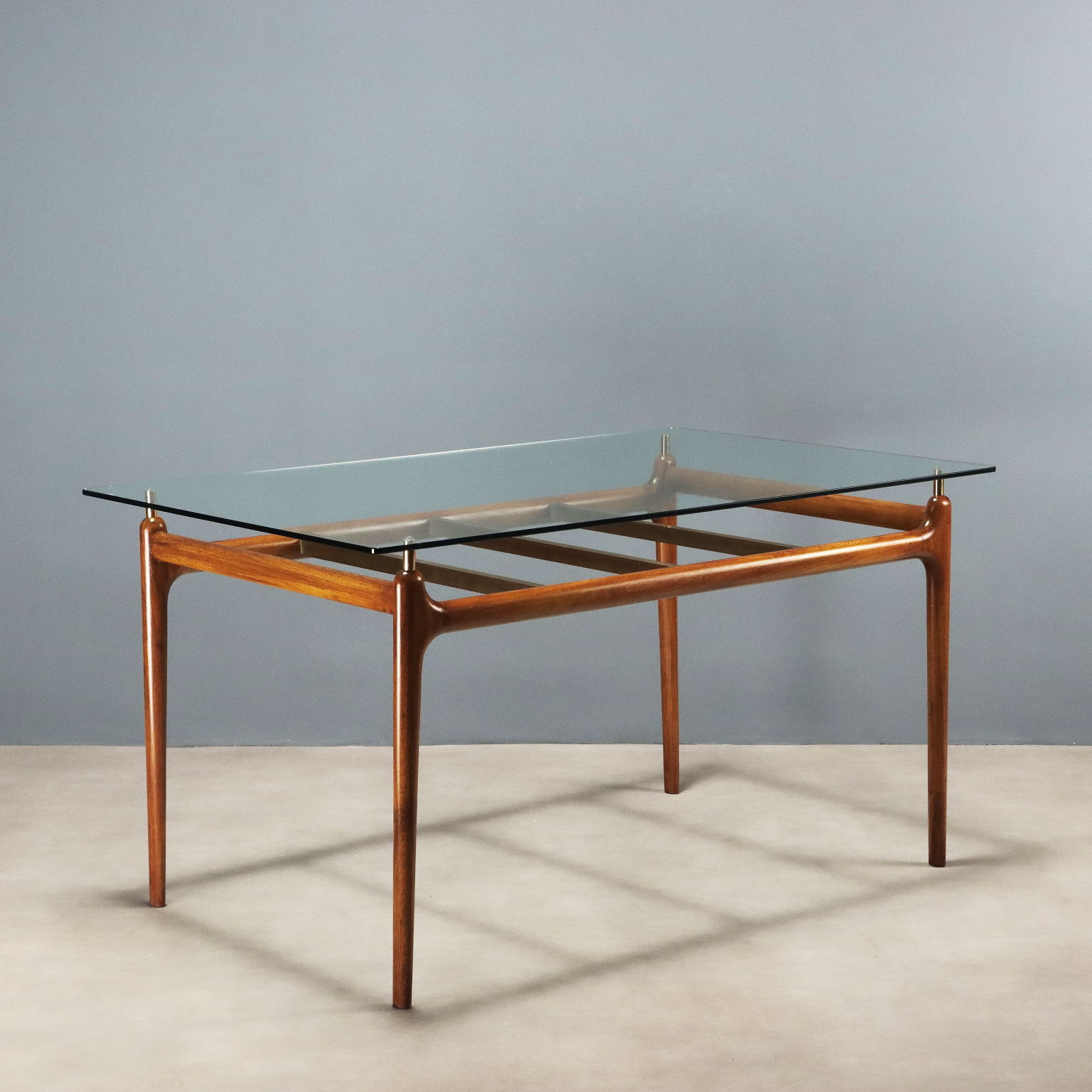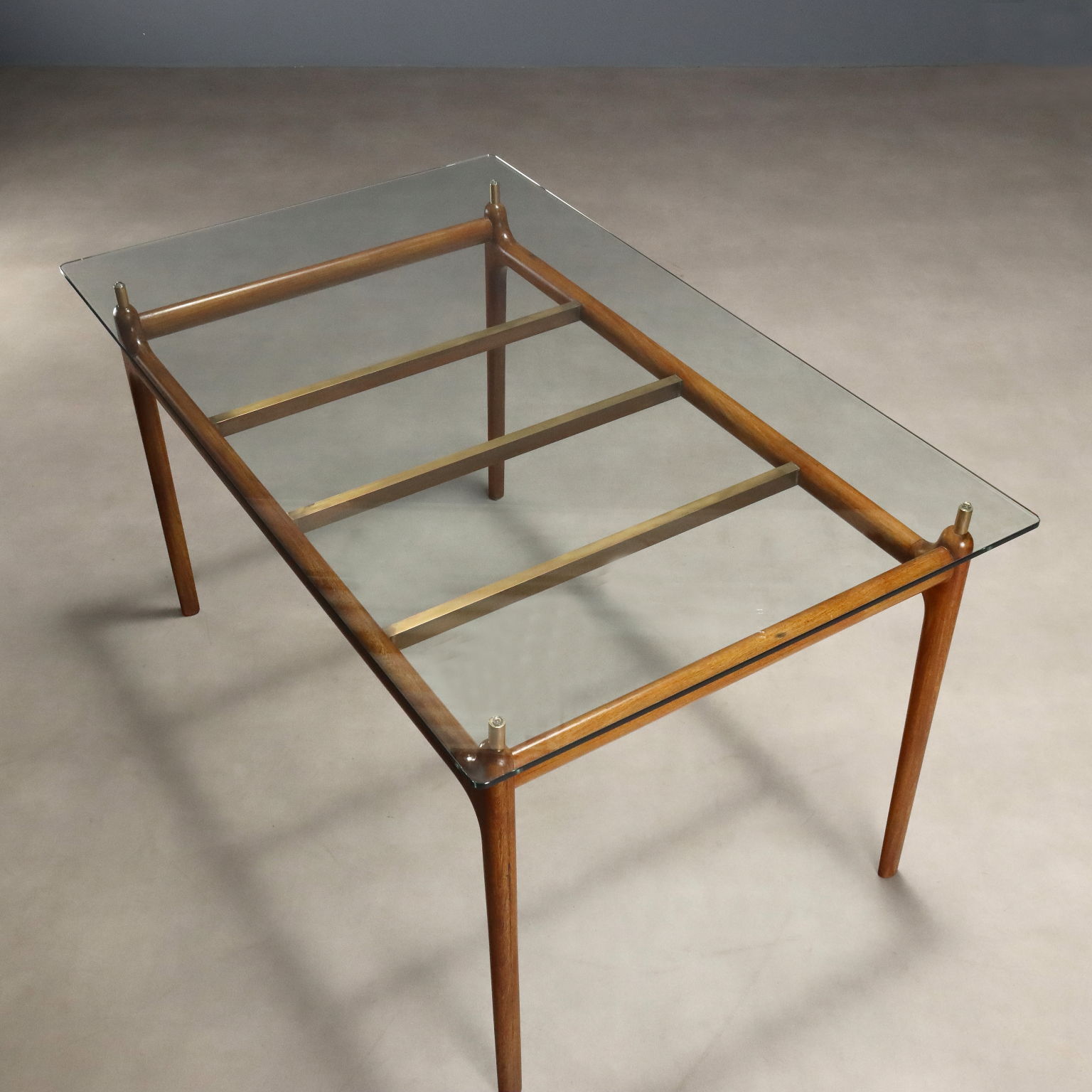 Elegante tavolo da pranzo vintage con struttura in legno a vista e piano in vetro rettangolare che poggia su distanziali in ottone.