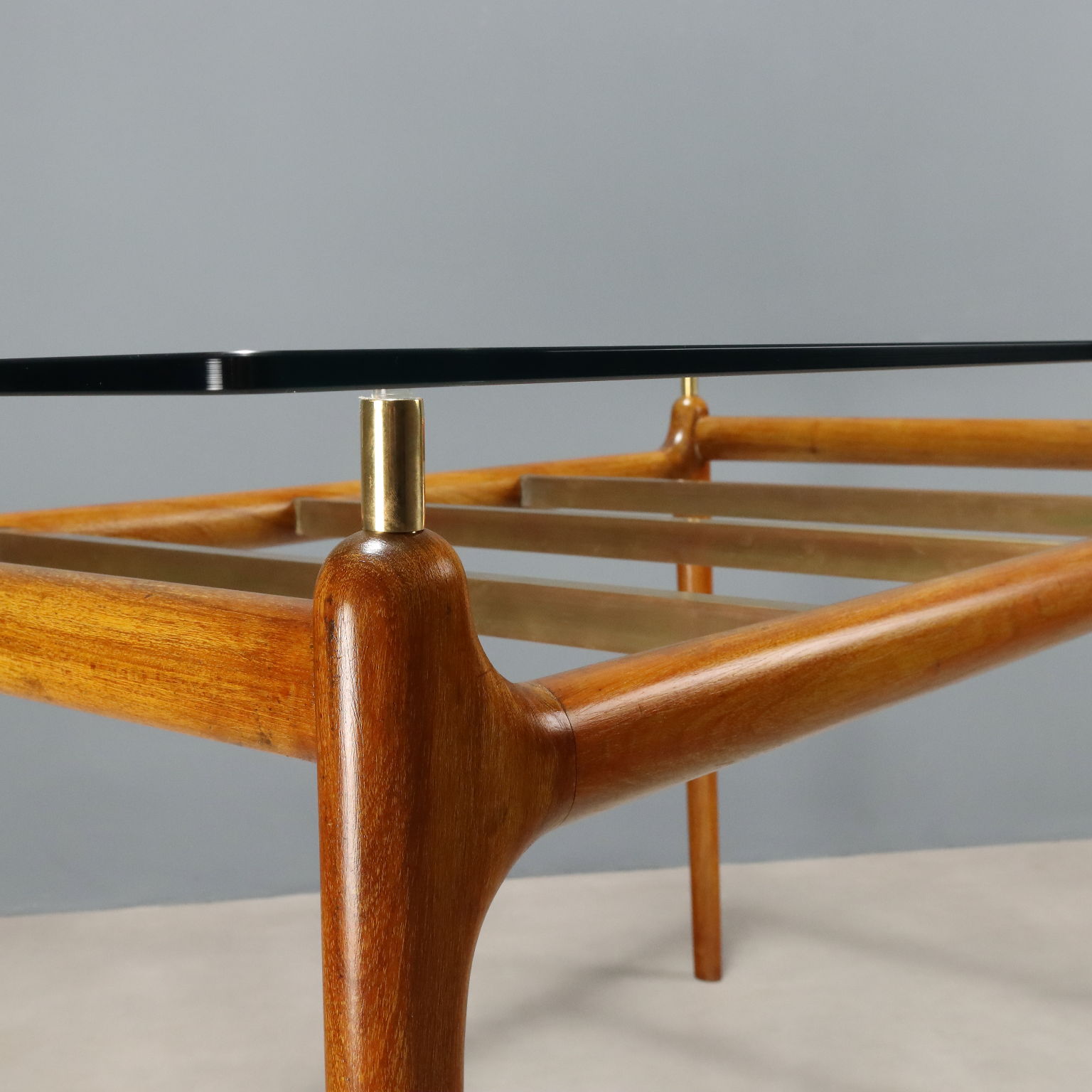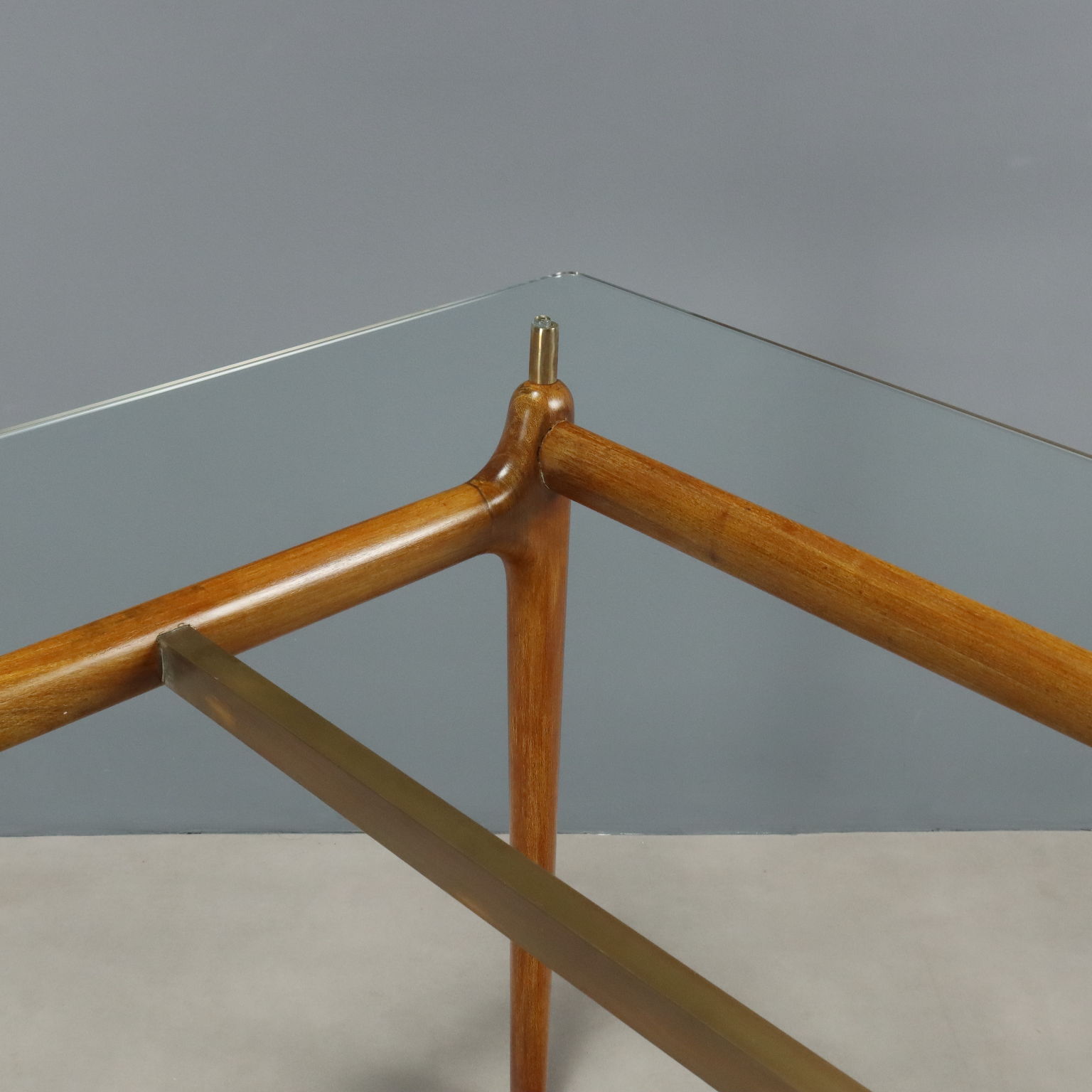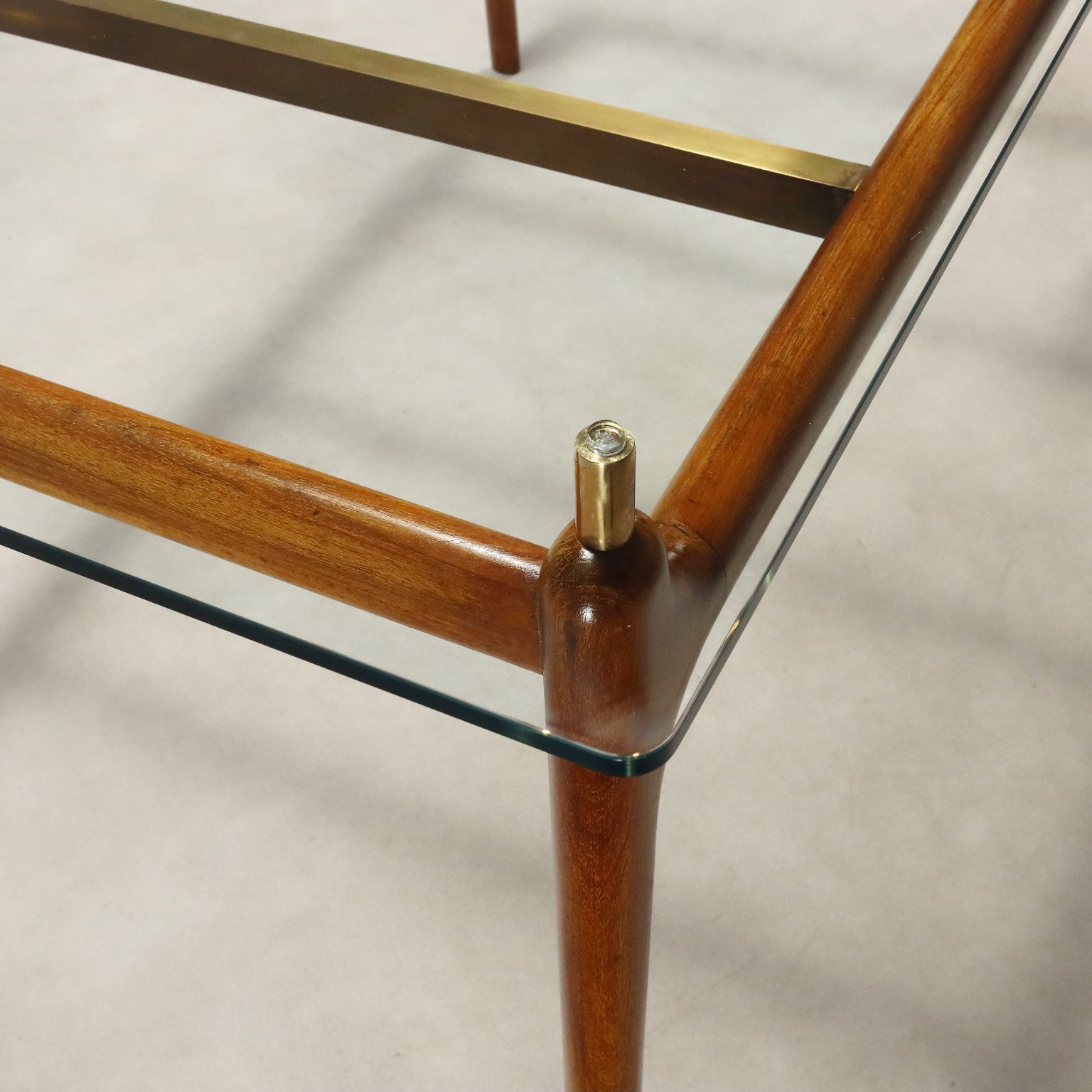 Elegante tavolo da pranzo vintage con struttura in legno a vista e piano in vetro rettangolare che poggia su distanziali in ottone.