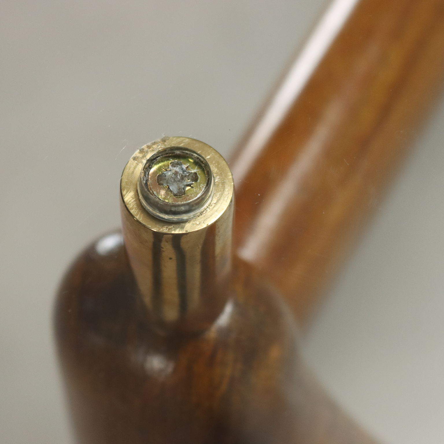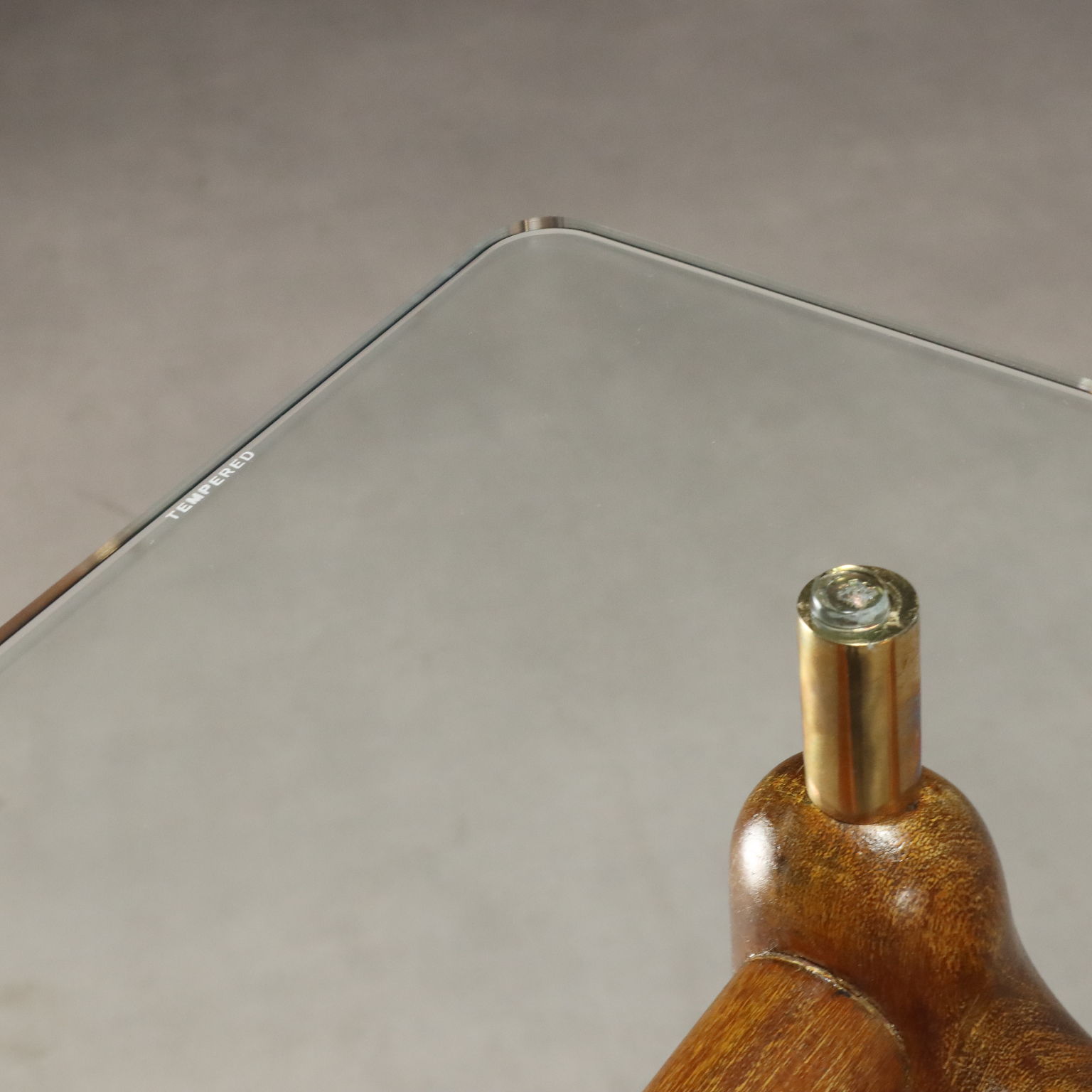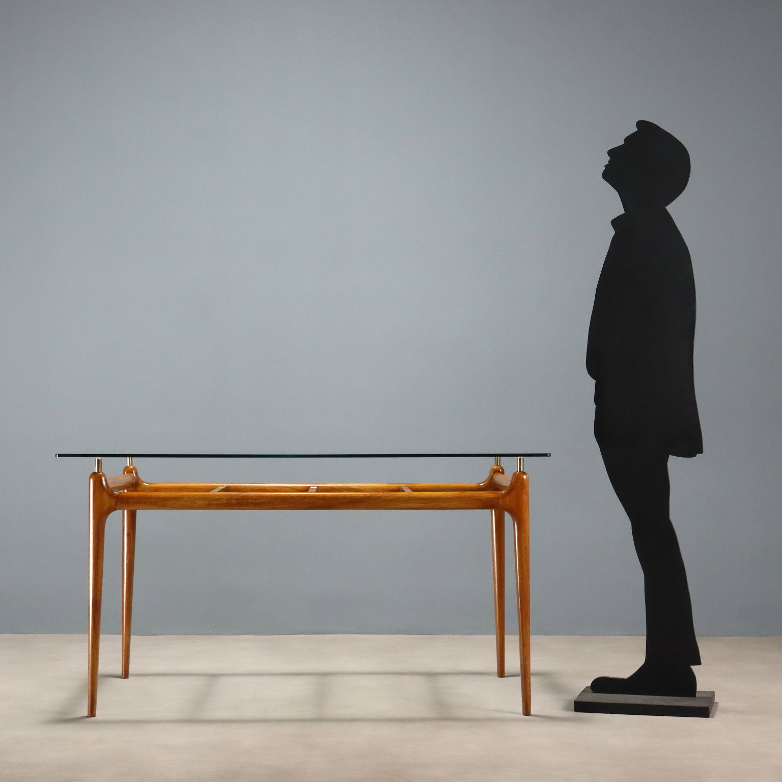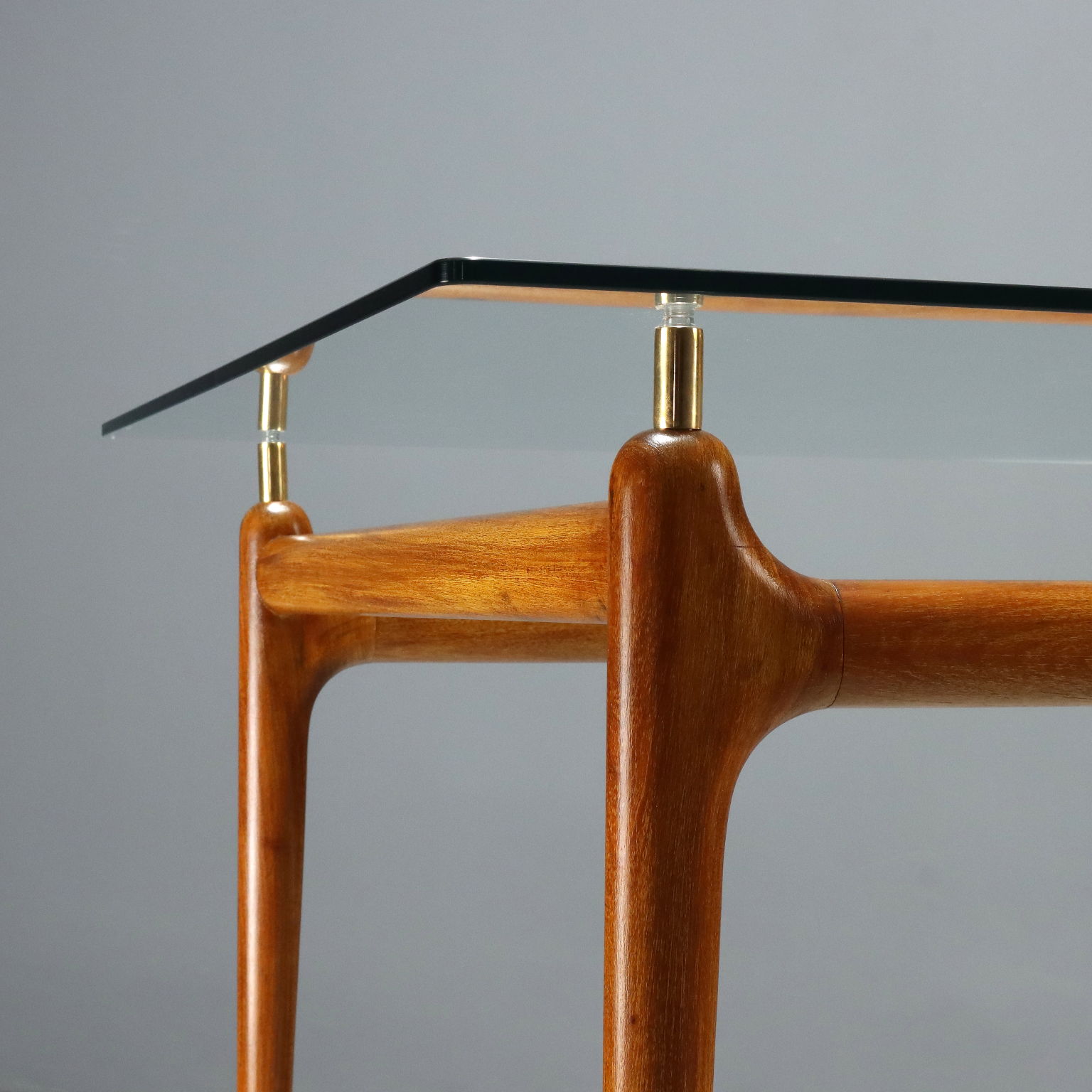 Elegante tavolo da pranzo vintage con struttura in legno a vista e piano in vetro rettangolare che poggia su distanziali in ottone.