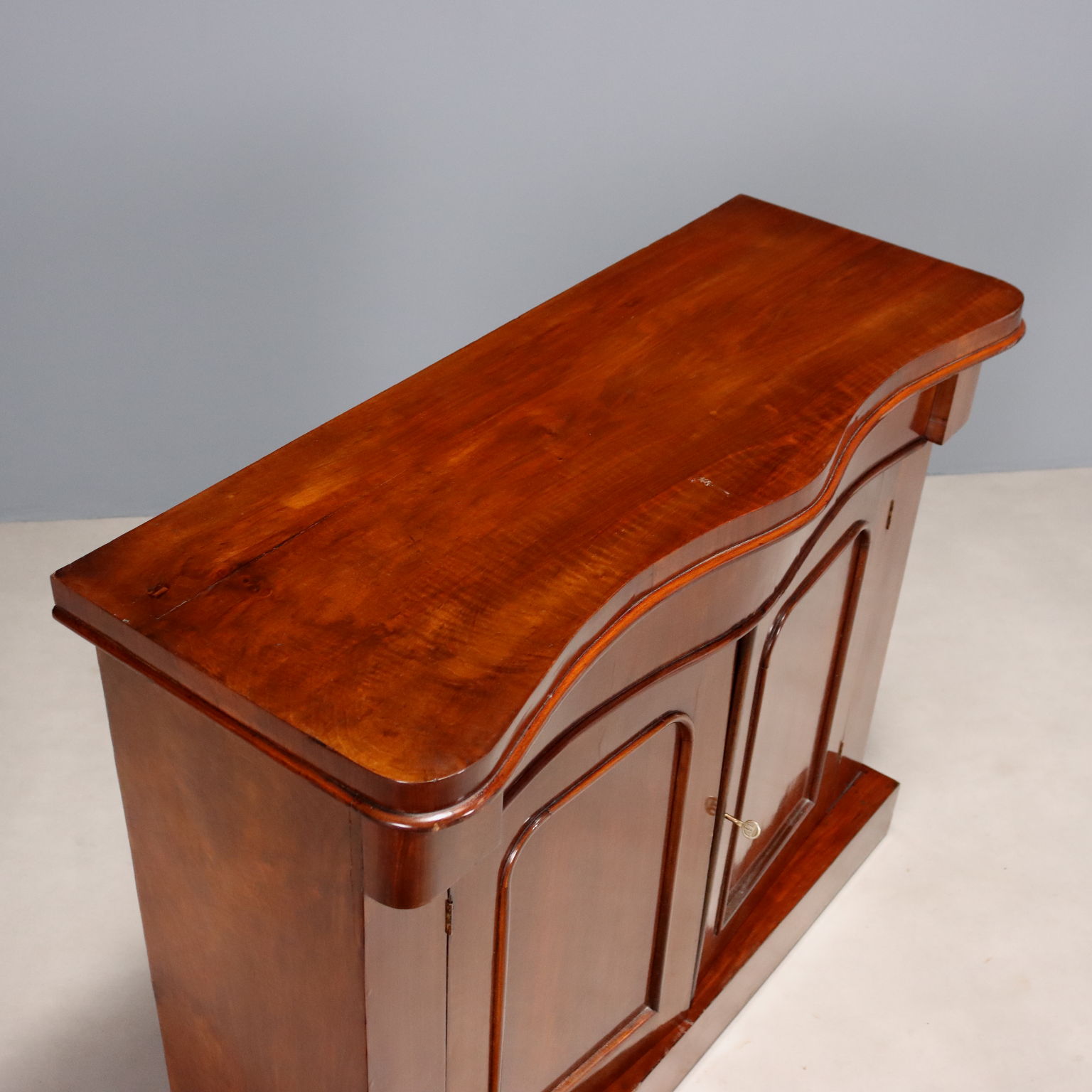 Credenza vittoriana della fine del '800 in mogano. Realizzata a due ante e un cassetto posto sotto il piano sagomato, base a plinto.