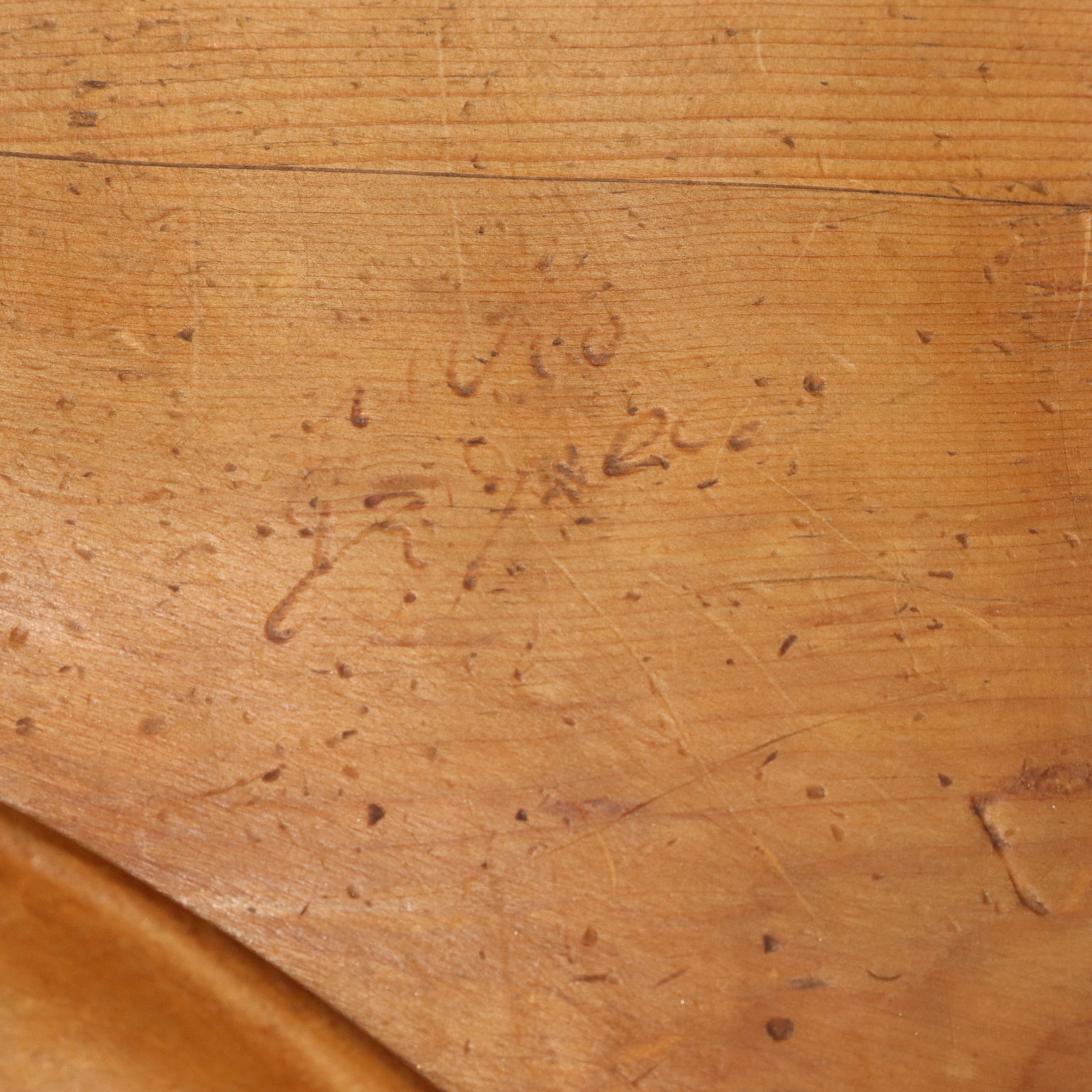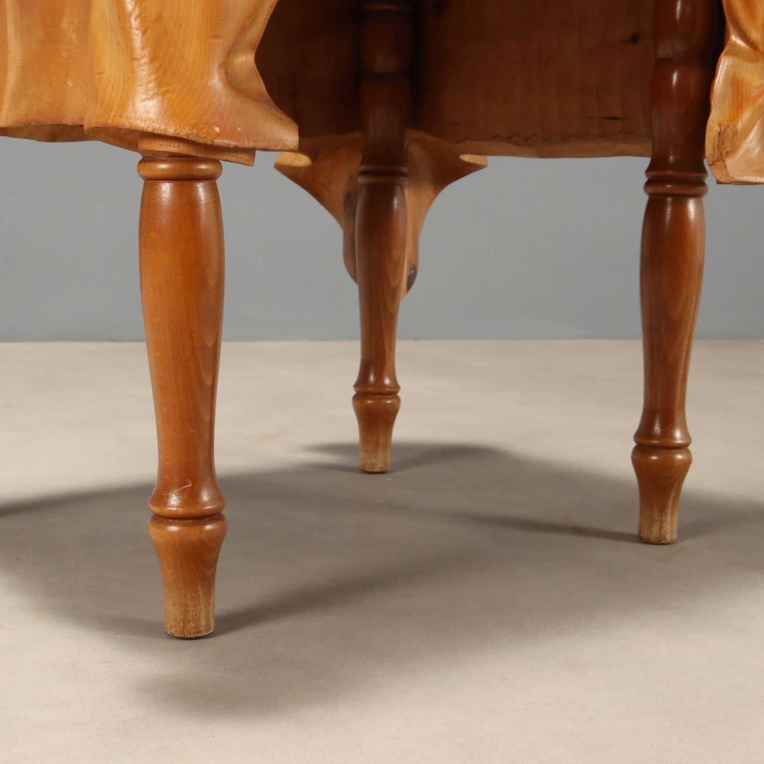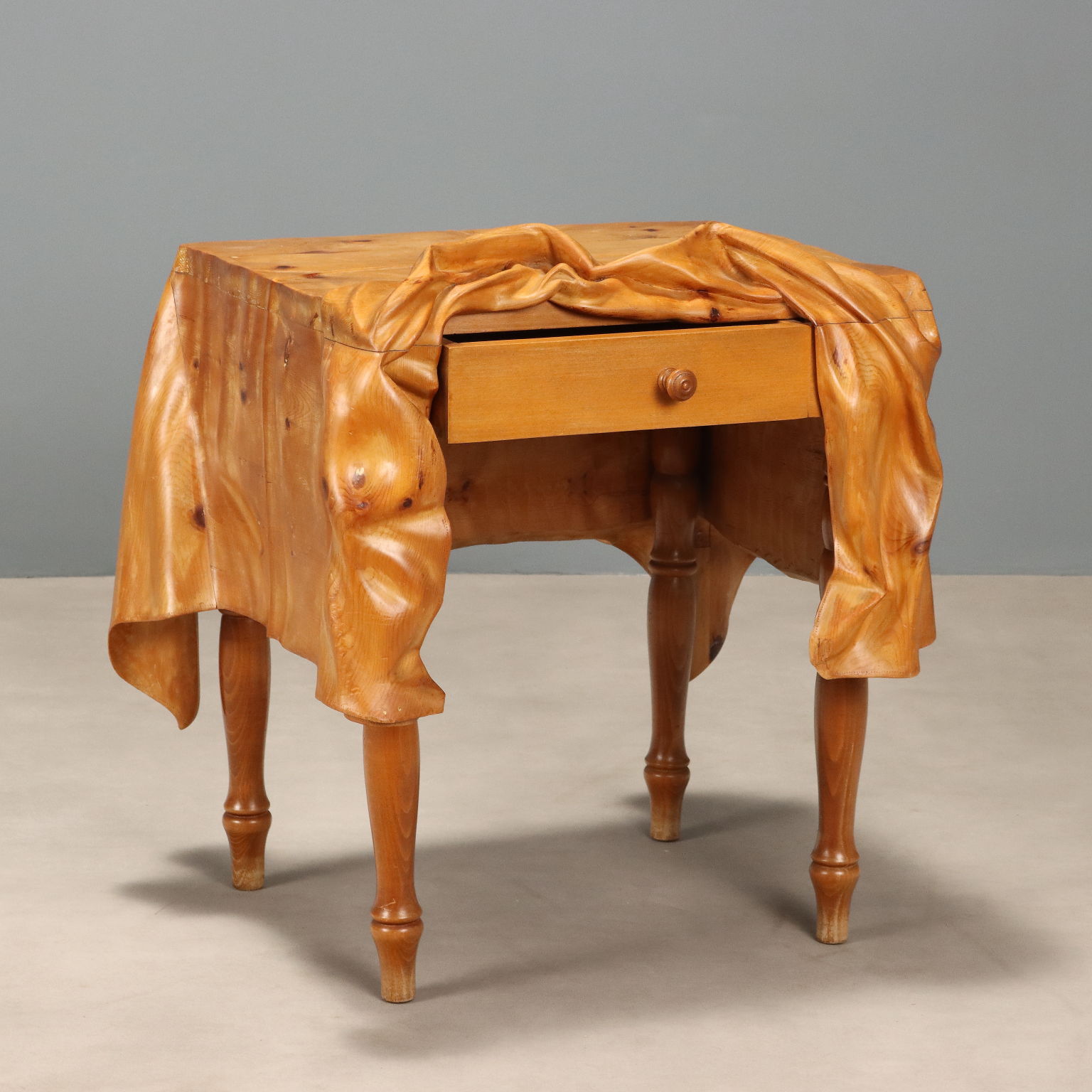 Arredo-scultura dell'artista veneziano Livio De Marchi, conosciuto anche come "Il Falegname di Venezia". Ancora bambino, lavora alla scultura ornamentale in una bottega artigiana e, contemporaneamente, studia arte e disegno all'Accademia. E' lì che inizia la sua attività, subito rivelando una inconsueta abilità nel plasmare la materia, che si traduce in una sensibilità ironica che lo spinge a produrre sculture. Nella sua evoluzione artistica transita dal marmo al bronzo, sino ad pervenire al legno che rimarrà la sua materia preferita; essa gli conferisce una vitalità che altre materie non gli trasmettono. Dopo profonde evoluzioni la sua capacità così ironica di cogliere la vita prende il sopravvento, per giungere a questo modo nuovo di fare scultura. Le sue opere sono state esposte in varie città di tutto il mondo tra cui Milano, Firenze, Londra , Parigi, Düsseldorf, Zurigo, Toronto, New York, Los Angeles, Tokyo, ecc., pubblicate in molte riviste di design e architettura. Nel 1990 ha realizzato la sua prima "Casa dei libri", struttura architettonica completamente arredata e corredata di ogni accessorio, dall'arredo e suoi complementi, all' abbigliamento completamente in legno. L'opera qui presentata è un tavolinetto con cassettino scorrevole ricoperto da tovaglia.