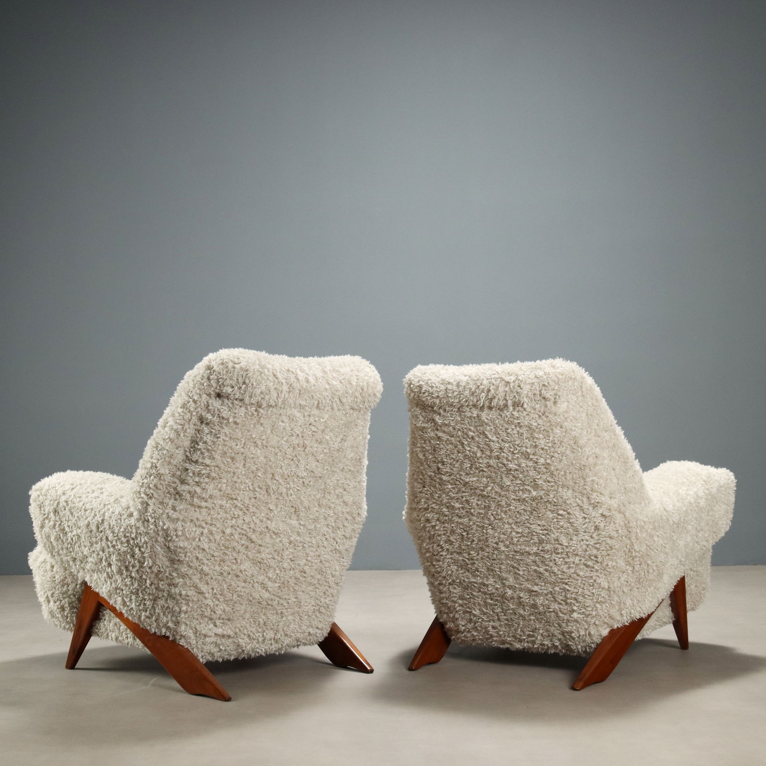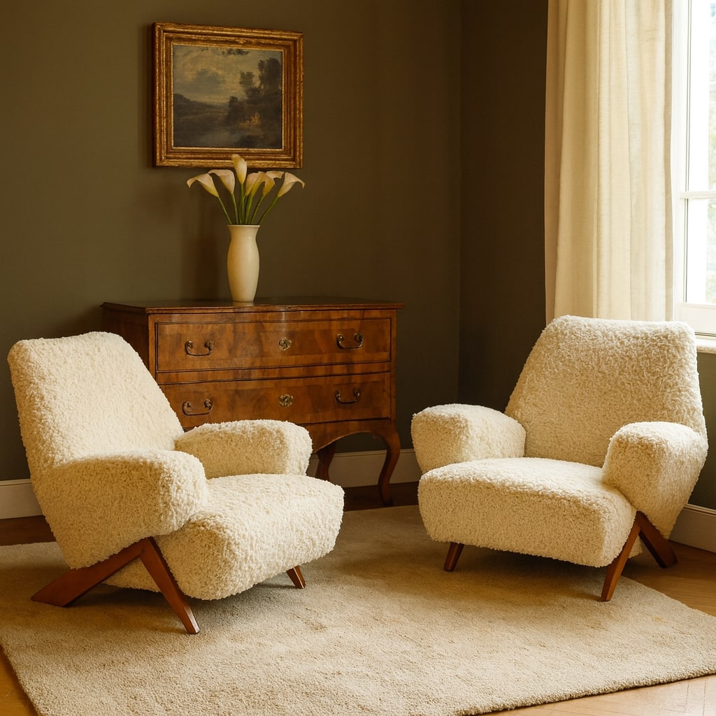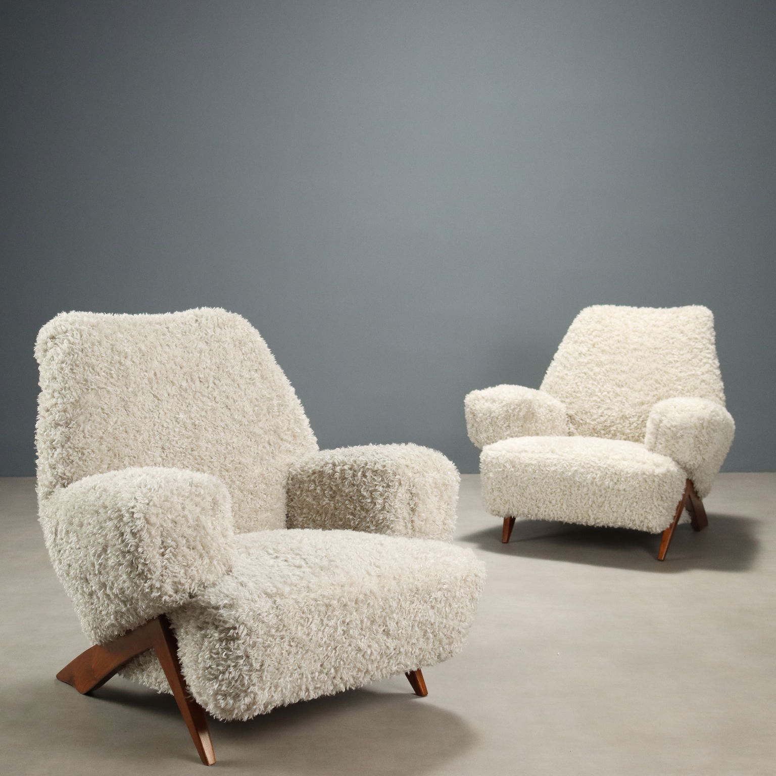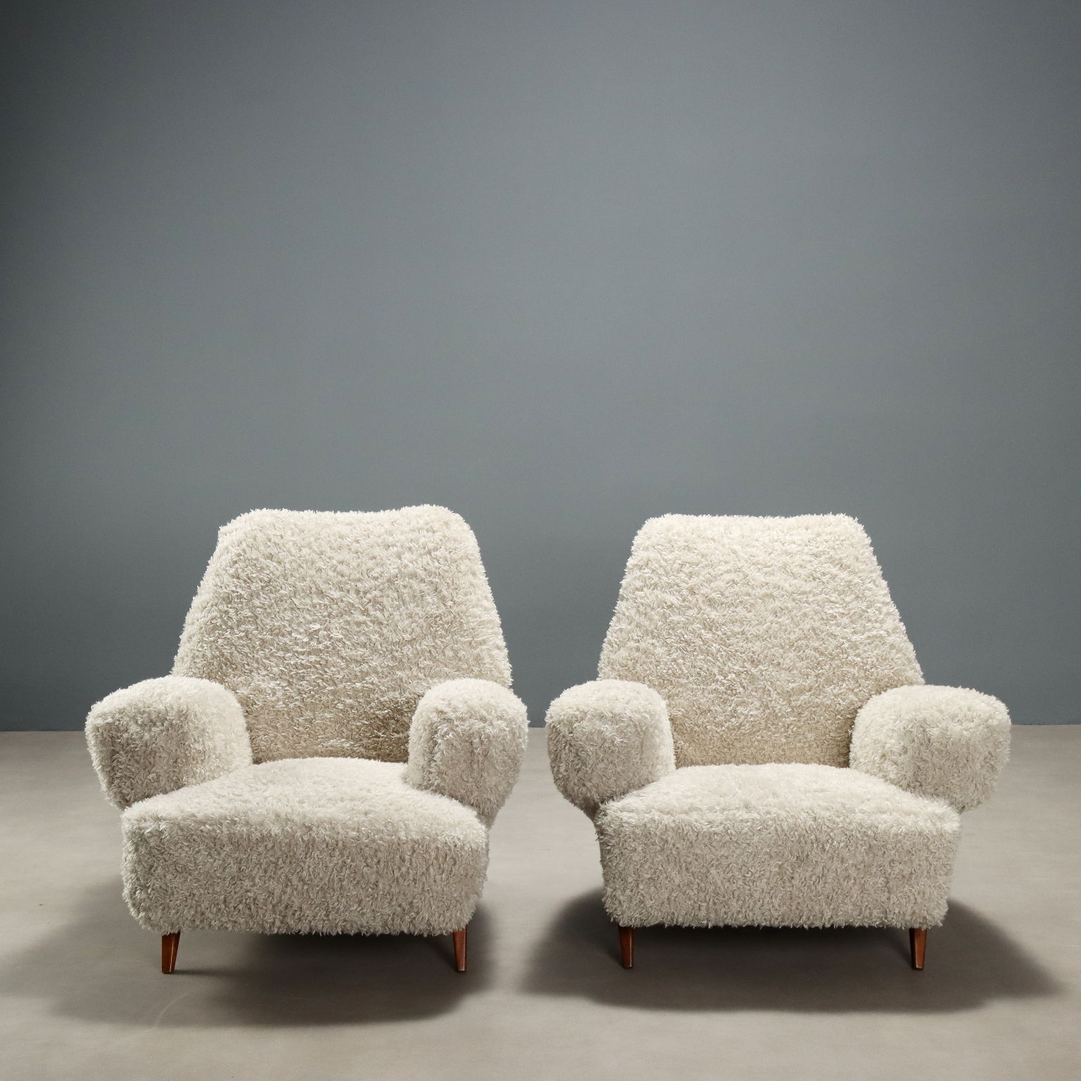 Coppia di poltrone vintage con gambe in legno di faggio tinto, imbottitura a molle, rivestimento nuovo in tessuto sintetico a pelo lungo nei toni del bianco.