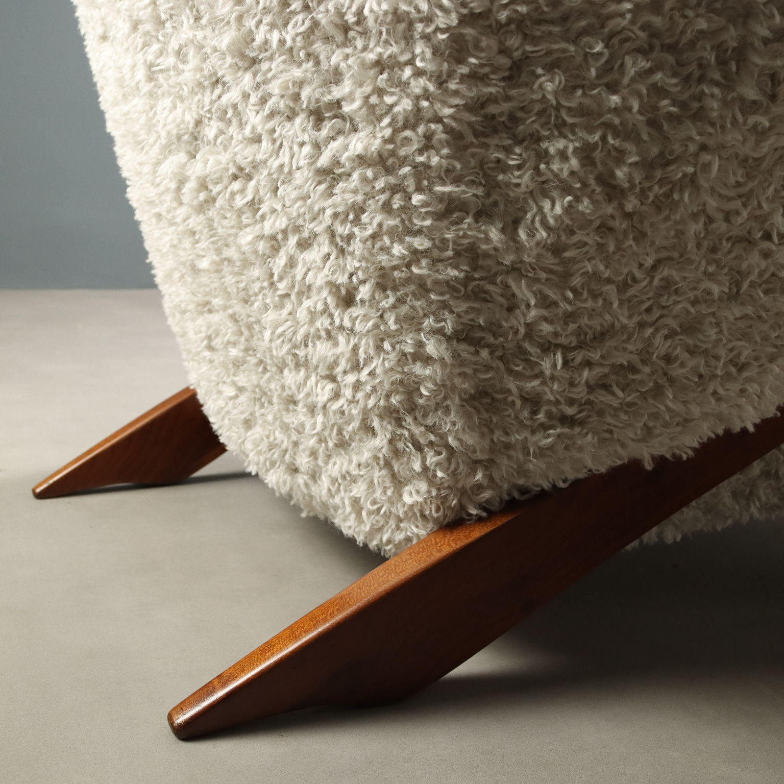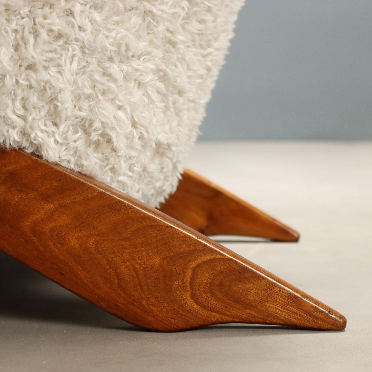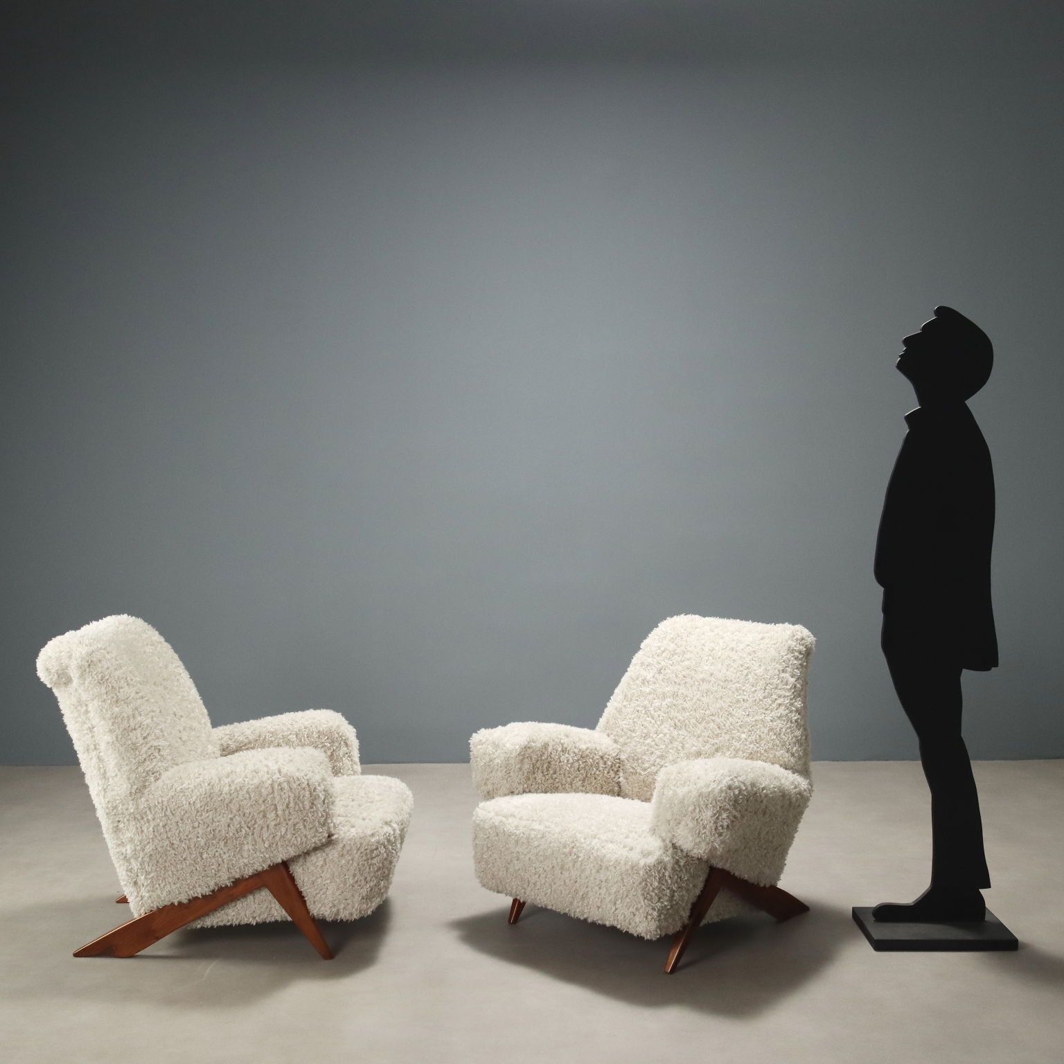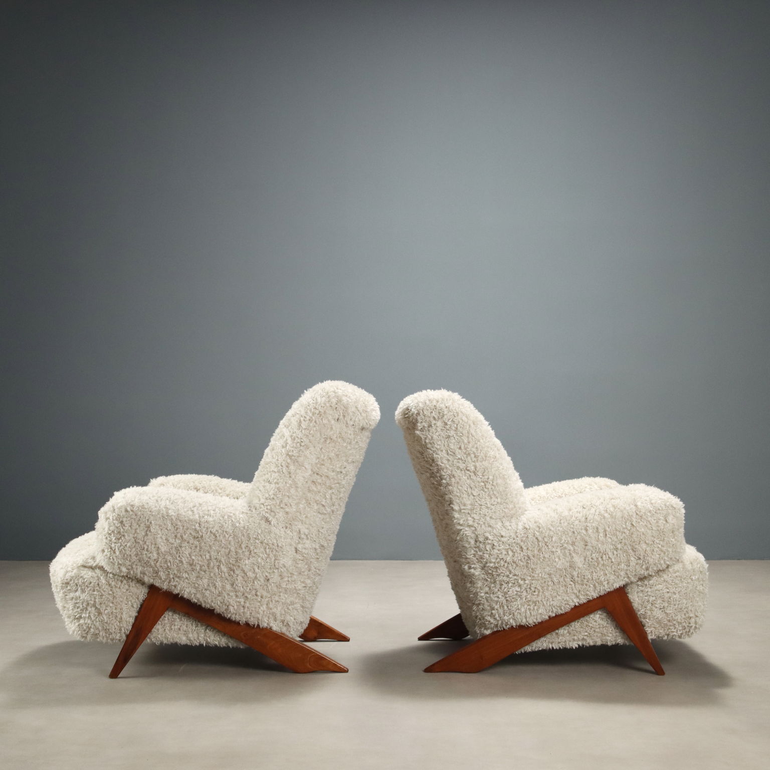 Coppia di poltrone vintage con gambe in legno di faggio tinto, imbottitura a molle, rivestimento nuovo in tessuto sintetico a pelo lungo nei toni del bianco.