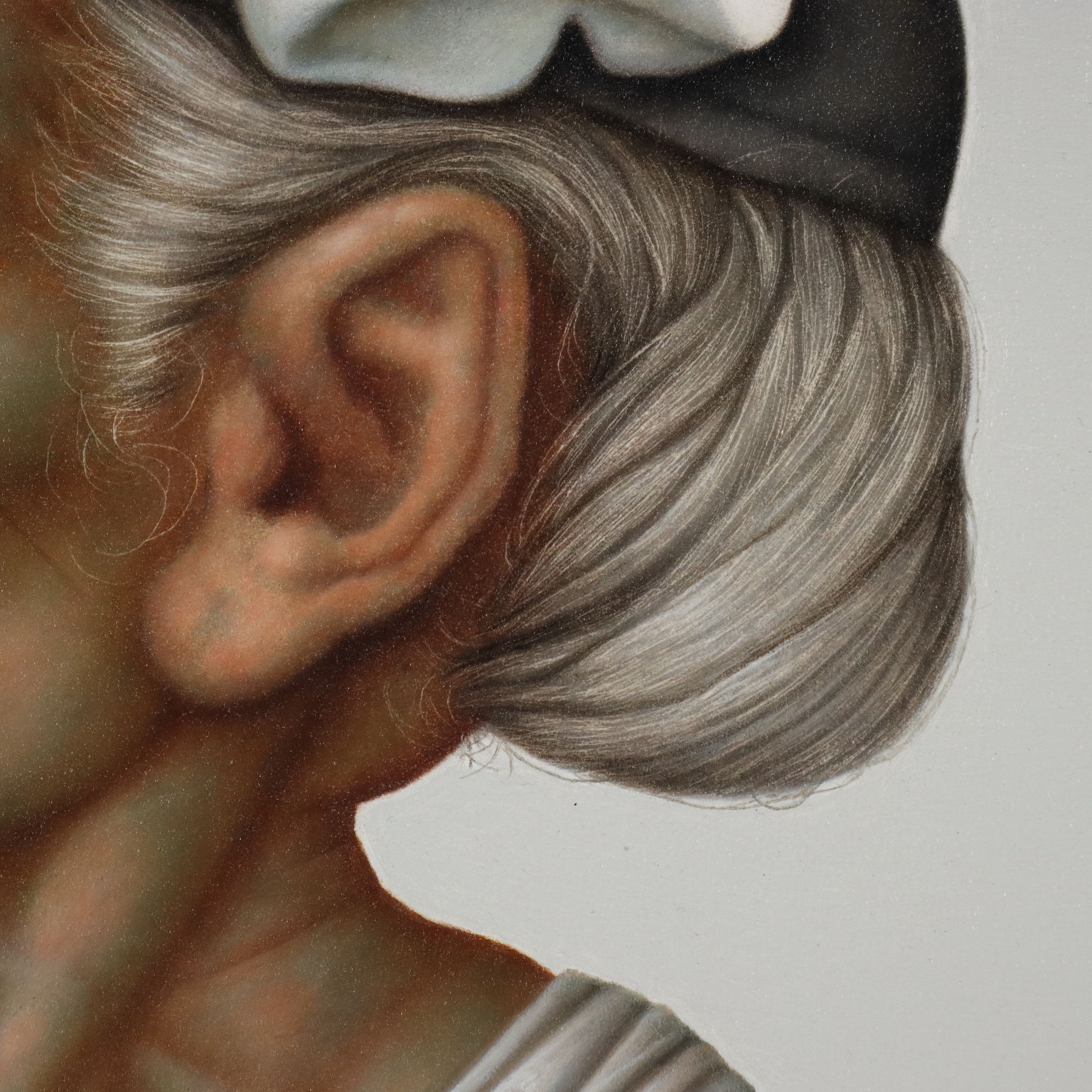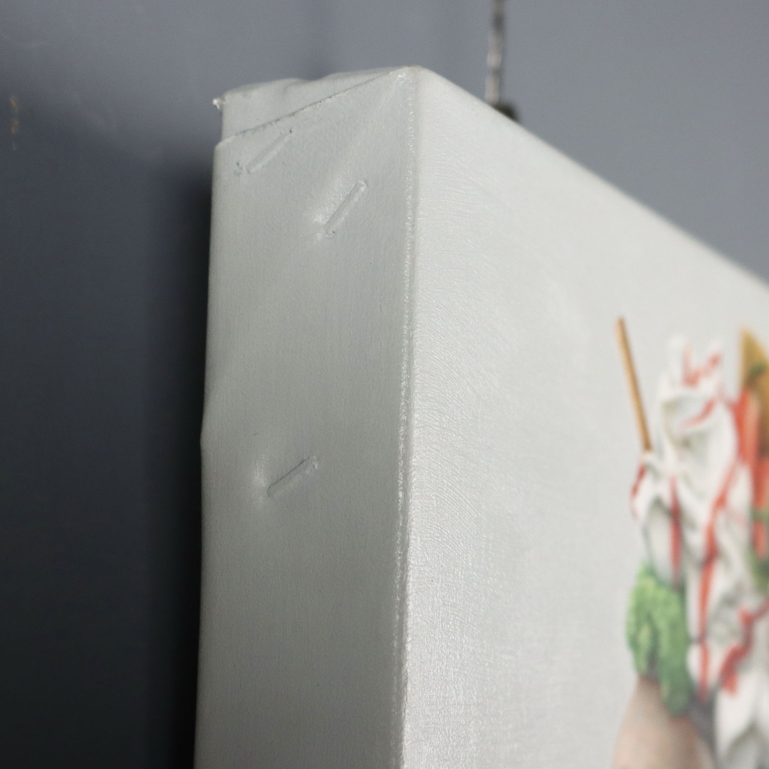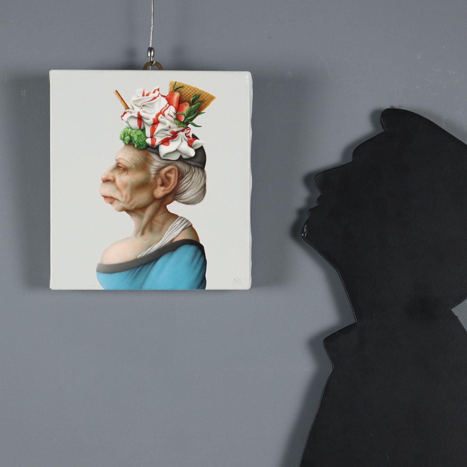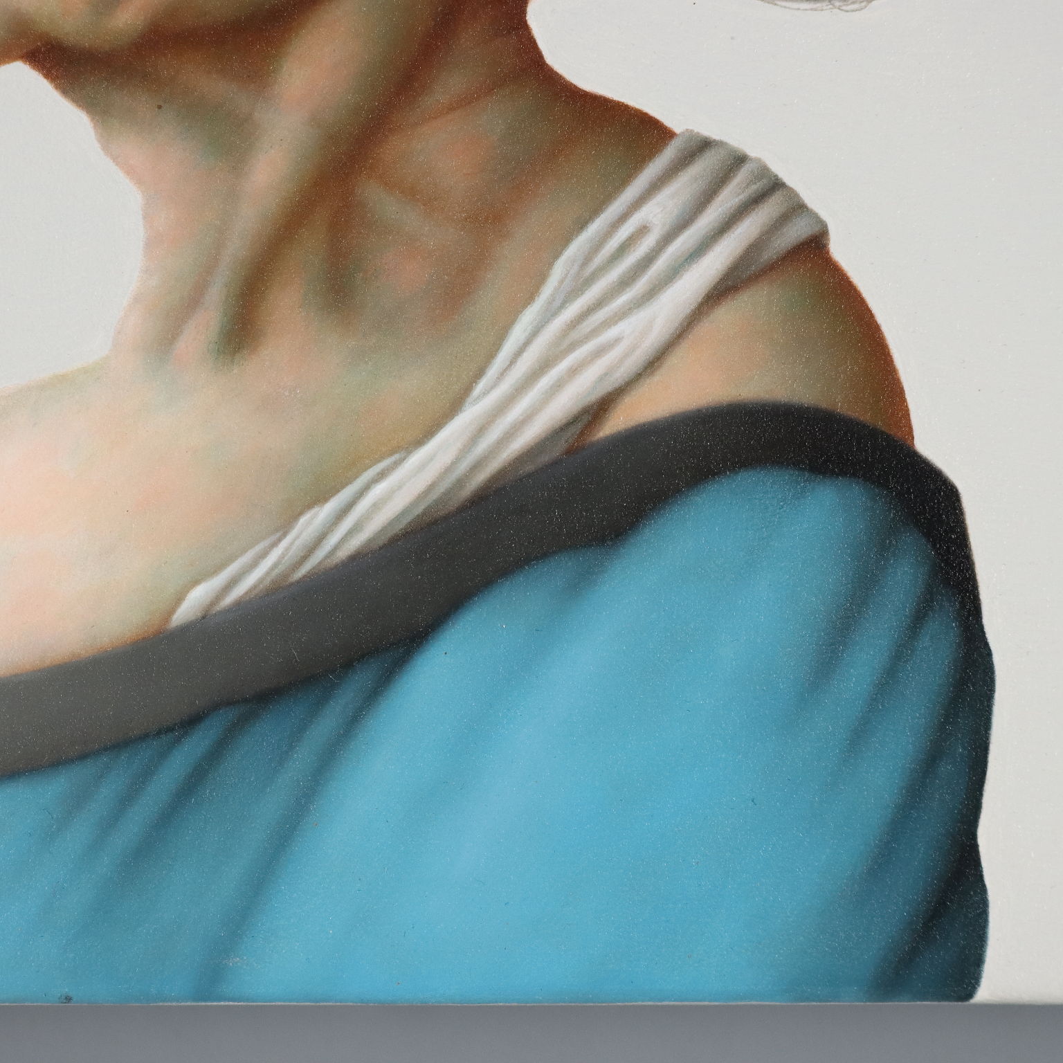Olio su tela . Firmato in basso a destra. Fabio D'Aroma è un artista dal percorso eclettico e sorprendente, la cui arte si distingue per l'incontro tra la tradizione pittorica classica e l'approccio contemporaneo. Del suo stile pittorico, D'Aroma ha detto : "Mi piace definirlo una sorta di pop surrealismo con una base classica. Mi ispiro ai grandi maestri italiani, ma li reinterpreto con un'ironia che riflette il presente". Le sue figure, spesso dai tratti grotteschi, ma realizzate con una sorprendente tecnica pittorica, sono animate dalla volontà di provocare, suscitare spesso profonde riflessioni anche su temi importanti se non addirittura drammatici, ma con il sorriso.