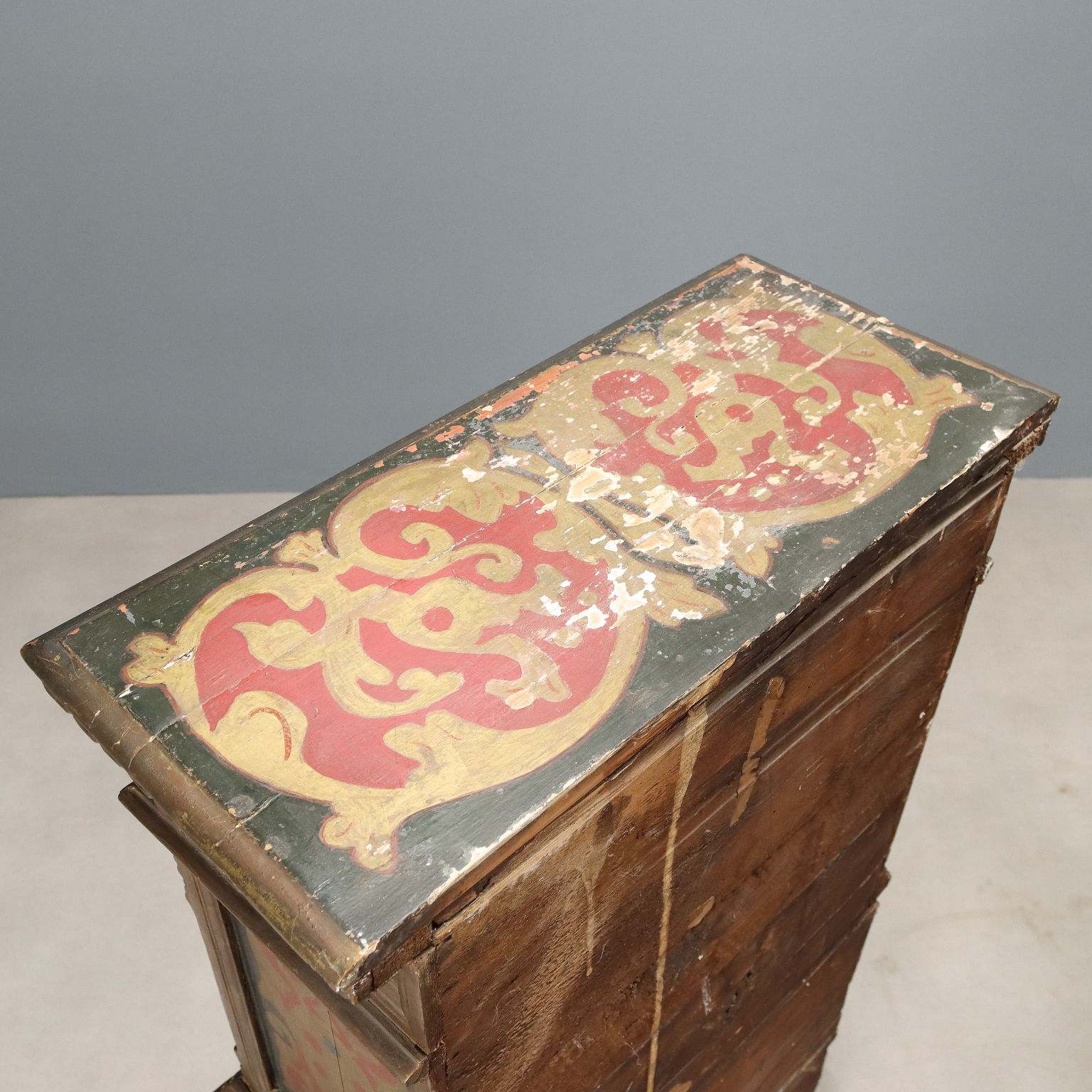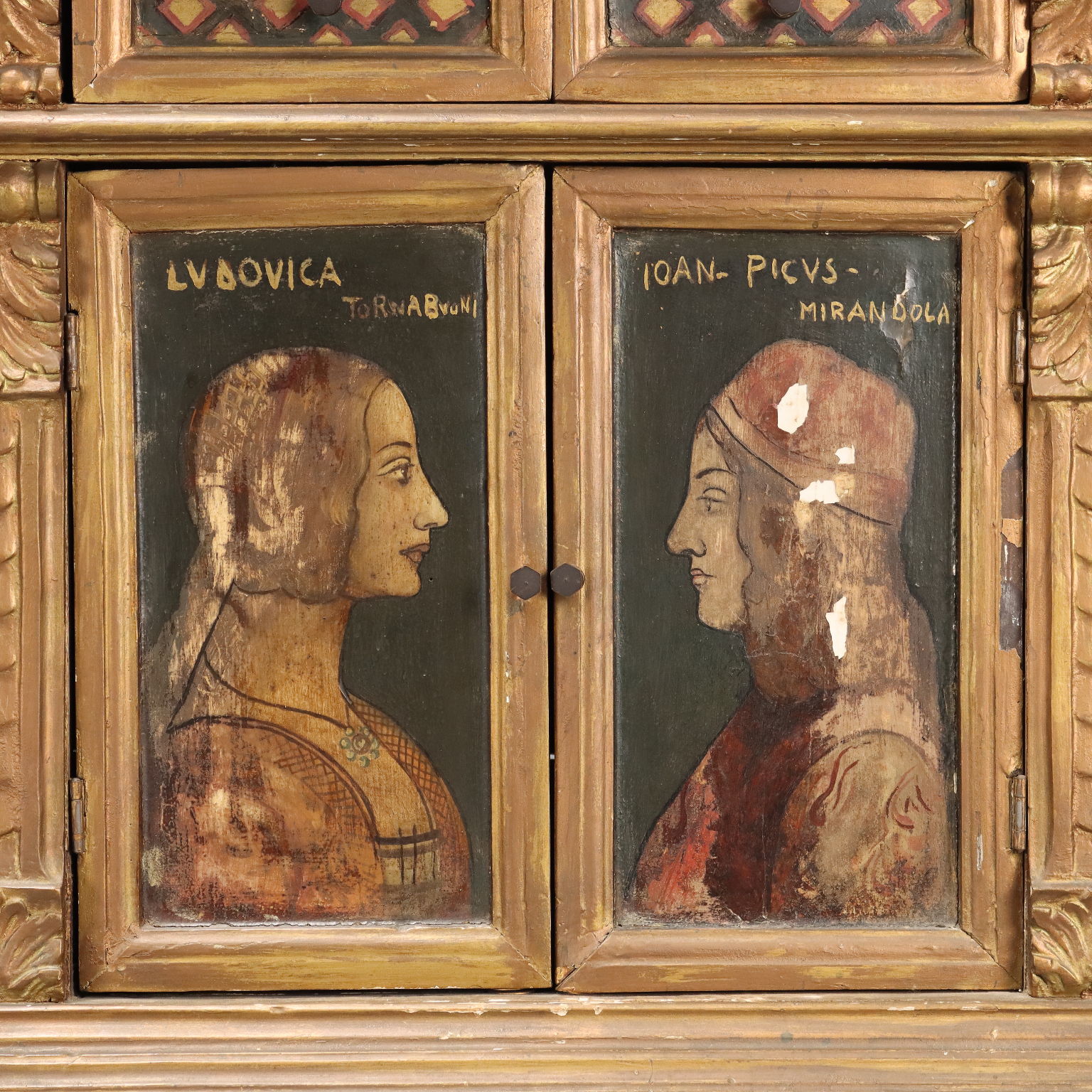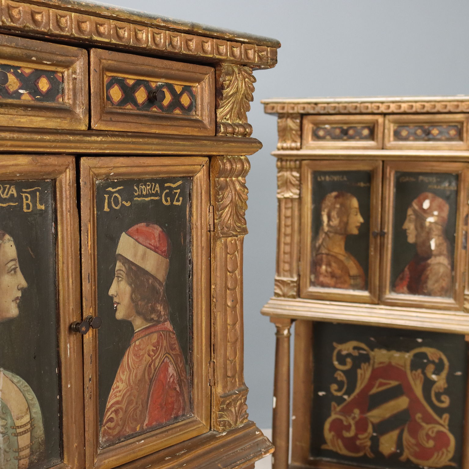 Coppia di piccoli stipi dipinti in stile rinascimentale agli inizi del '900. Retti da alte colonne con pannello dipinto sul fondo si presentano con due ante sul fronte. Sulle antine sono raffigurati profili di dame e cavalieri rinascimentale, su uno, gli Sforza, sull'altro Ludovica Tornabuoni e Ioan Picus Mirandola. Stemma mediceo sui fianchi e altri stemmi sul fono della base. Tutto dipinto in policromia e parte dorato, numerose cadute pittoriche.
