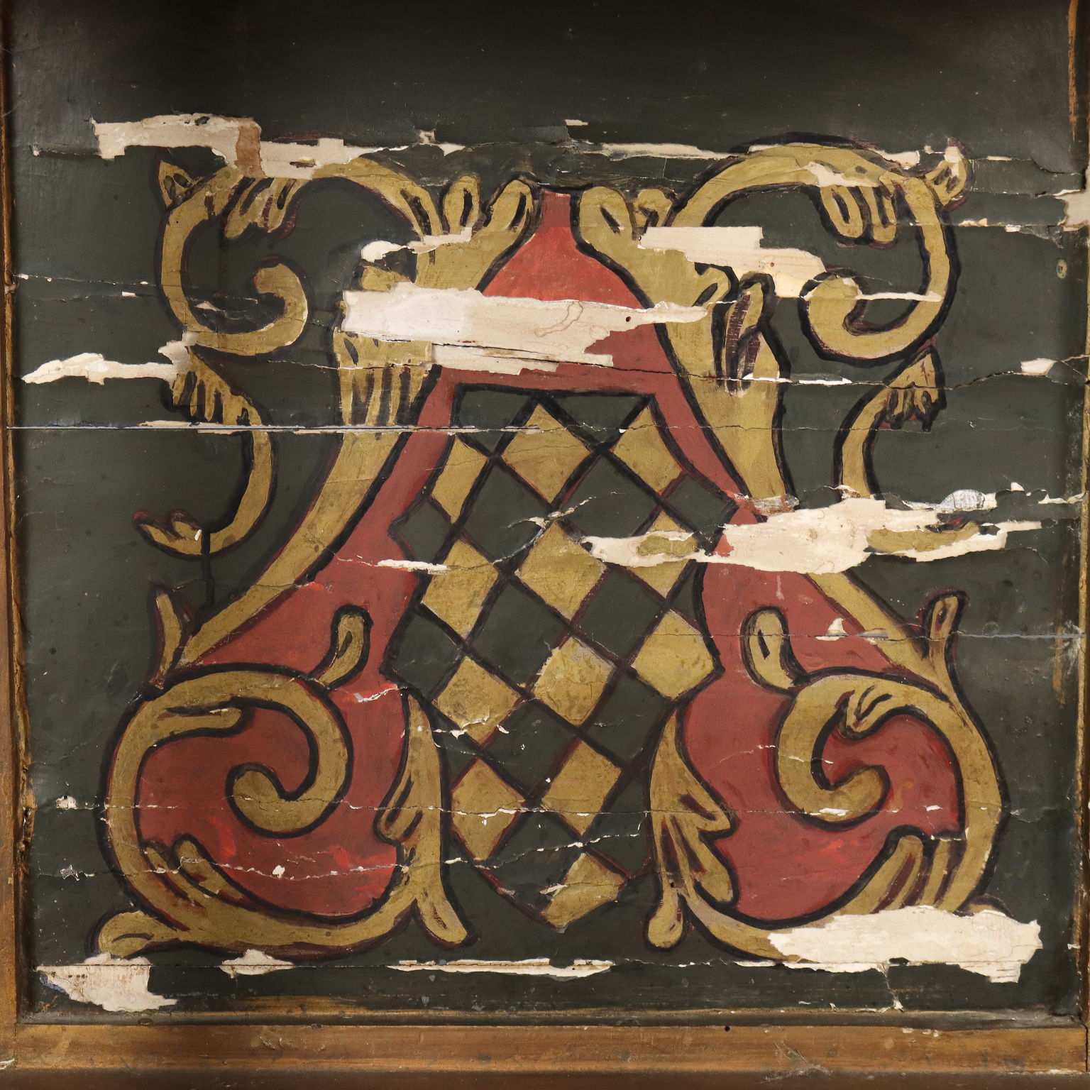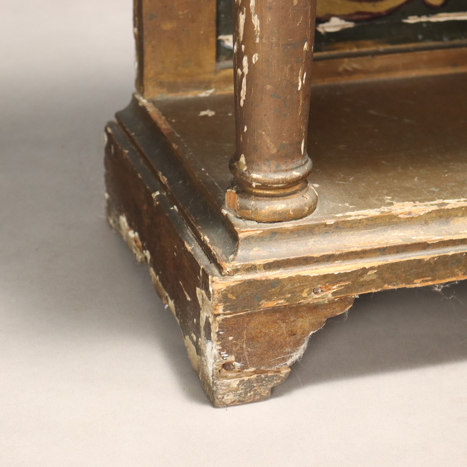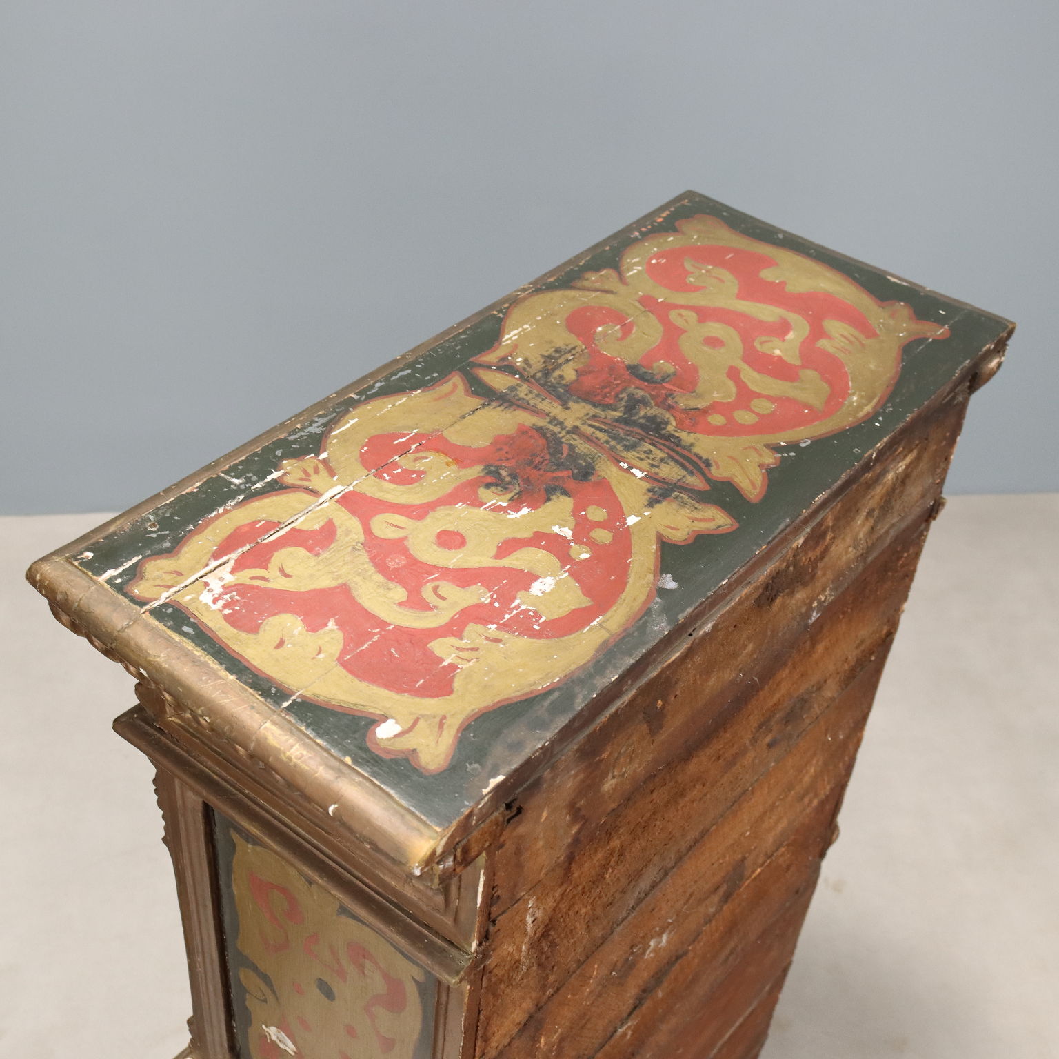 Coppia di piccoli stipi dipinti in stile rinascimentale agli inizi del '900. Retti da alte colonne con pannello dipinto sul fondo si presentano con due ante sul fronte. Sulle antine sono raffigurati profili di dame e cavalieri rinascimentale, su uno, gli Sforza, sull'altro Ludovica Tornabuoni e Ioan Picus Mirandola. Stemma mediceo sui fianchi e altri stemmi sul fono della base. Tutto dipinto in policromia e parte dorato, numerose cadute pittoriche.