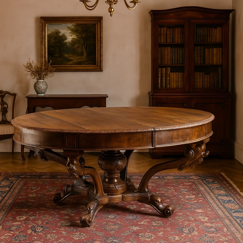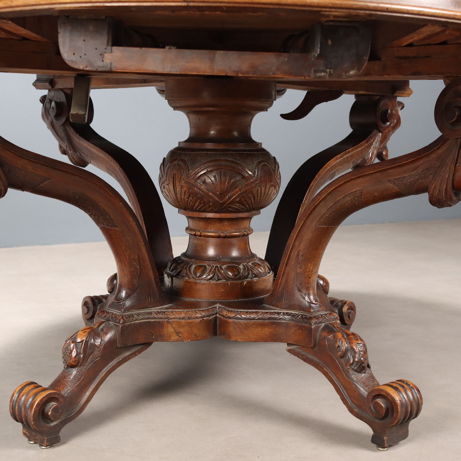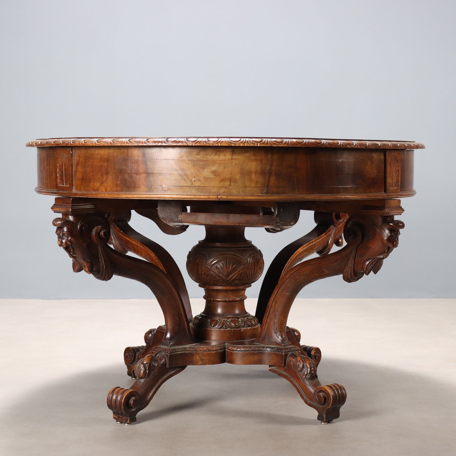 Tavolo a cestello in noce, allungabile. Piano ovale poggiante su gamba centrale tornita e intagliata, altre quattro gambe mosse con intagli a mascheroni, piedi a ricciolo. Presenti due prolunghe. Genova, XIX Secolo.
