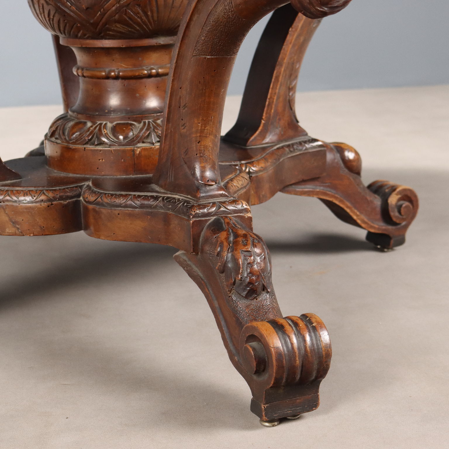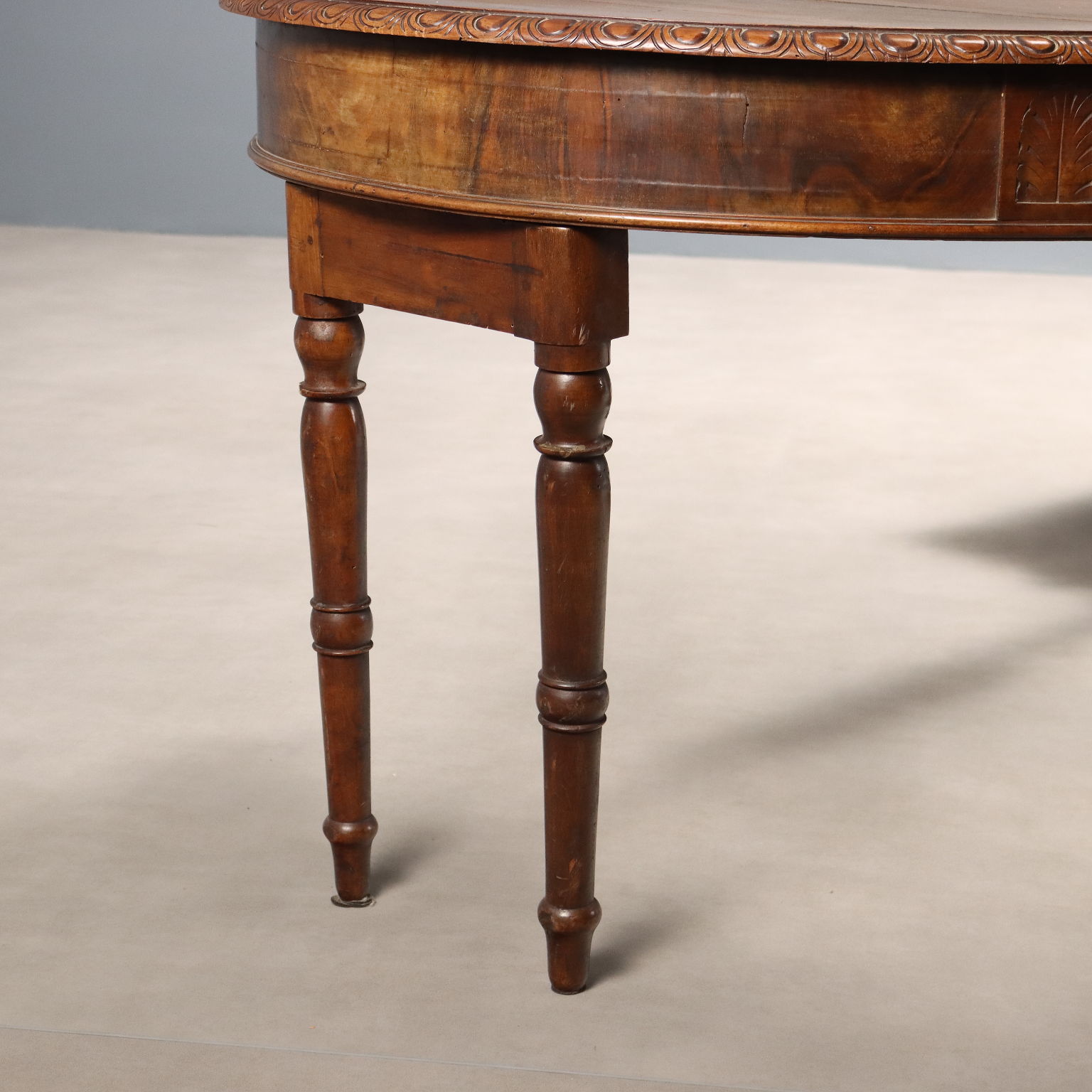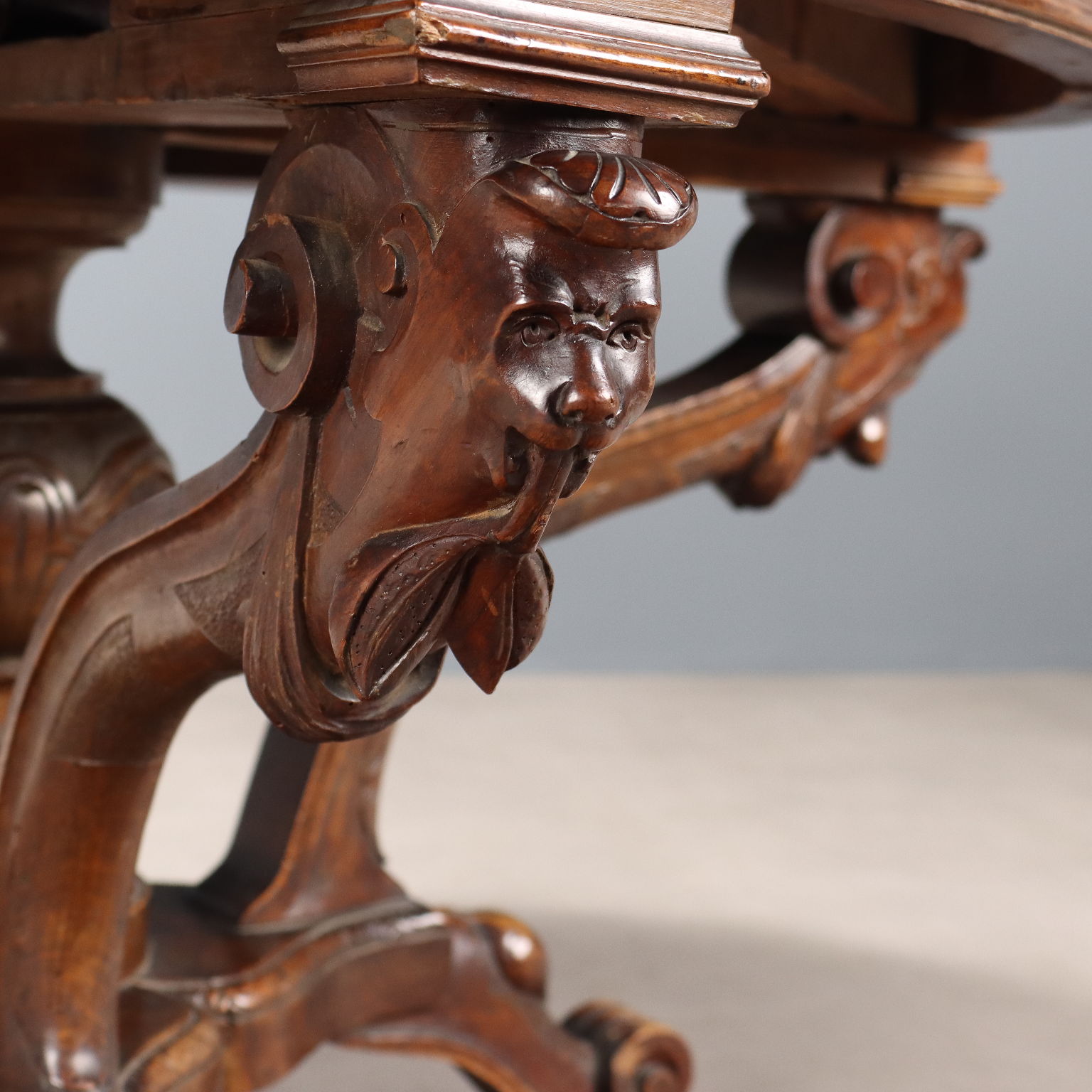 Tavolo a cestello in noce, allungabile. Piano ovale poggiante su gamba centrale tornita e intagliata, altre quattro gambe mosse con intagli a mascheroni, piedi a ricciolo. Presenti due prolunghe. Genova, XIX Secolo.