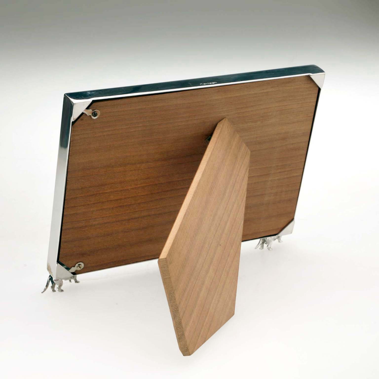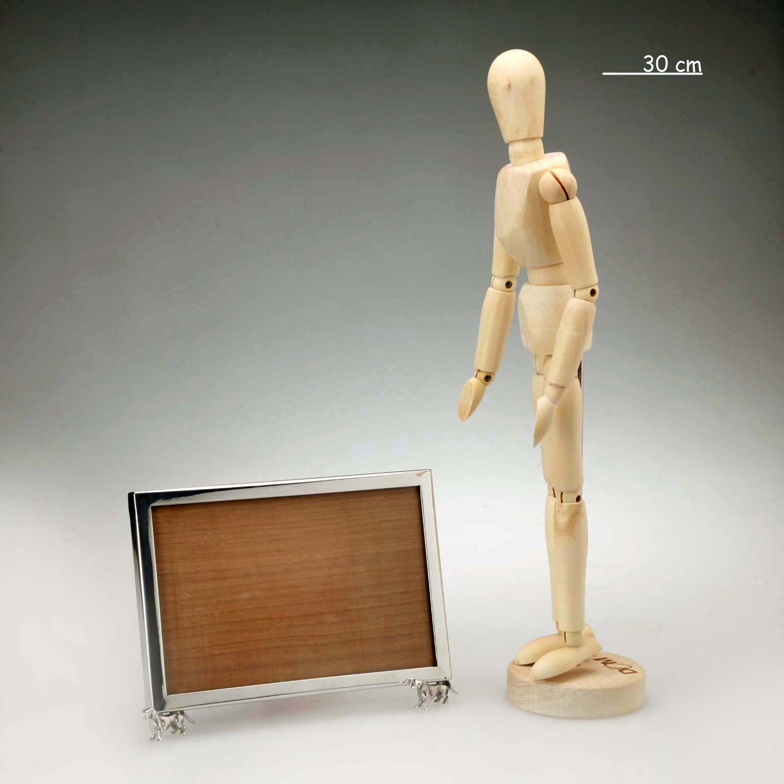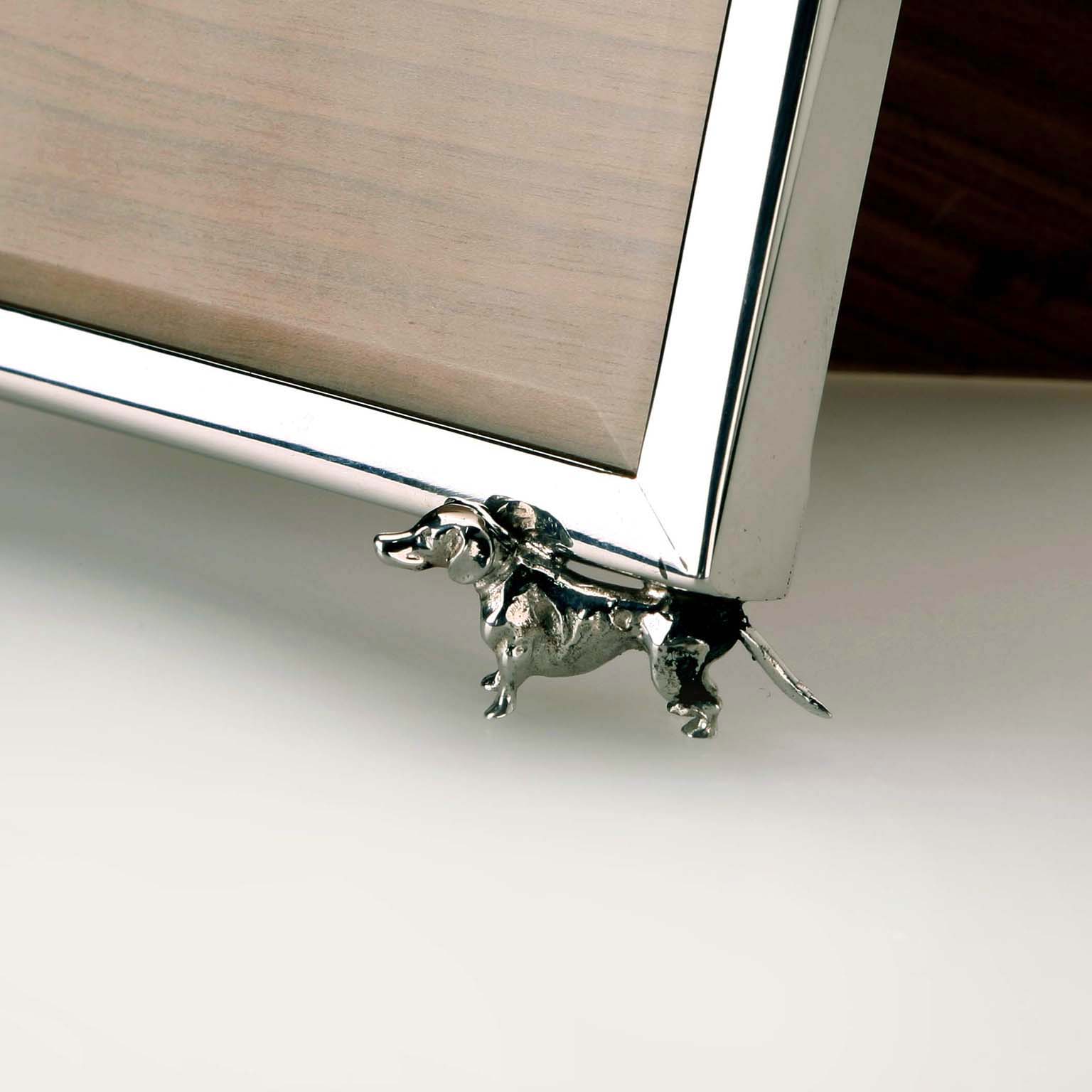 Cornice portafoto orizzontale in argento retta da coppia di cani bassotto. Marchi dell'argento e dell'argentiere incussi sulla cornice. Grammi 80.