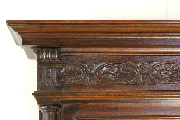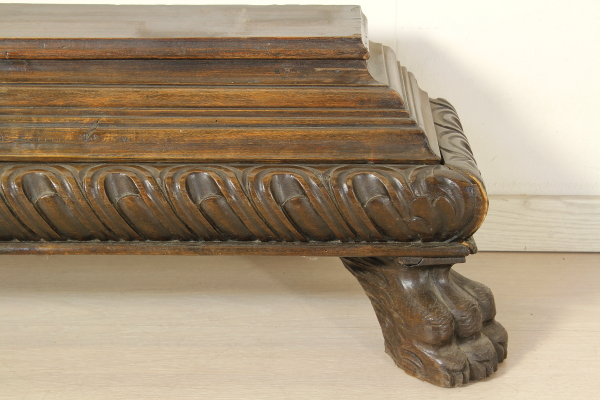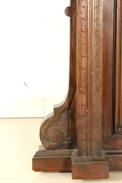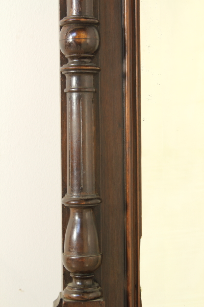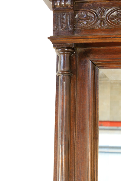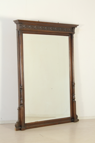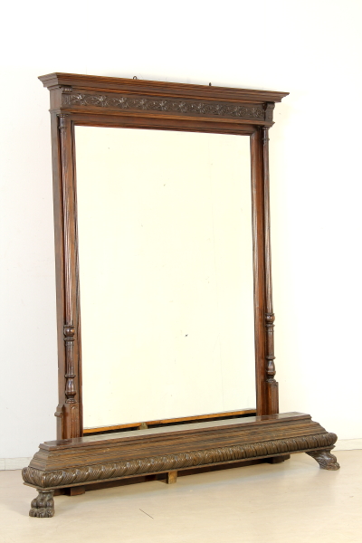 Specchiera da ingresso retta da basamento intagliato con piedi ferini, presenta montanti con mezze colonne e fascia a cappello intagliata. Specchio bisellato.