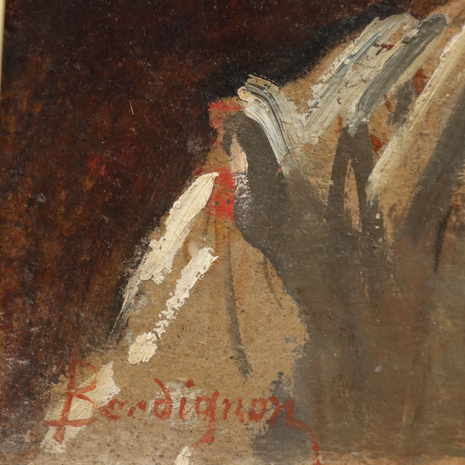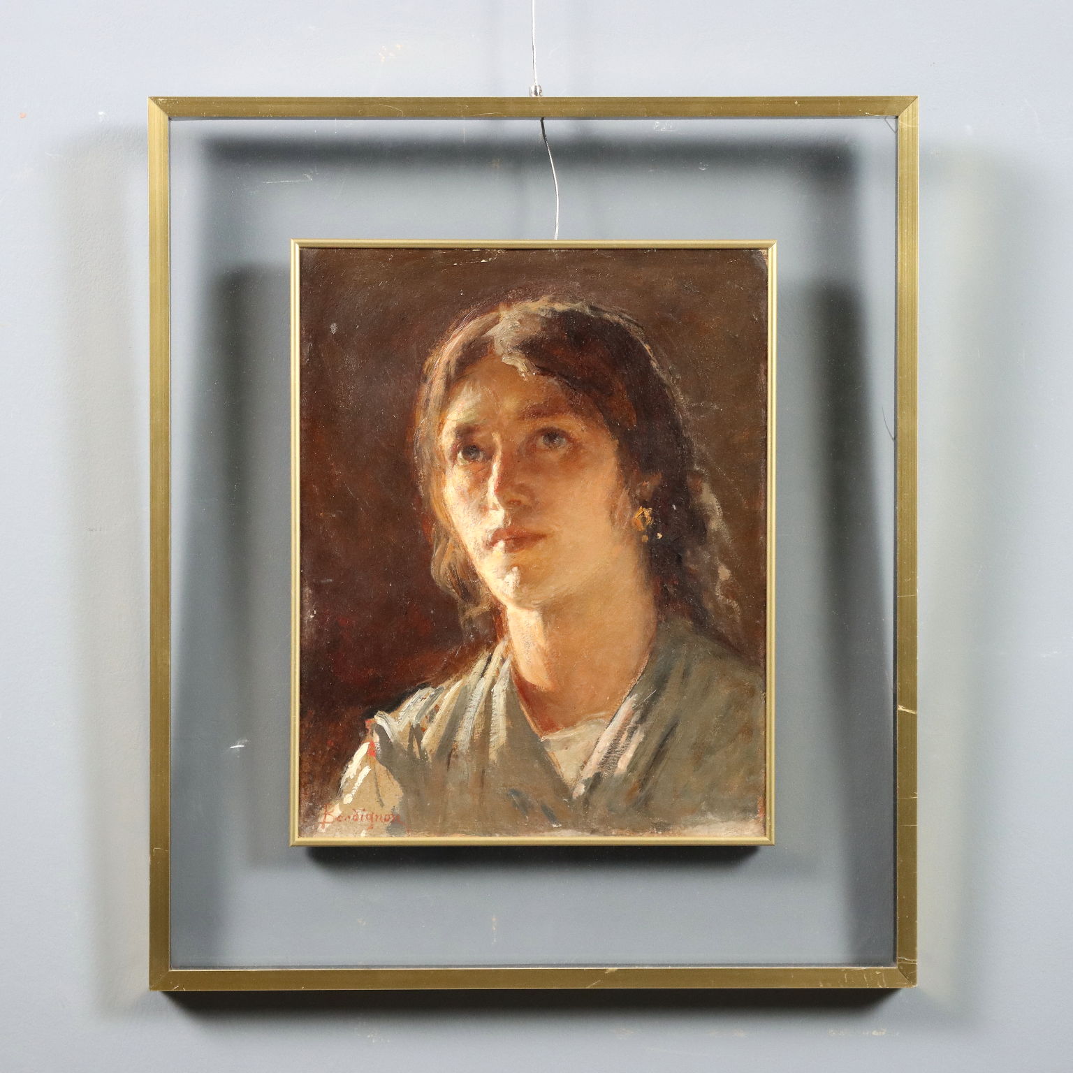 Olio su cartone. Firmato in basso a sinistra. Noè Bordignon, artista della provincia di Treviso, si dedicò sia alla pittura di cavalletto, realizzando scene di vita rurale e ritratti di figure popolari, con grande resa psicologica di alcuni significativi personaggi dell'epoca e in particolare per le figure di bambini, adolescenti, madri, sia all' attività di affrescatore di soggetti sacri per le chiese del suo territorio. In quest' opera Bordignon ritrae una giovane popolana, realizzando un ritratto di forte intensità espressiva, pur nella grande resa naturalistica della figura. Opera in cornice.