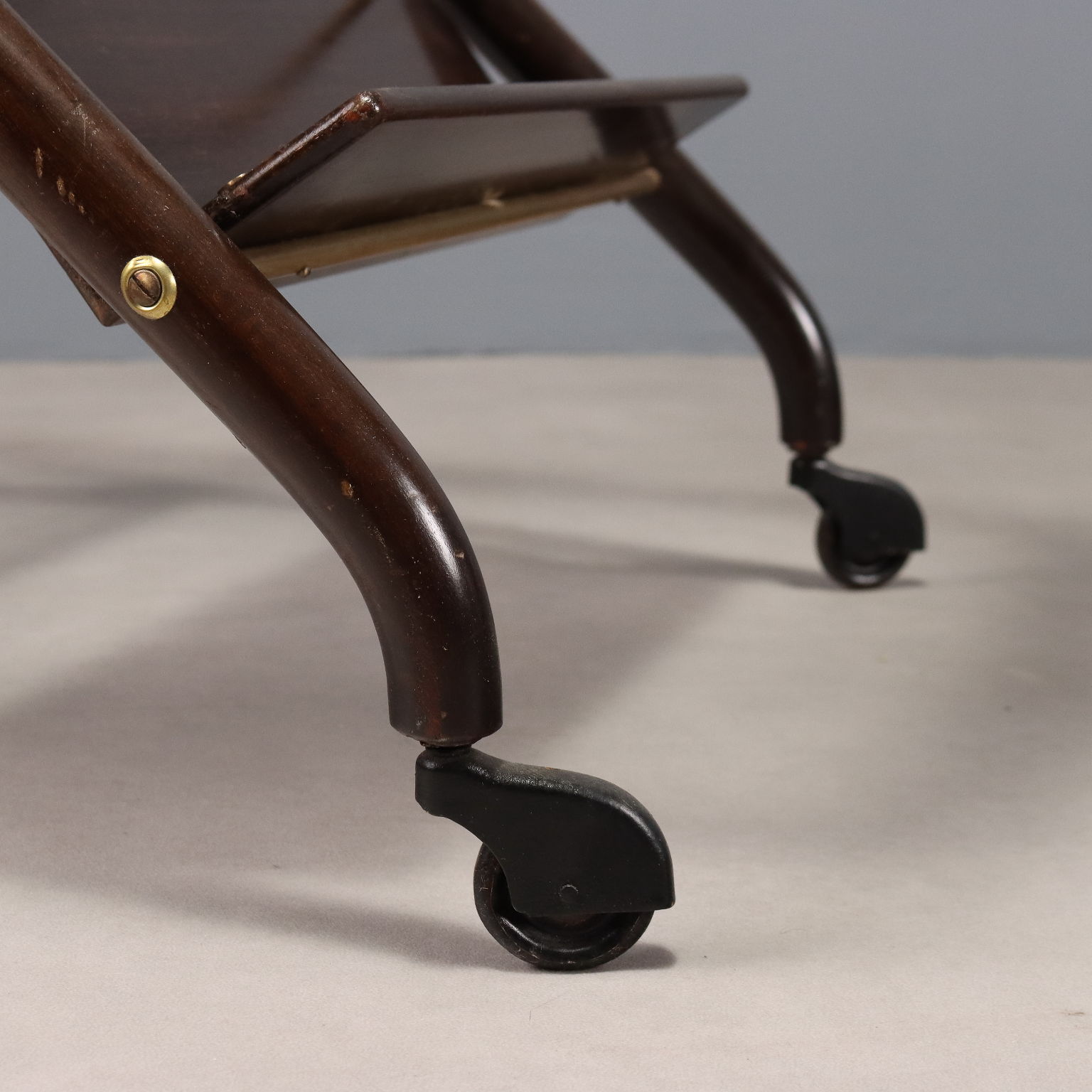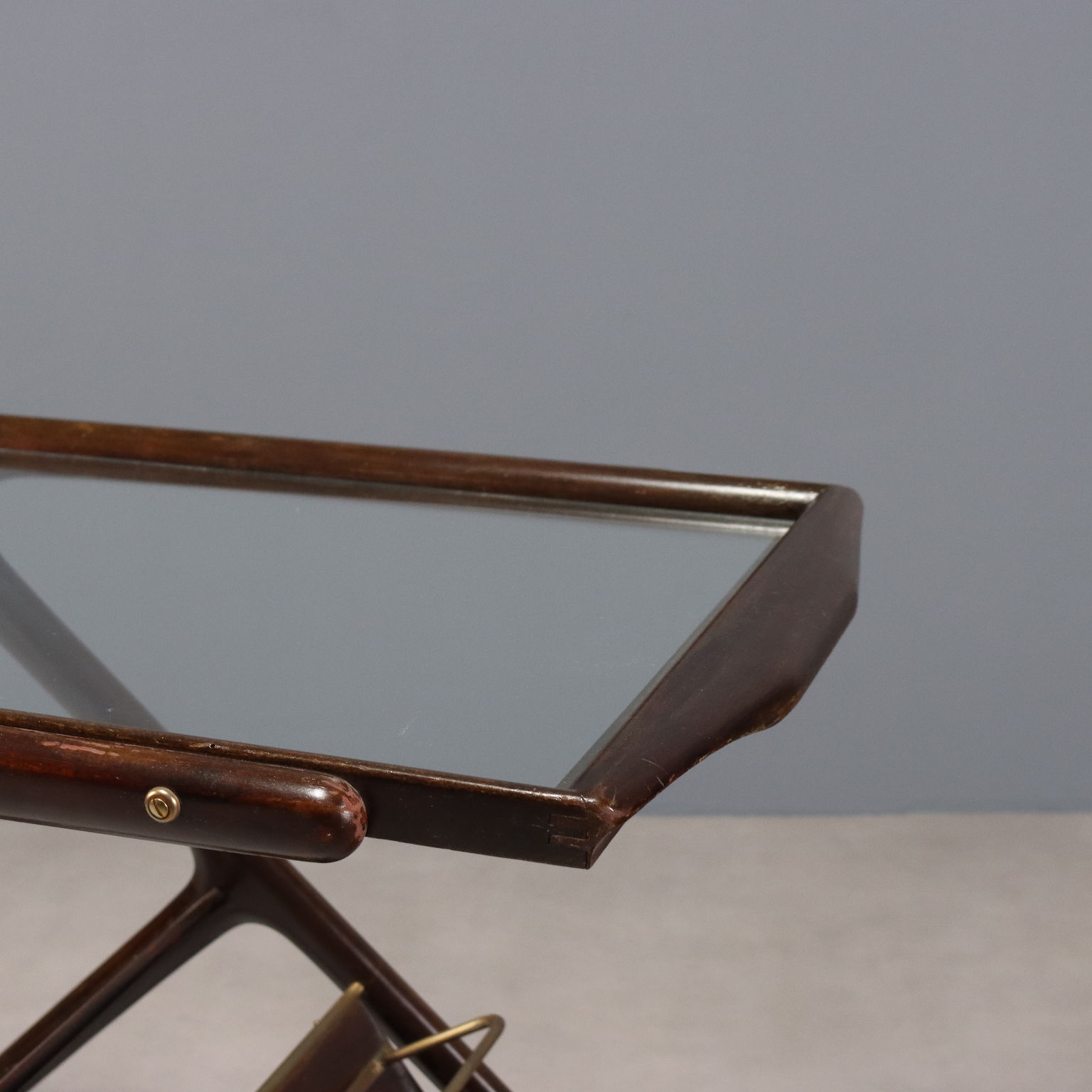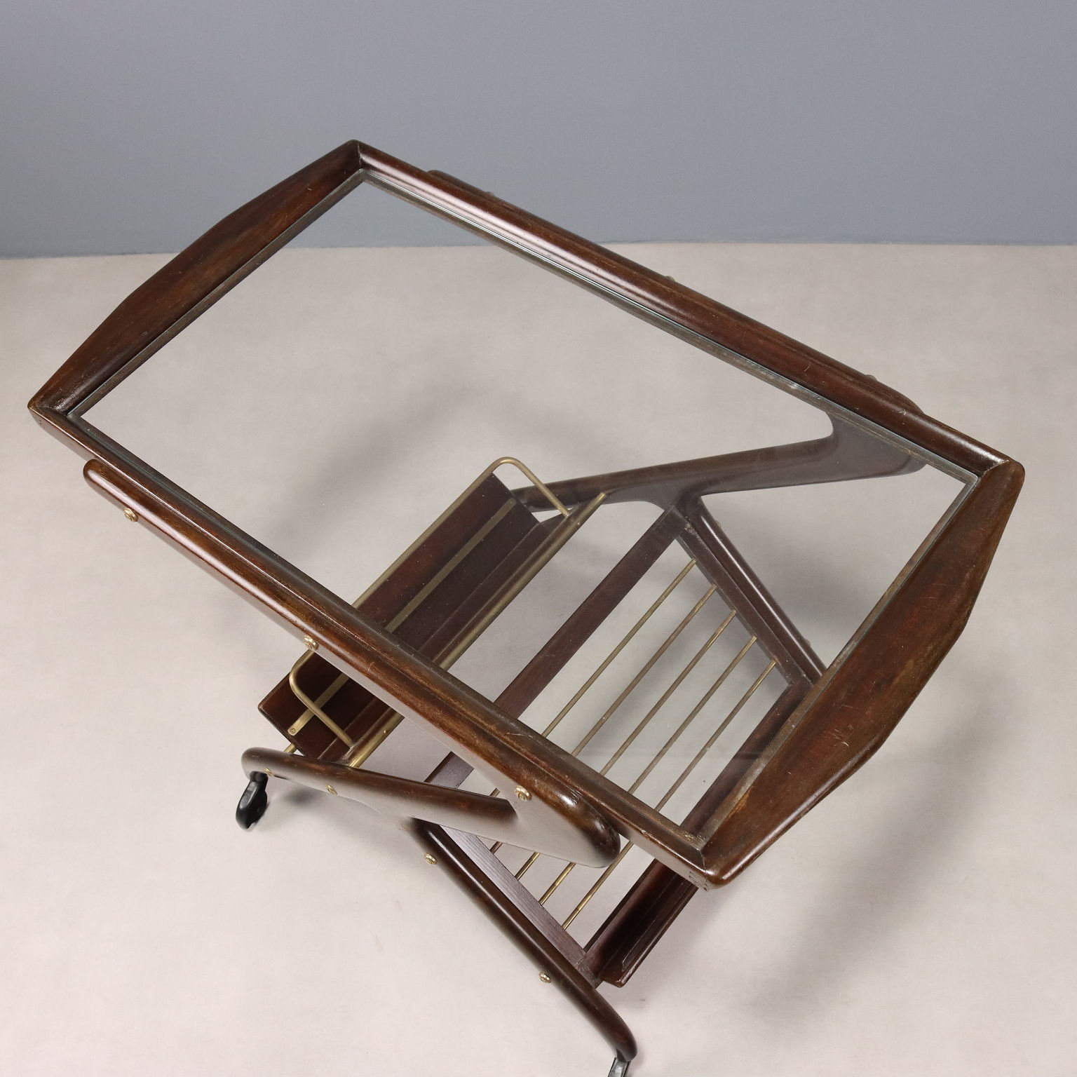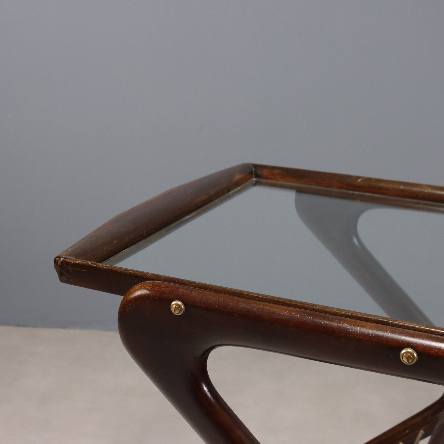 Carrellino di servizio con struttura in legno di faggio tinto, piano in vetro e rotelle.