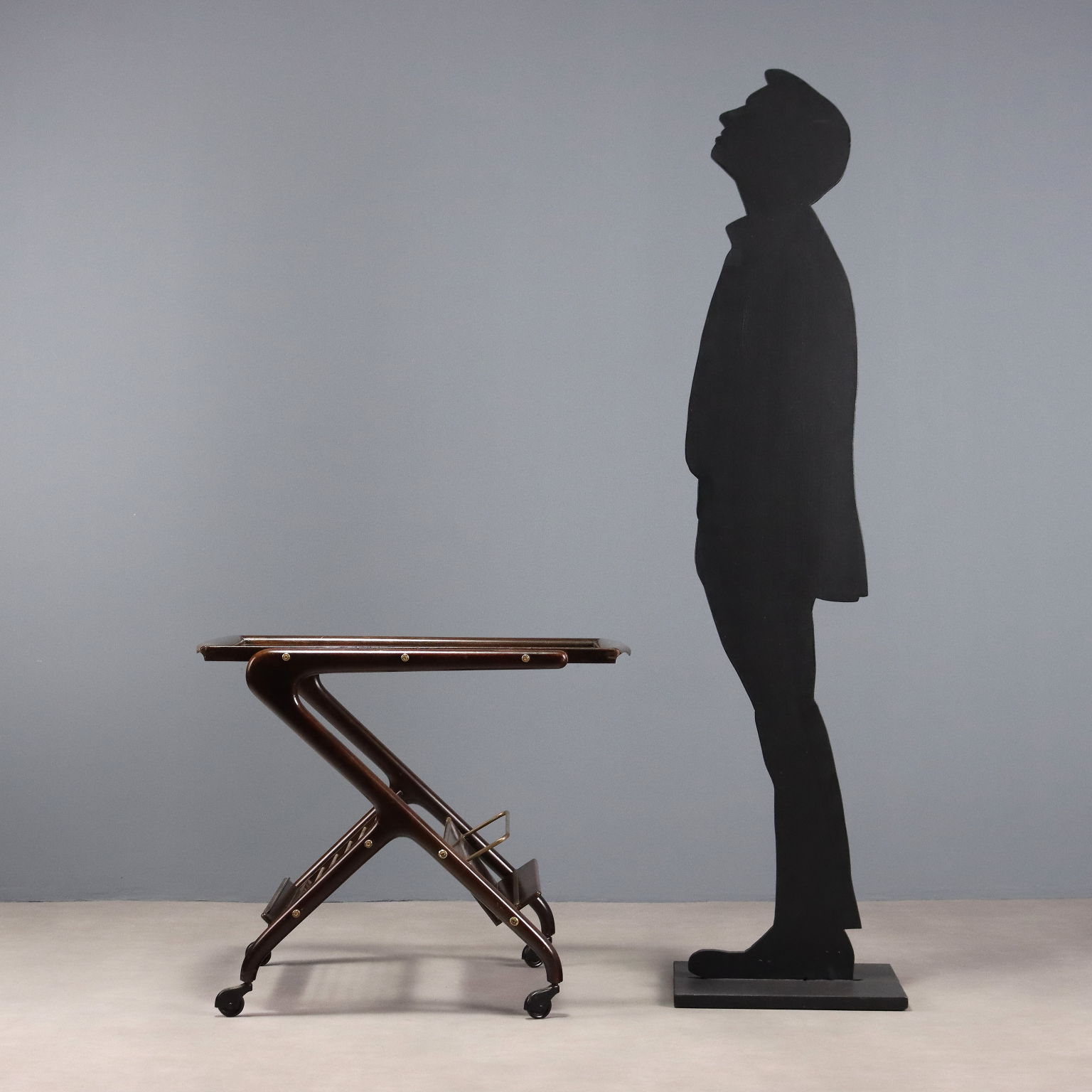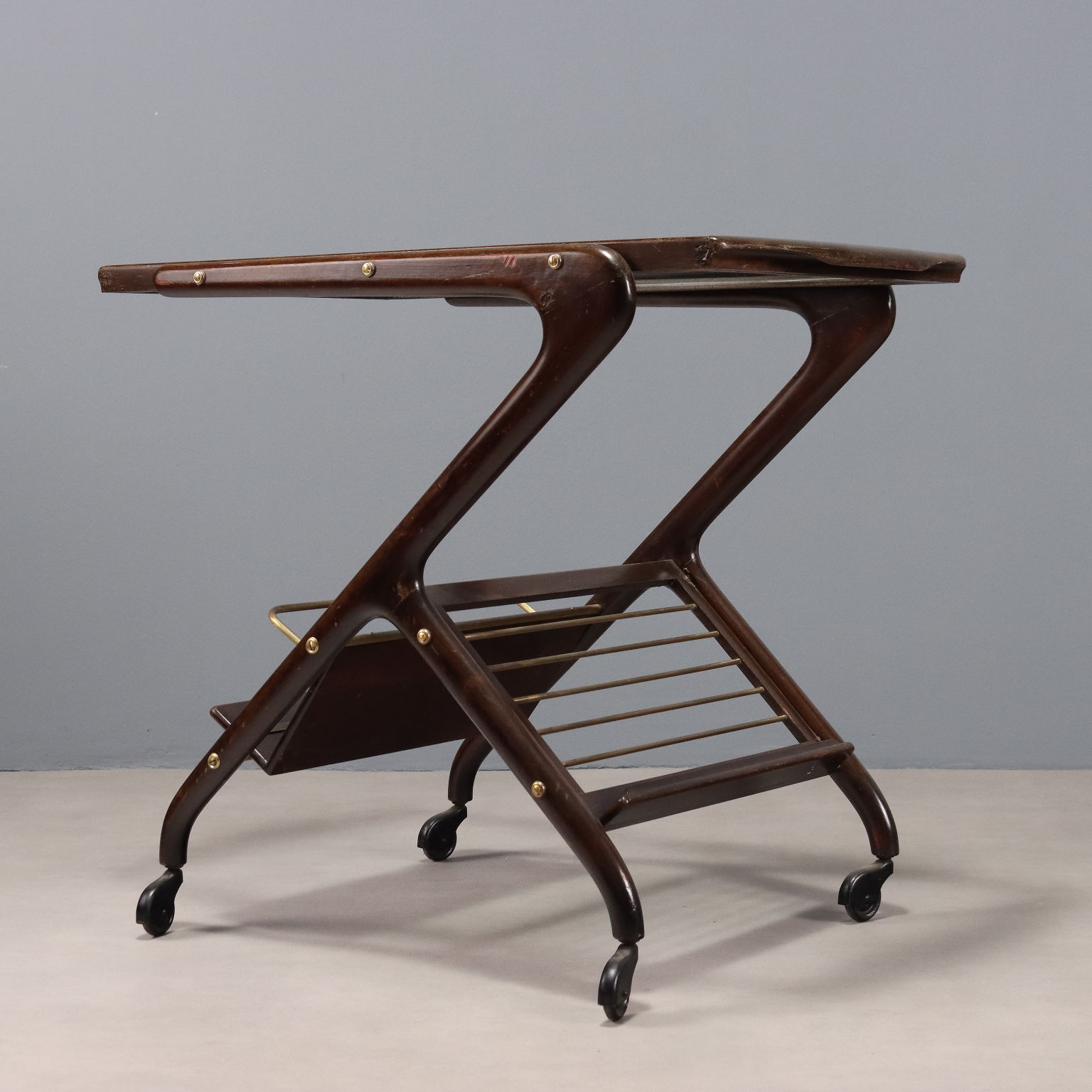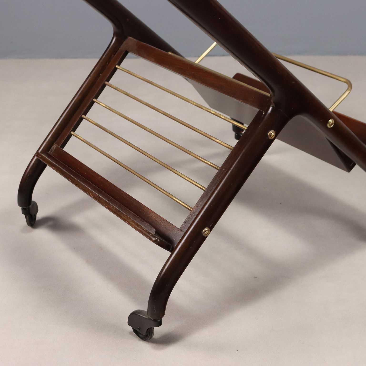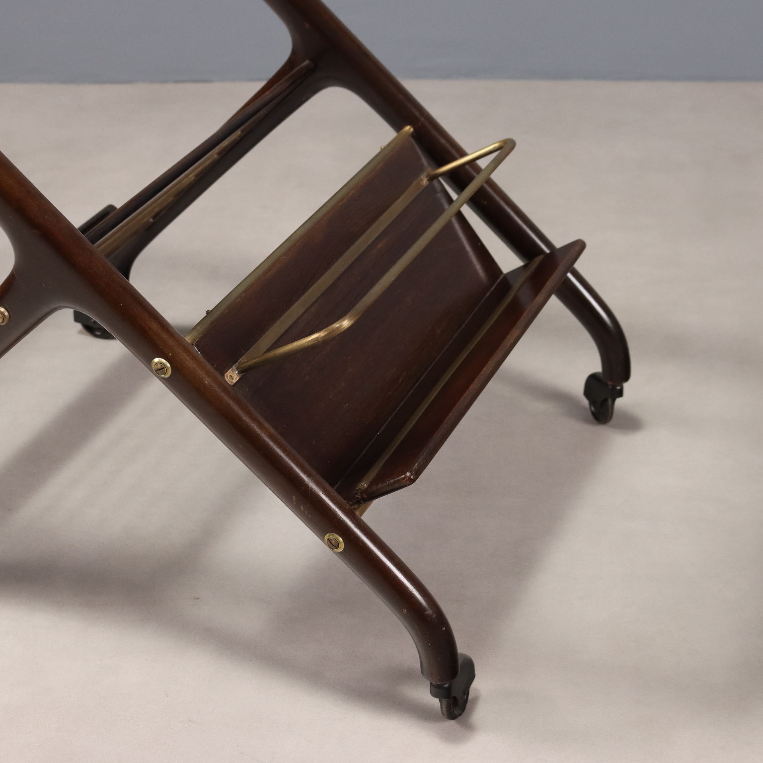 Carrellino di servizio con struttura in legno di faggio tinto, piano in vetro e rotelle.