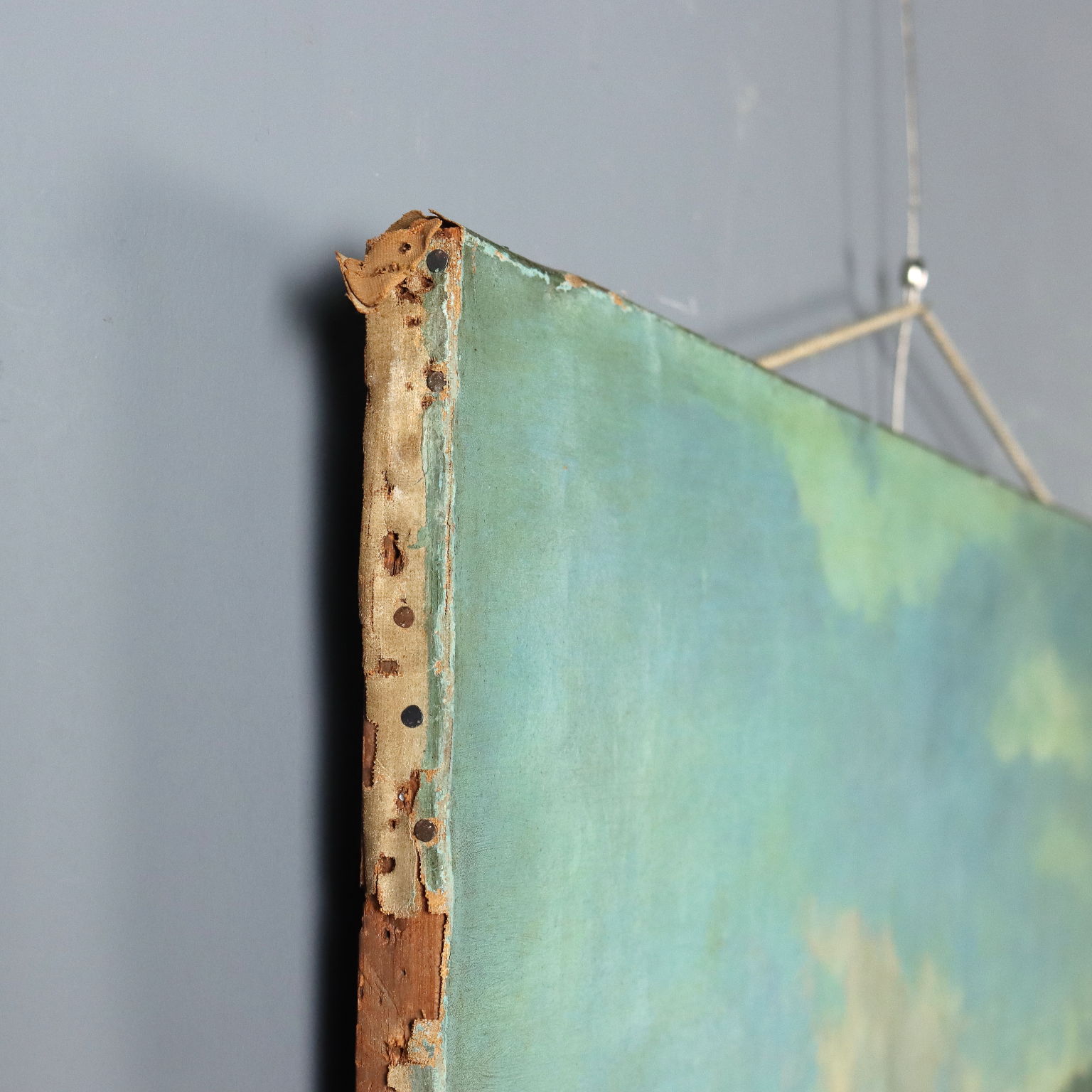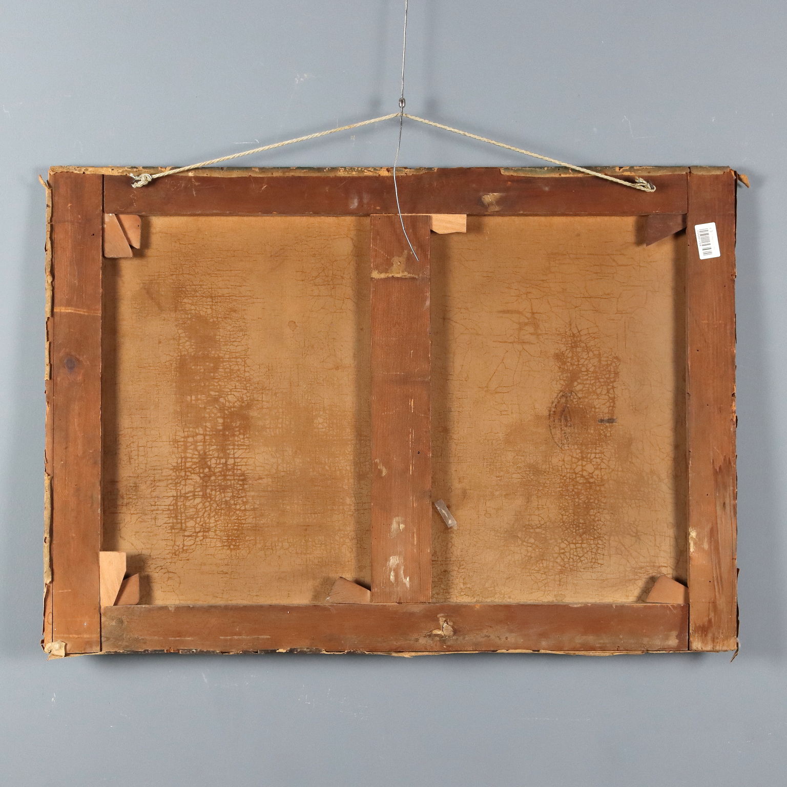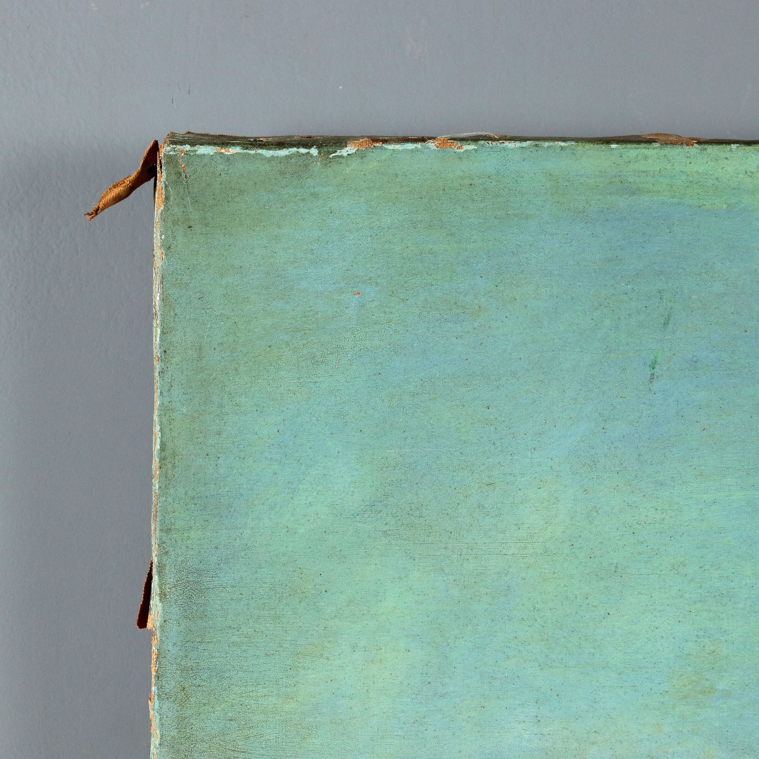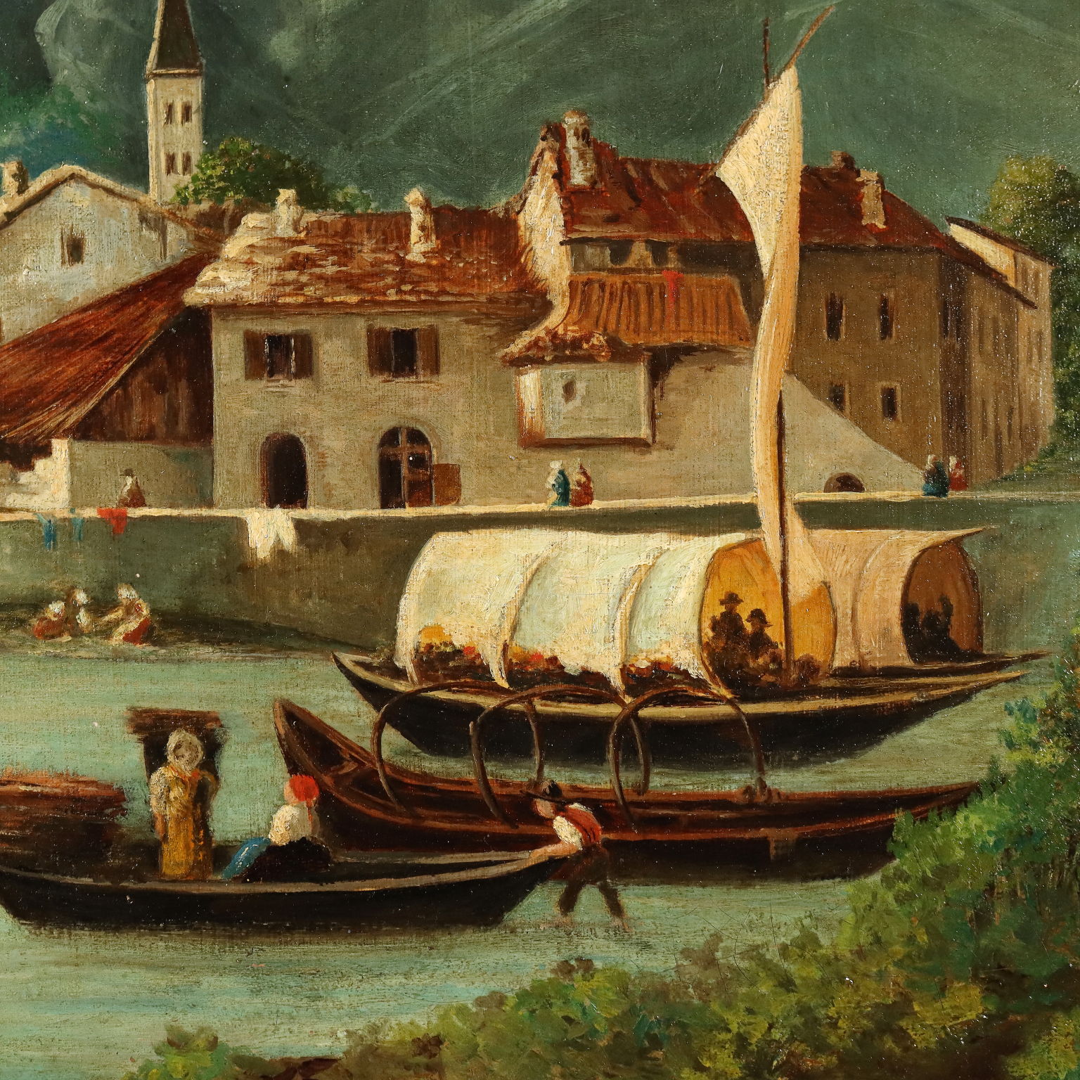 Olio su tela. Gradevole veduta del piccolo borgo di Omegna, della provincia del Verbano Cusio Ossola, che sorge all'estremità Settentrionale del Lago d'Orta; alle sue spalle le cime alpine. La vita del borgo ferve di attività, con molteplici figurine sia a terra che in navigazione su barchette. Il dipinto presenta al retro traccia di restauro.