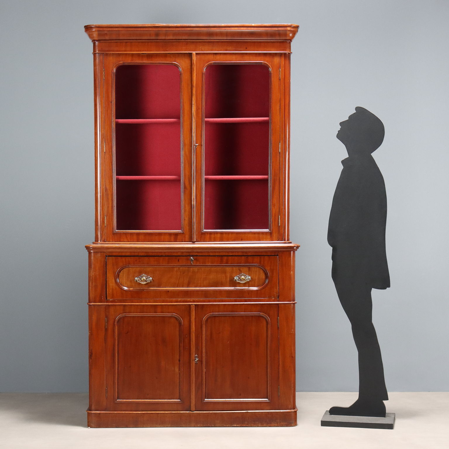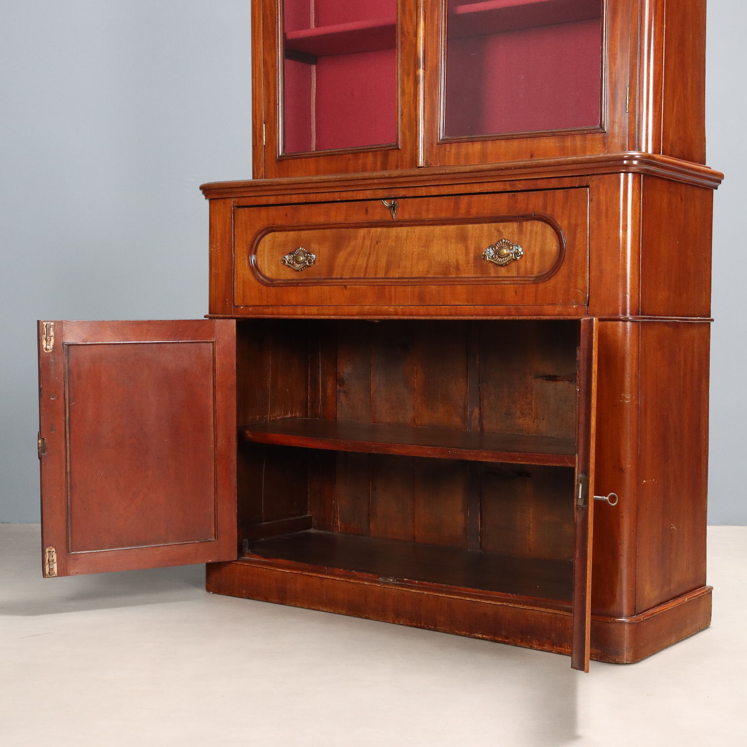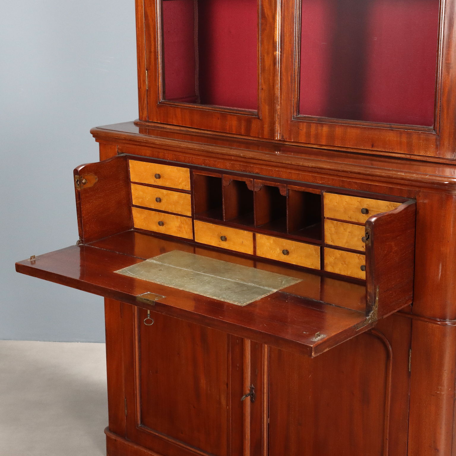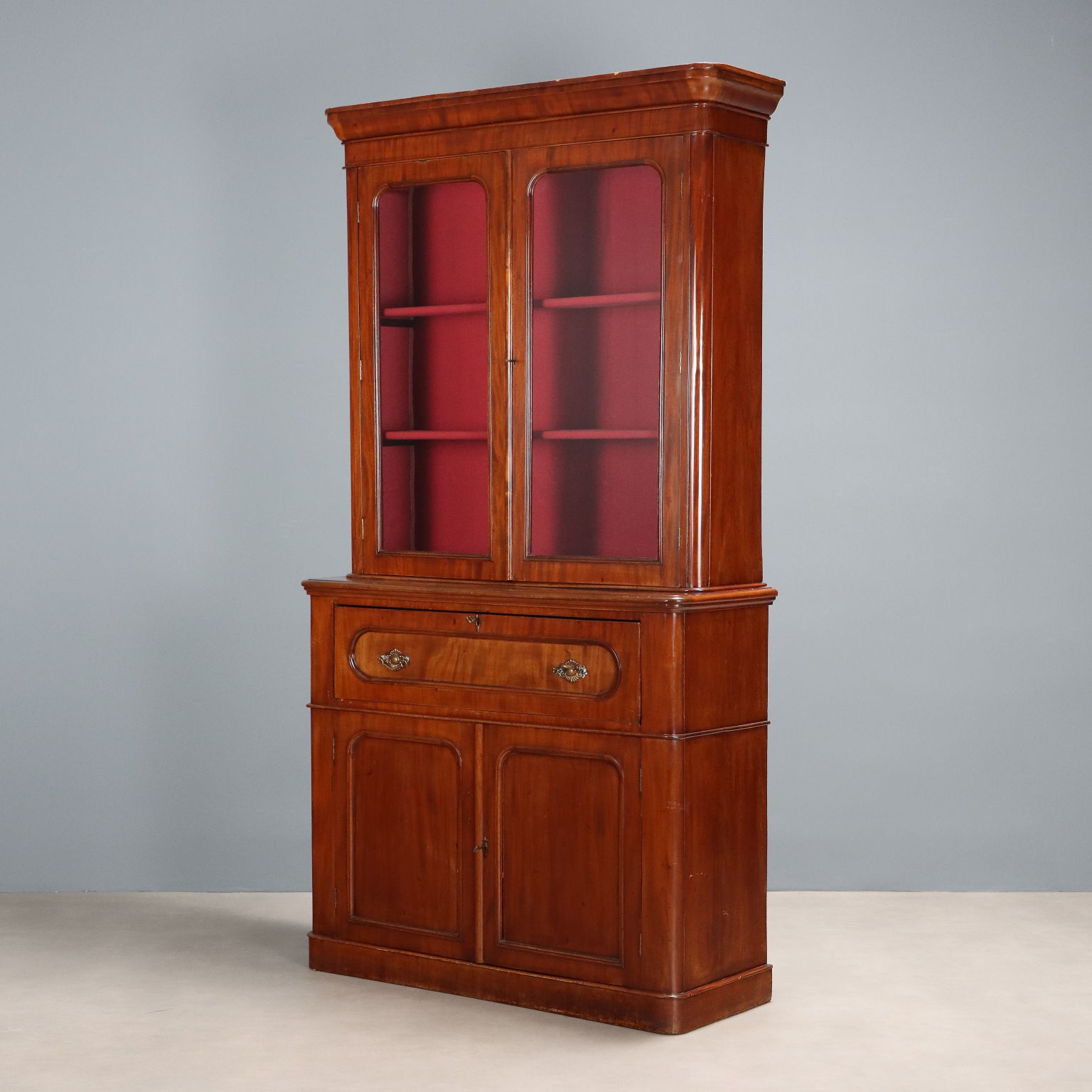 Libreria Vittoriana in mogano. Alzata con ante a vetro e due ripiani interni, cassetto centrale a ribalta celante scarabattolo a scrittoio con inserto il pelle sul piano, sette cassetti e vani a giorno. Coppia di ante pannellate alla base, schienale in abete. Inghilterra, secondo quarto XIX Secolo.