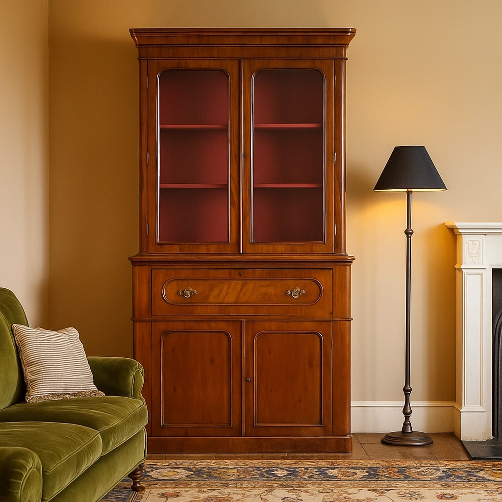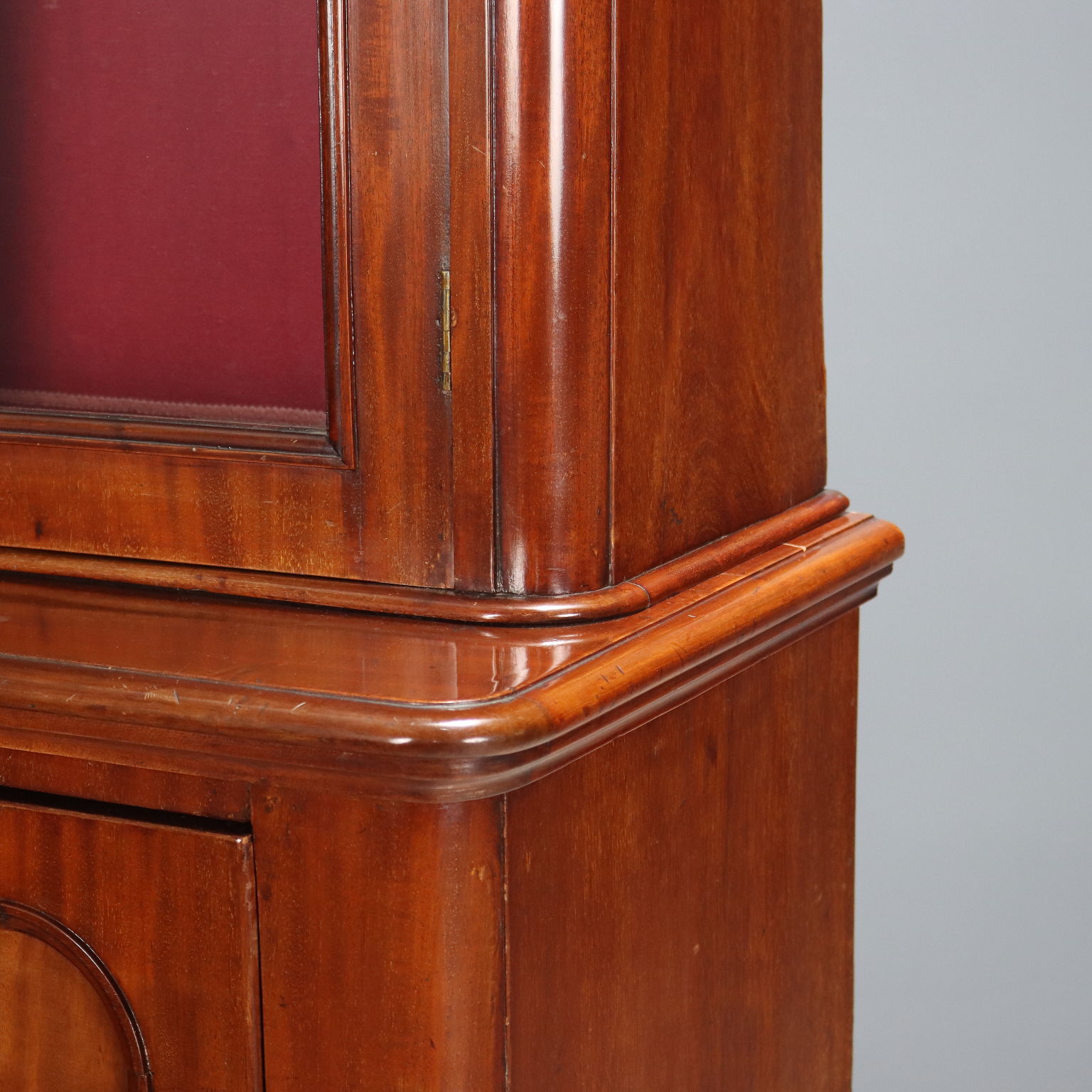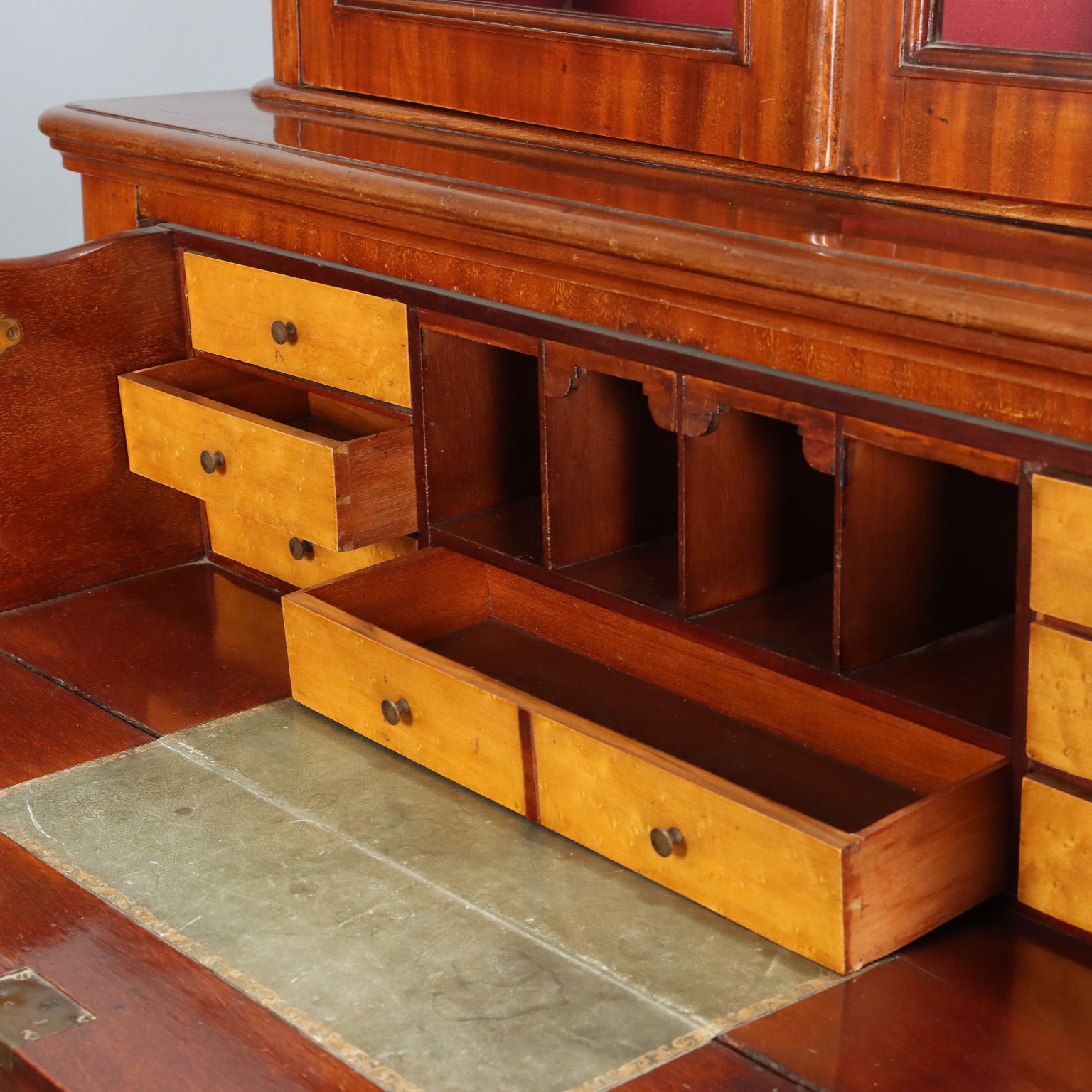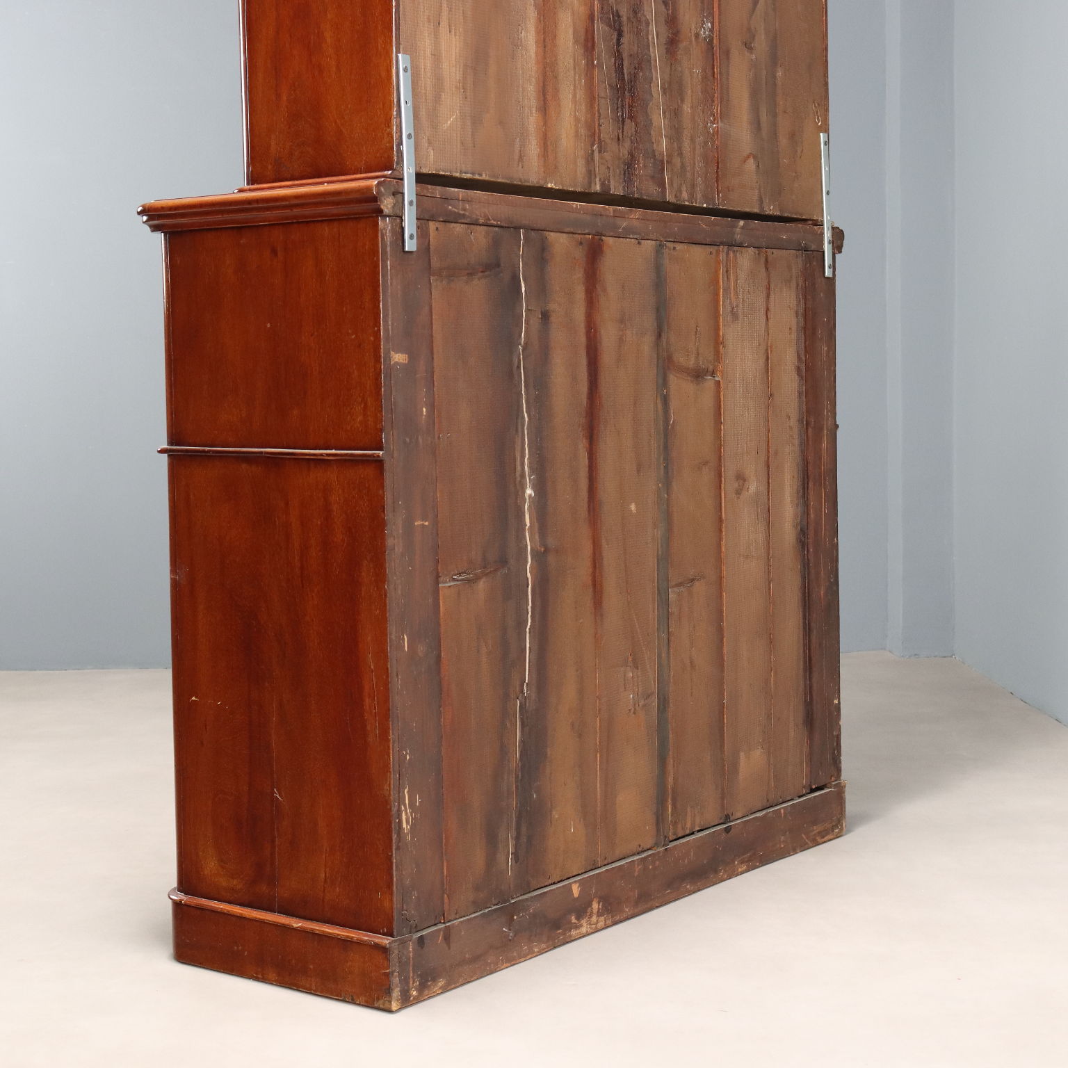 Libreria Vittoriana in mogano. Alzata con ante a vetro e due ripiani interni, cassetto centrale a ribalta celante scarabattolo a scrittoio con inserto il pelle sul piano, sette cassetti e vani a giorno. Coppia di ante pannellate alla base, schienale in abete. Inghilterra, secondo quarto XIX Secolo.