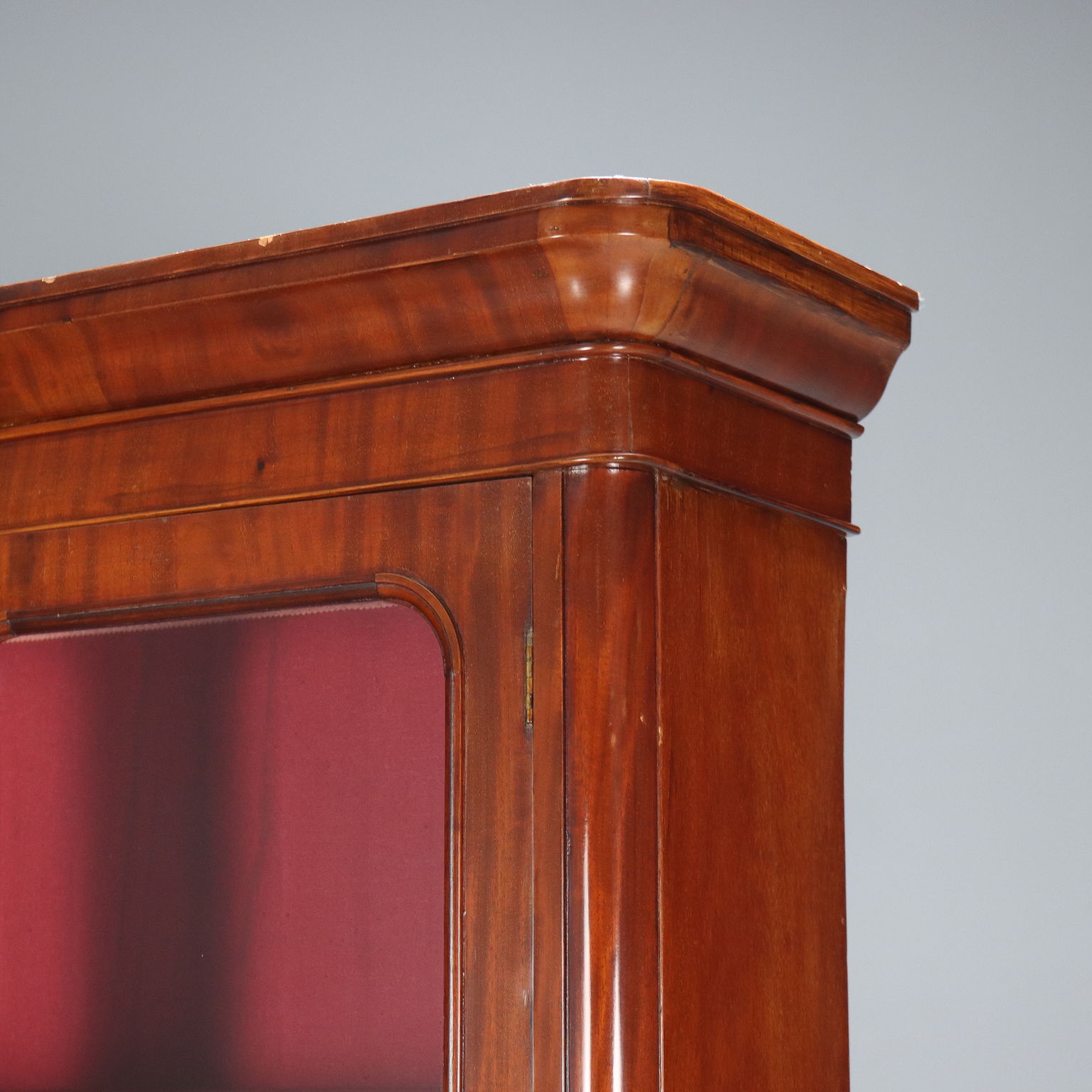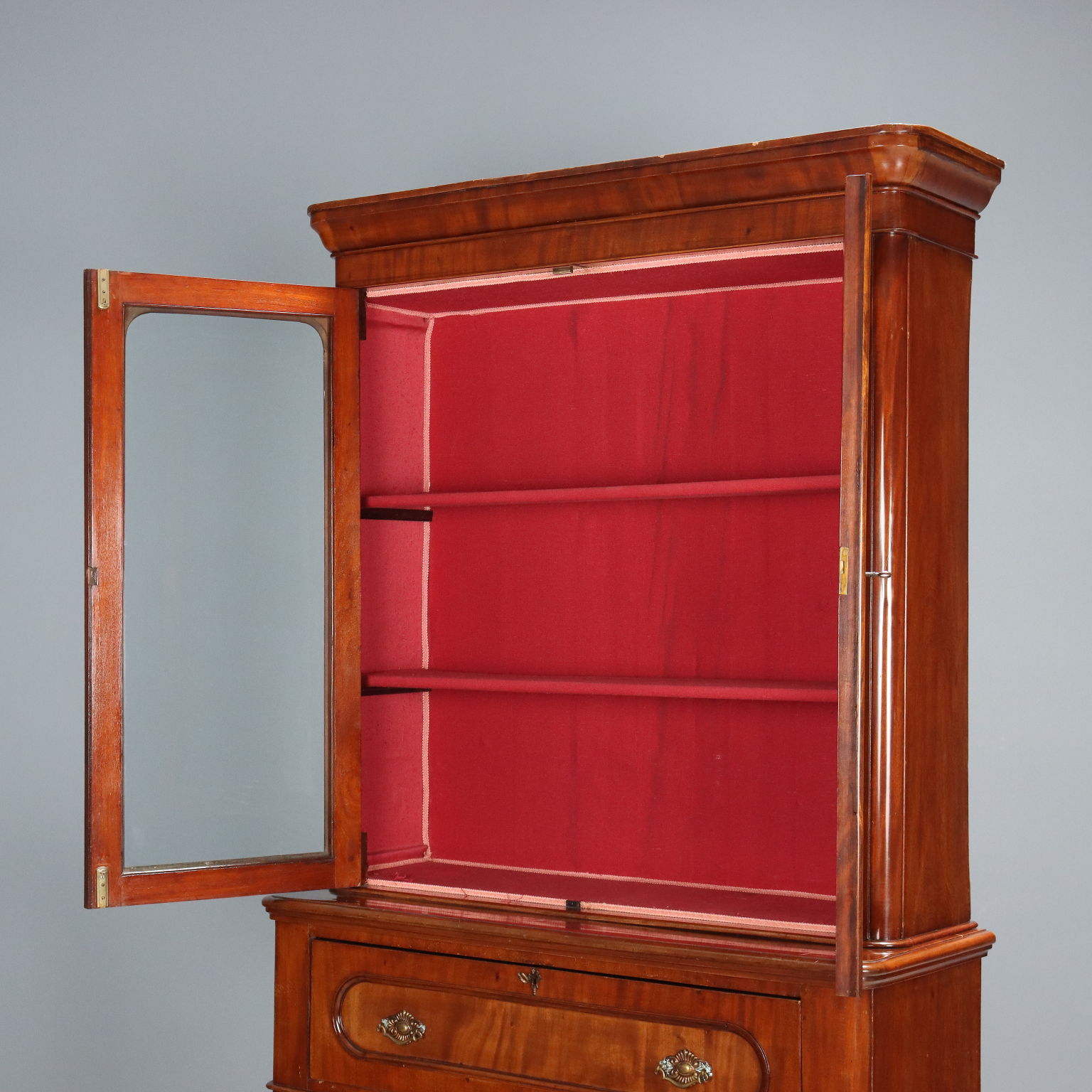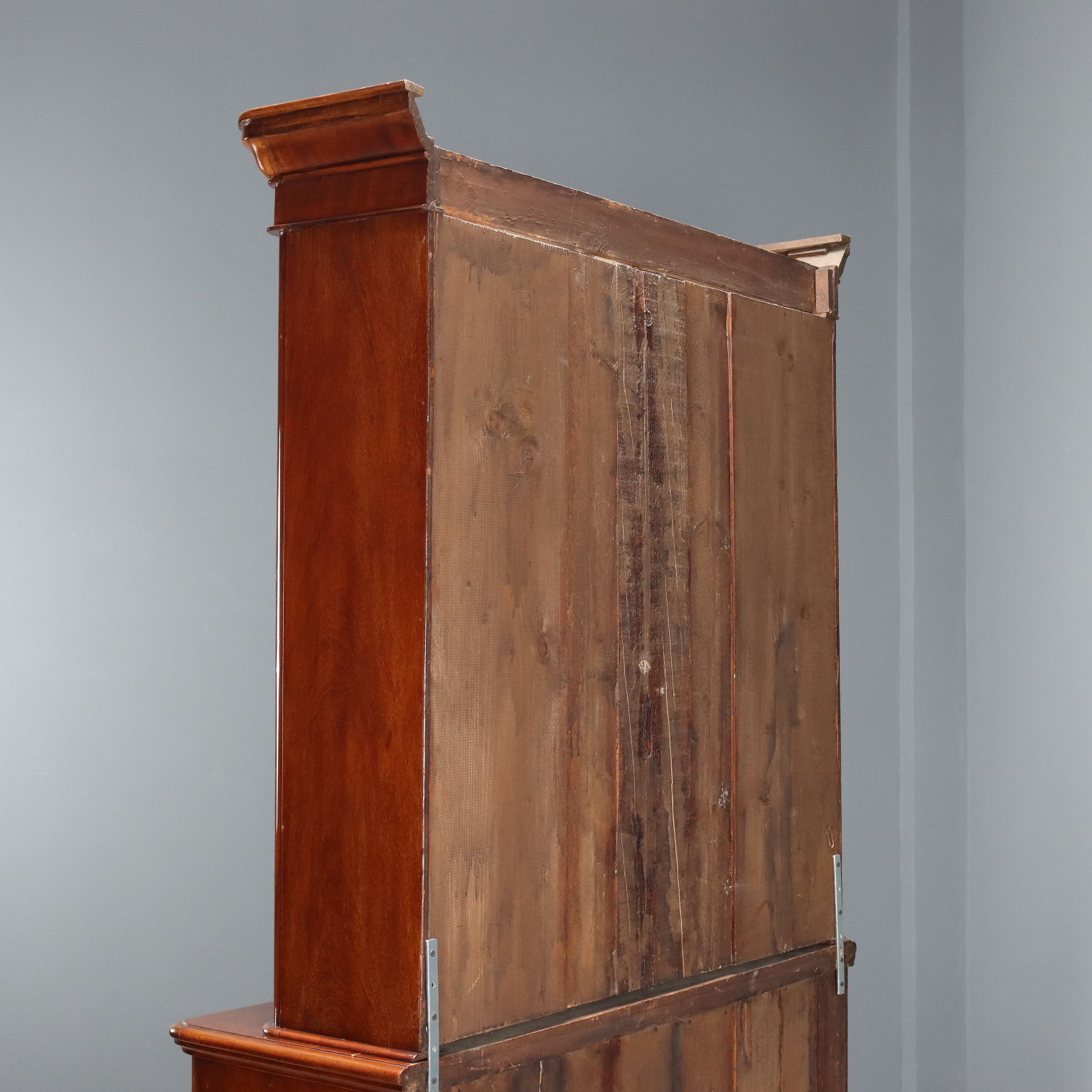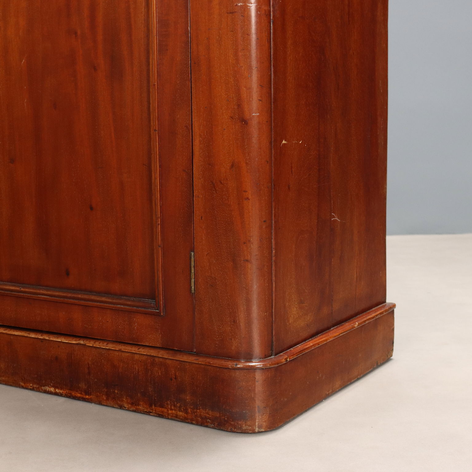 Libreria Vittoriana in mogano. Alzata con ante a vetro e due ripiani interni, cassetto centrale a ribalta celante scarabattolo a scrittoio con inserto il pelle sul piano, sette cassetti e vani a giorno. Coppia di ante pannellate alla base, schienale in abete. Inghilterra, secondo quarto XIX Secolo.
