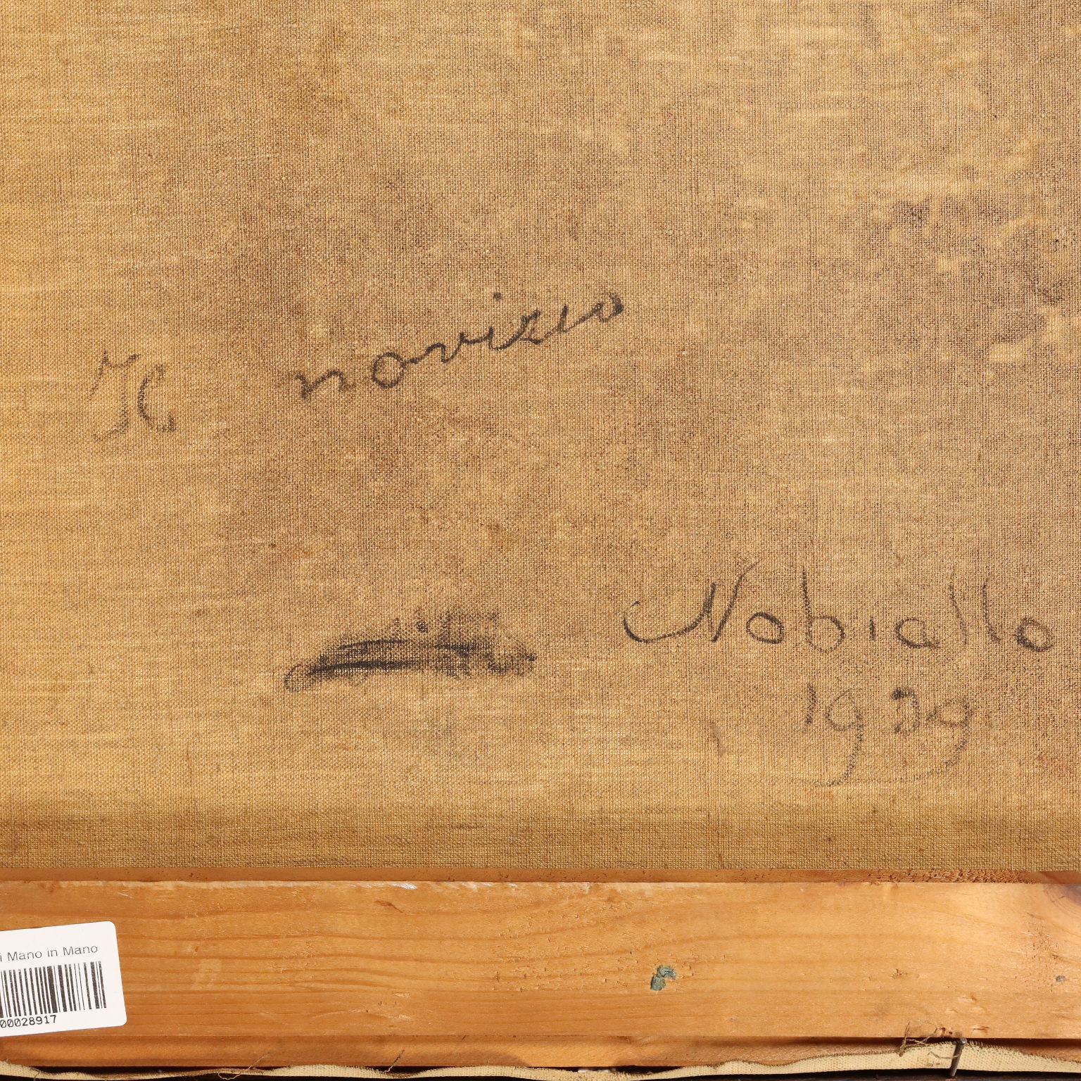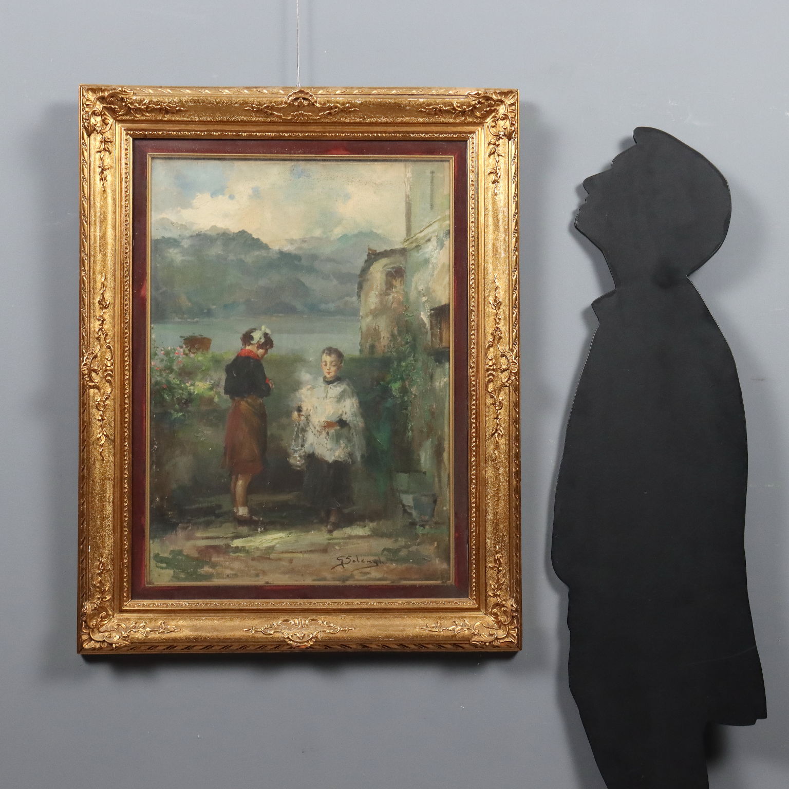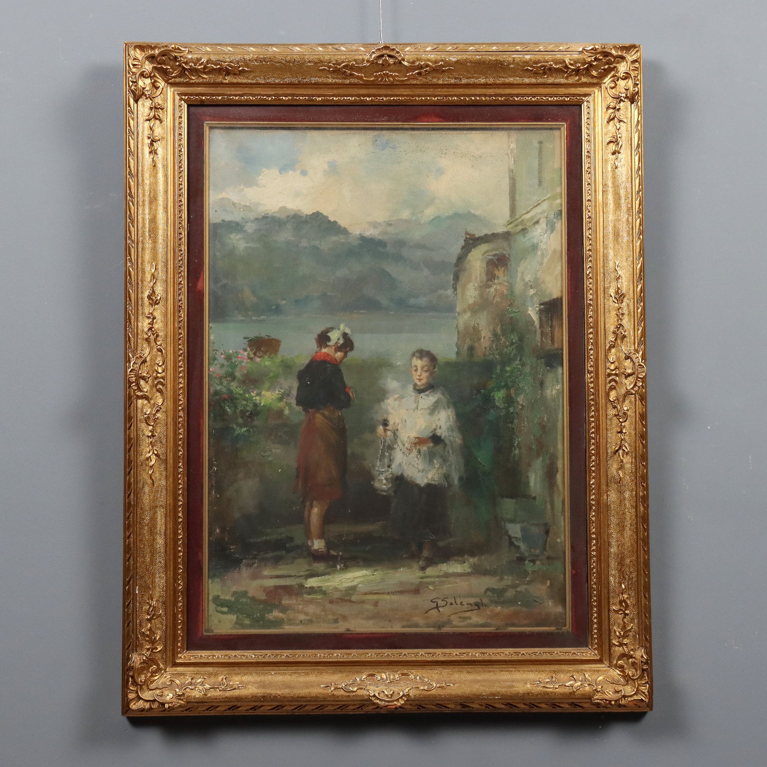 Olio su tela. Firmato in basso a destra. Al retro presente il titolo, la data e la localizzazione Nobiallo, frazione di Menaggio sul Lago di Como. Nell'ampia produzione di Giuseppe Solenghi, ricca di lirismo espresso con tonalità e tratti delicati e raffinati, prevalgono i paesaggi urbani di Milano o gli scorci lagunari veneziani, ma si trovano anche diversi scorci di campagna, prevalentemente di quella lombarda, così come interni rustici. Qui è proposta una scena con figure, seppur ambientata in un paesaggio lombardo, sul lago di Como, ben visibile sullo sfondo: sul sentiero in acciottolato dietro la chiesa, un chierichetto che porta il turibolo dell' incenso, lo mostra ad una ragazzina, fiero del suo incarico! L'opera è presentata in cornice coeva.