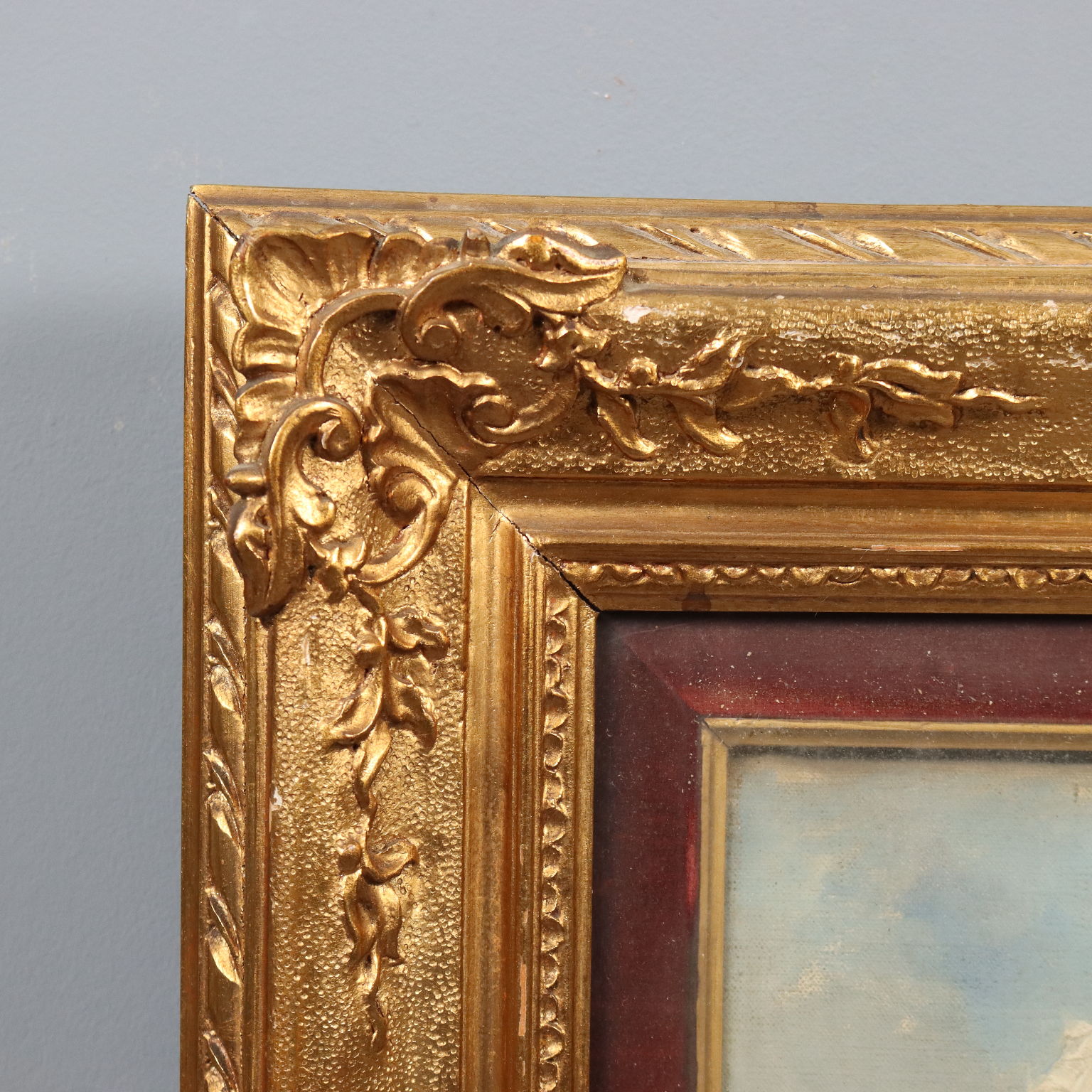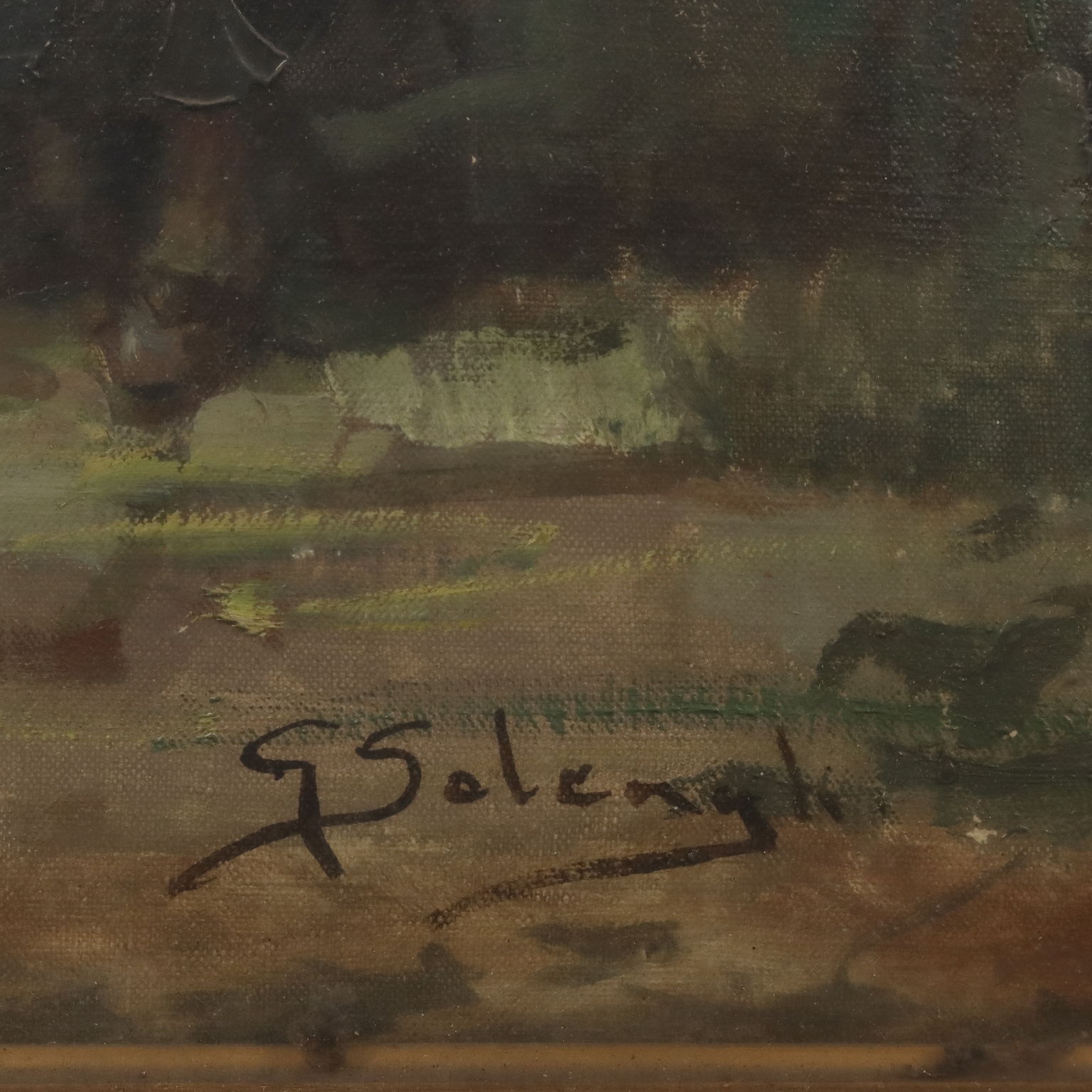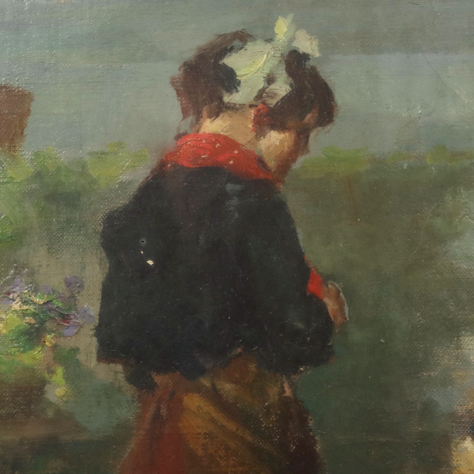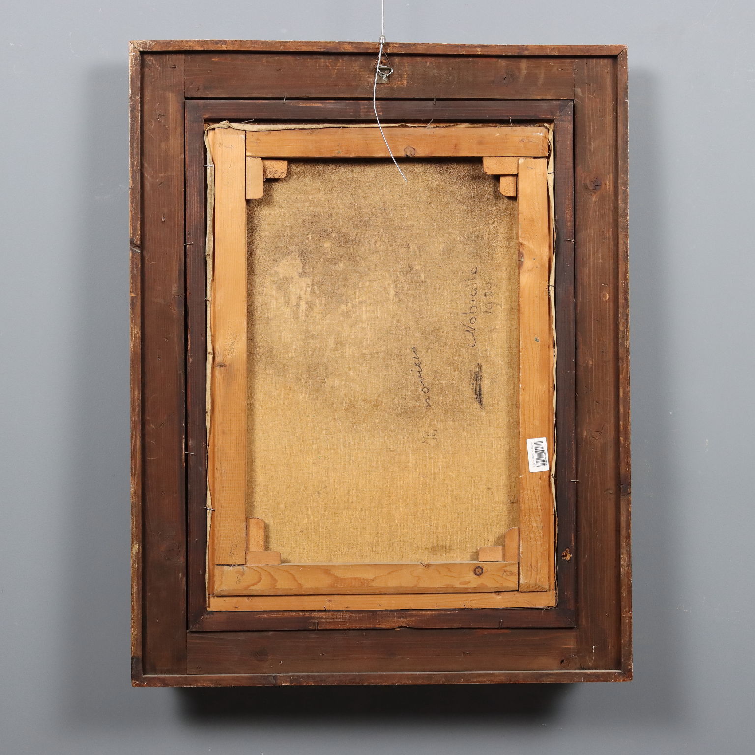 Olio su tela. Firmato in basso a destra. Al retro presente il titolo, la data e la localizzazione Nobiallo, frazione di Menaggio sul Lago di Como. Nell'ampia produzione di Giuseppe Solenghi, ricca di lirismo espresso con tonalità e tratti delicati e raffinati, prevalgono i paesaggi urbani di Milano o gli scorci lagunari veneziani, ma si trovano anche diversi scorci di campagna, prevalentemente di quella lombarda, così come interni rustici. Qui è proposta una scena con figure, seppur ambientata in un paesaggio lombardo, sul lago di Como, ben visibile sullo sfondo: sul sentiero in acciottolato dietro la chiesa, un chierichetto che porta il turibolo dell' incenso, lo mostra ad una ragazzina, fiero del suo incarico! L'opera è presentata in cornice coeva.