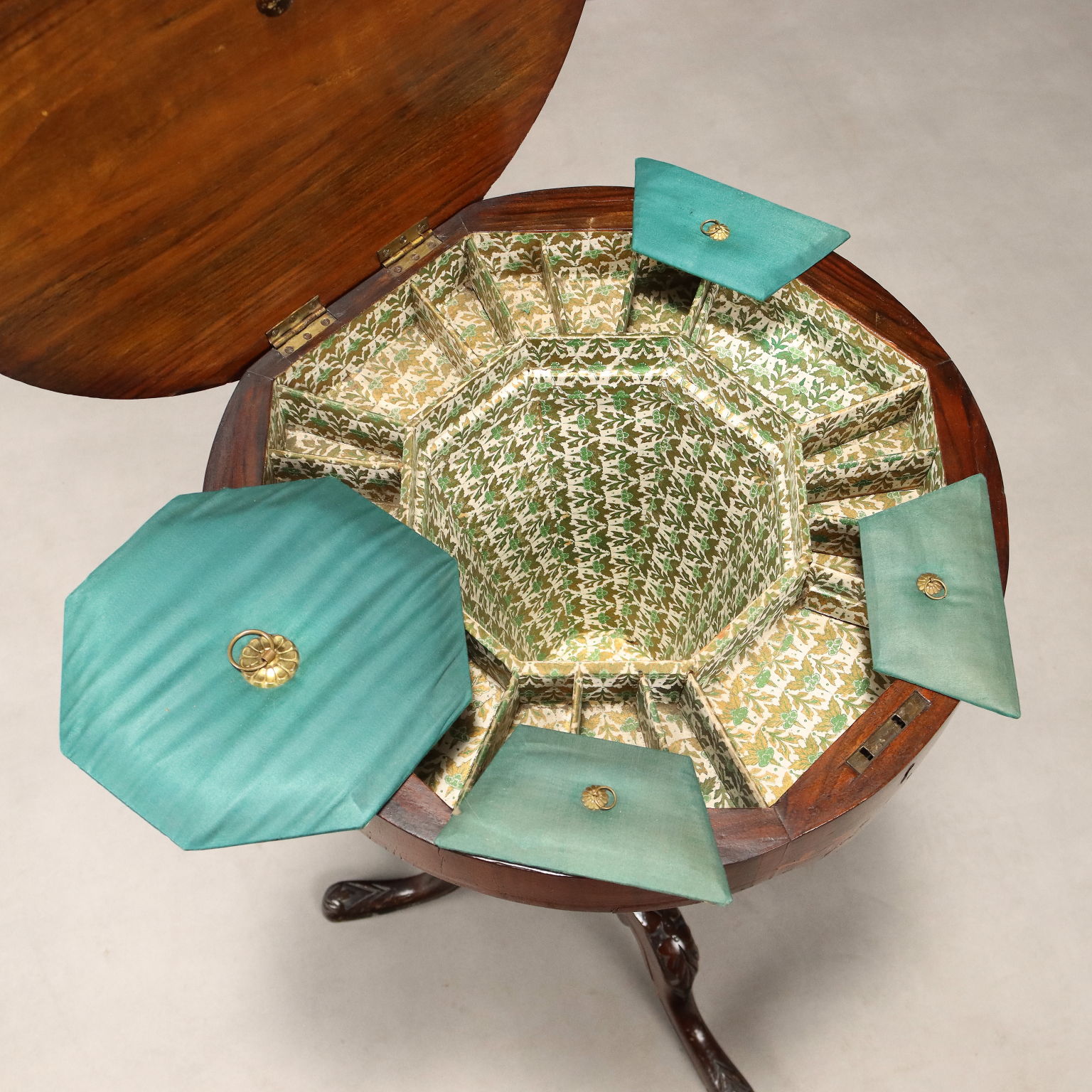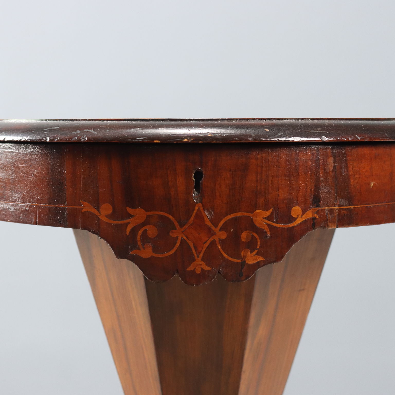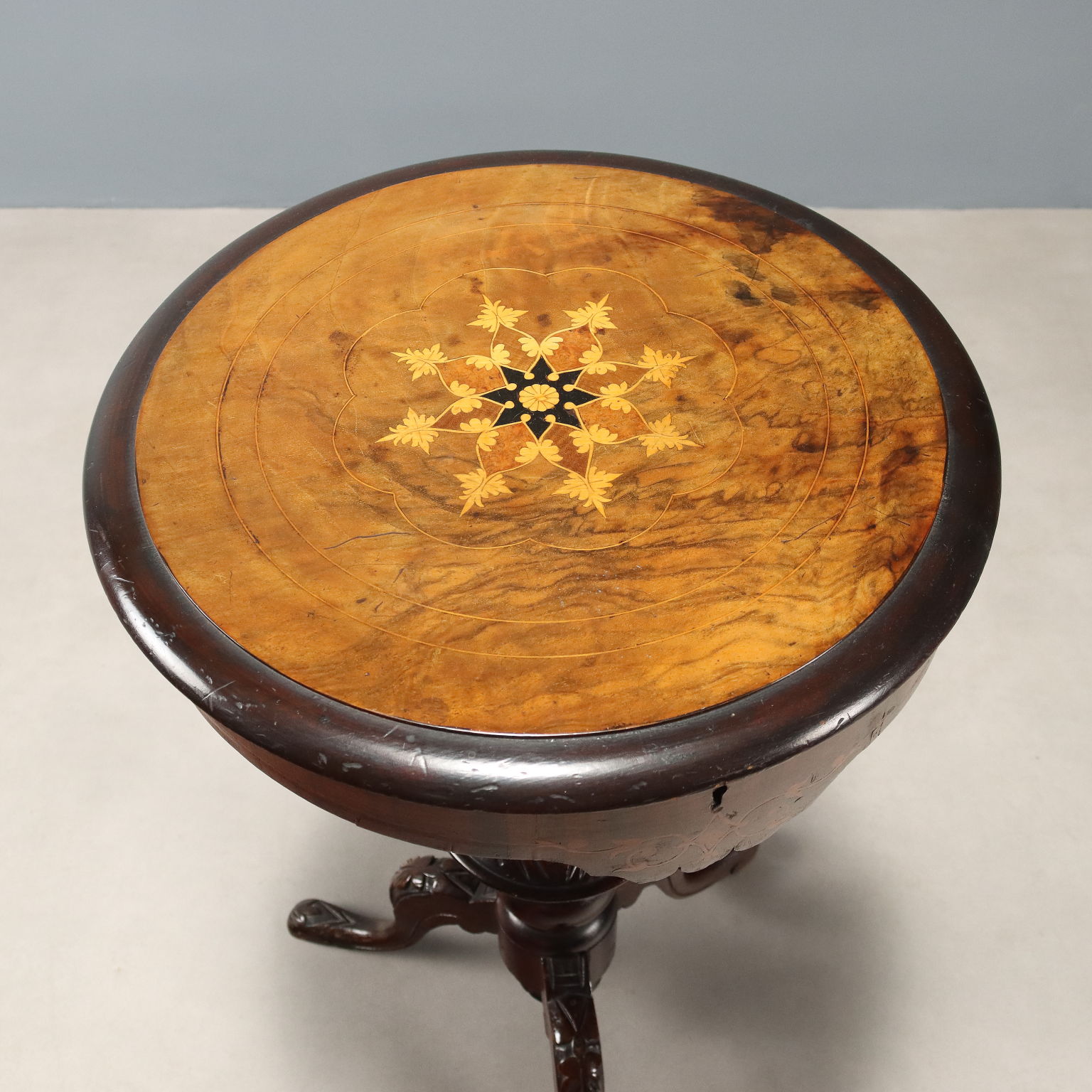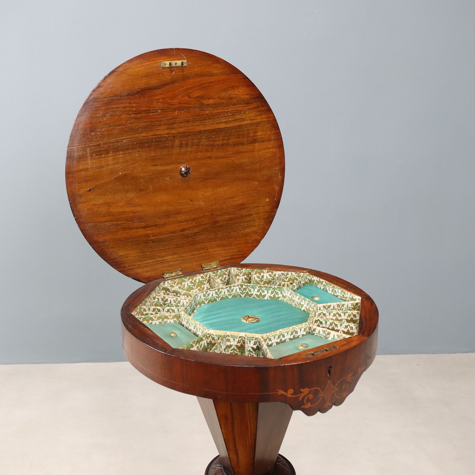 Tavolino da cucito in noce. Piano a ribalta, intarsio centrale in essenze varie, filettature in acero e modanatura ebanizzata. All'interno vano centrale a sezione ottagonale porta gomitoli, e scomparti a giorno, gamba tornita poggiante su tre piedi mossi e intagliati. Italia, fine XIX Secolo.