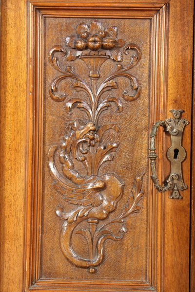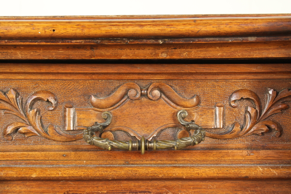 Dal fronte spezzato, è retta da piedi torniti. Presenta quattro ante e tre cassetti intagliati con belle maniglie in bronzo. Montanti intagliati, piano sagomato.