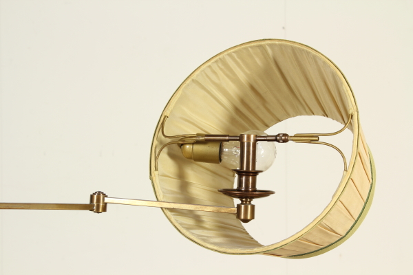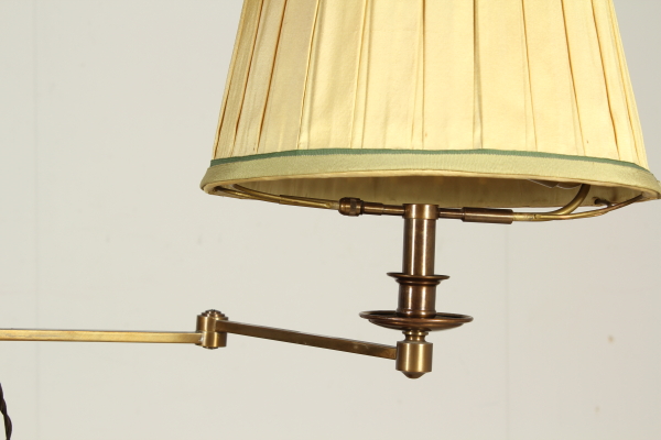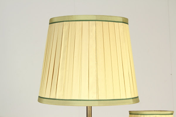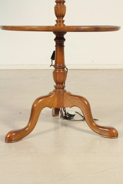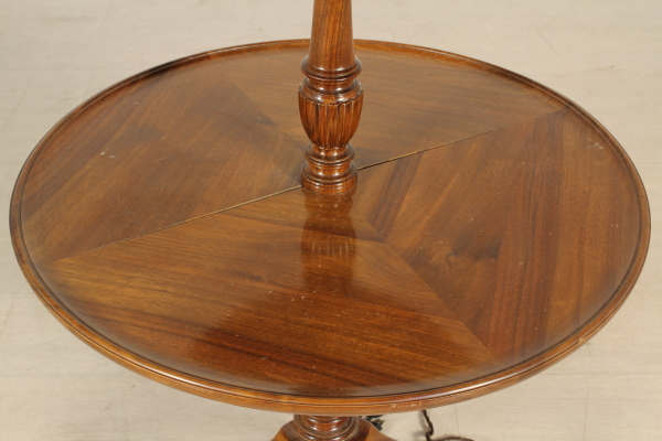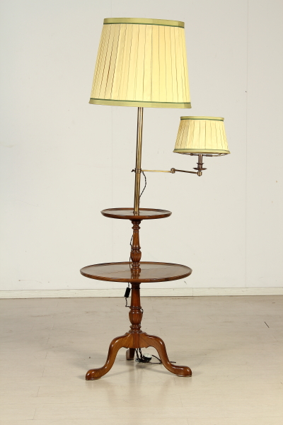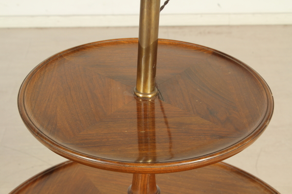 Retto da balaustro centrale tornito terminante con tre gambe mosse, presenta due piani tondi di diverso diametro. Stelo in ottone, comprende due lampade con paralume.