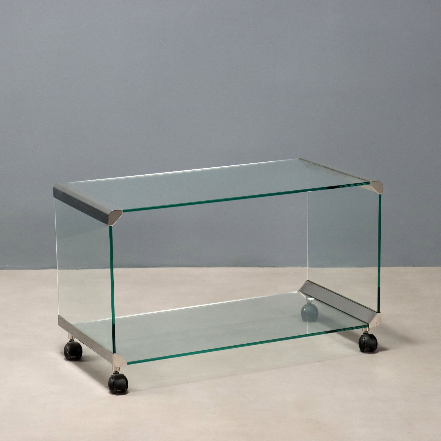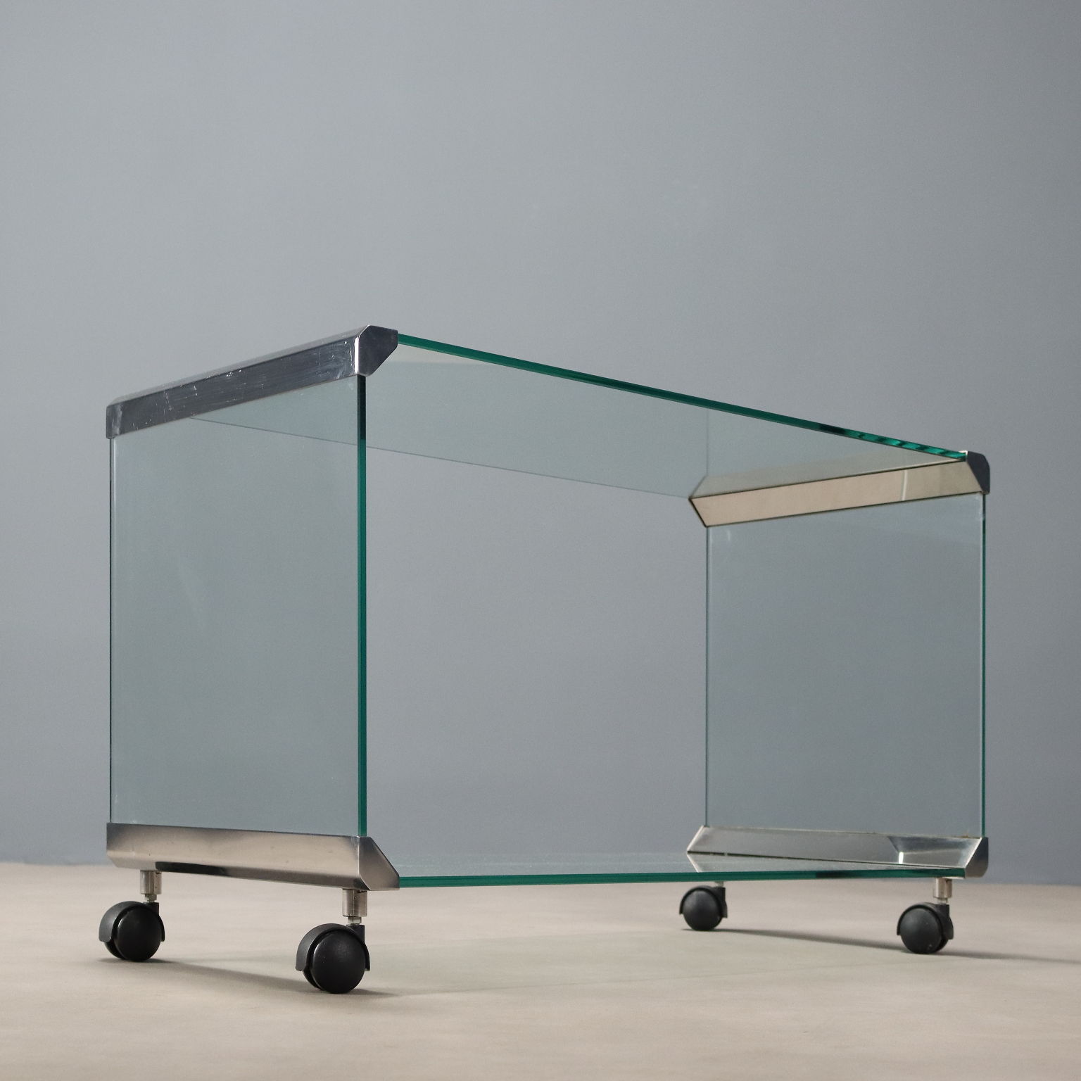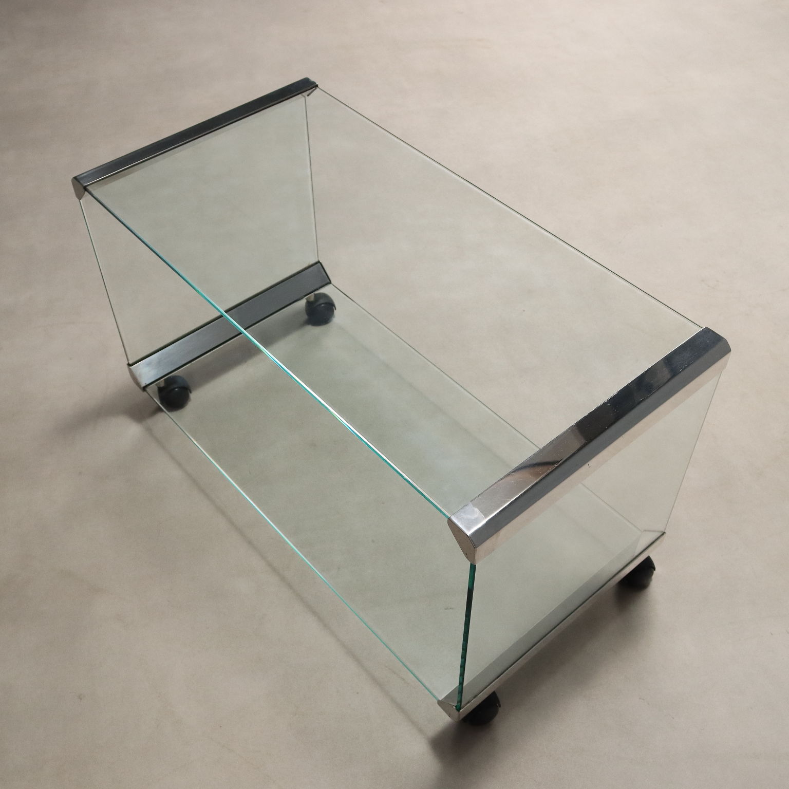 Tavolino vintage con rotelle, realizzato in vetro con profili in ottone nichelato.