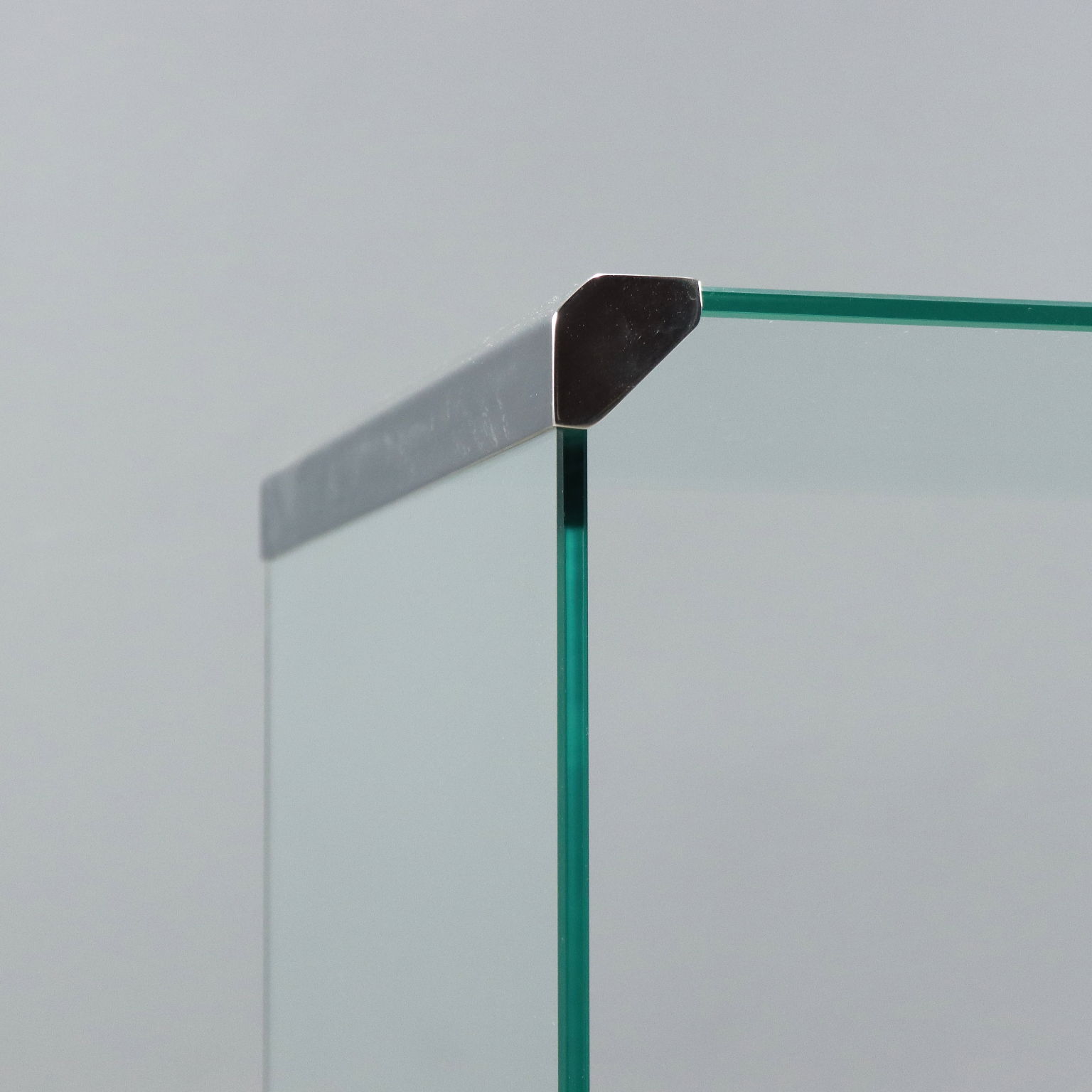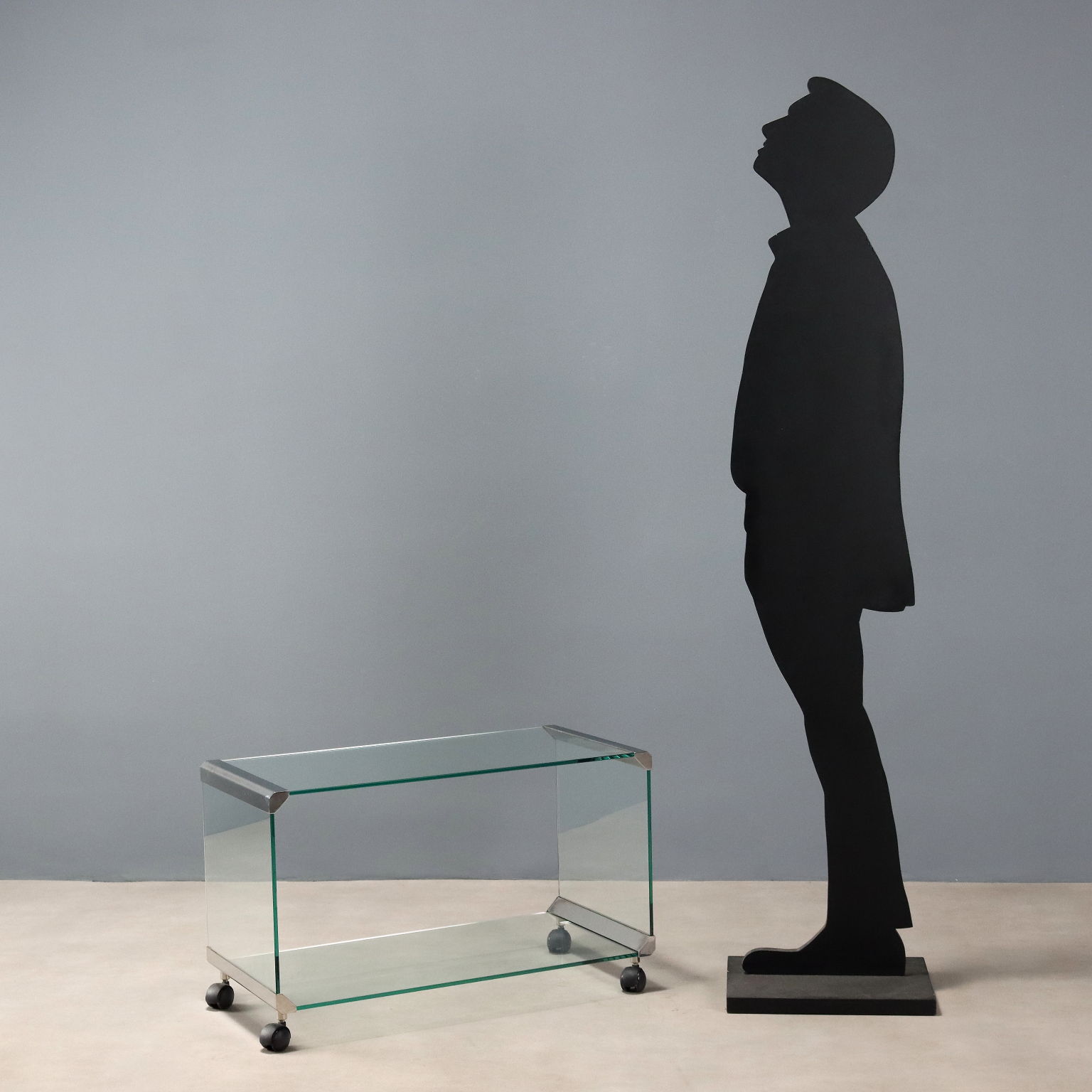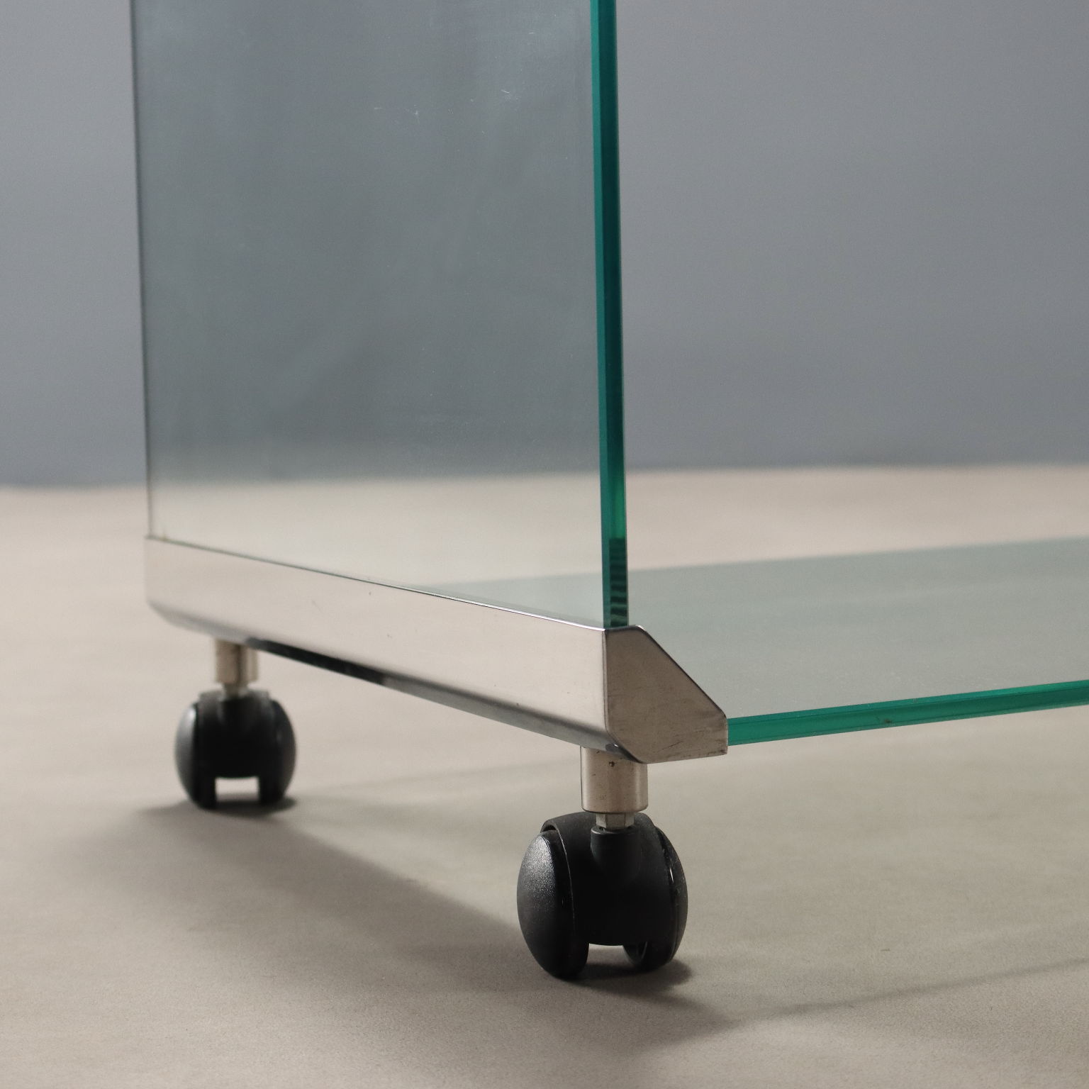 Tavolino vintage con rotelle, realizzato in vetro con profili in ottone nichelato.