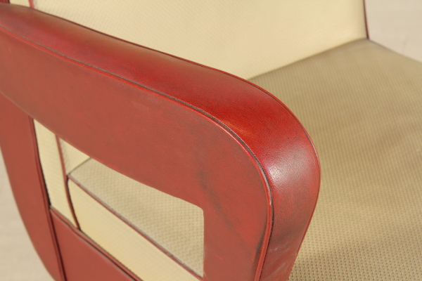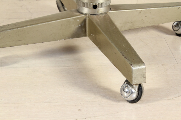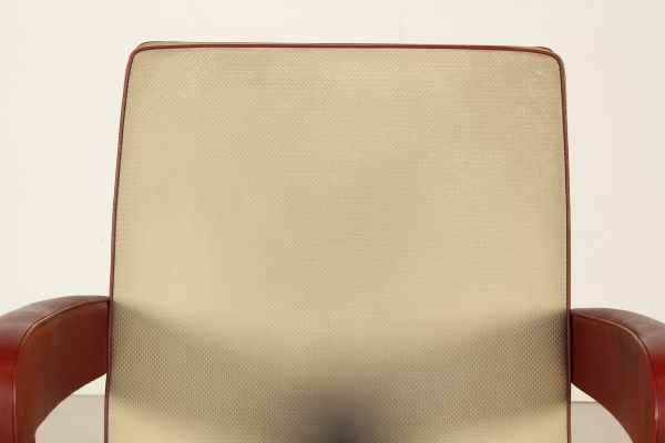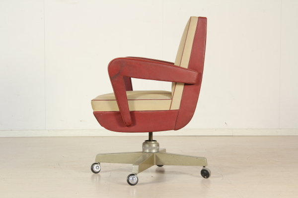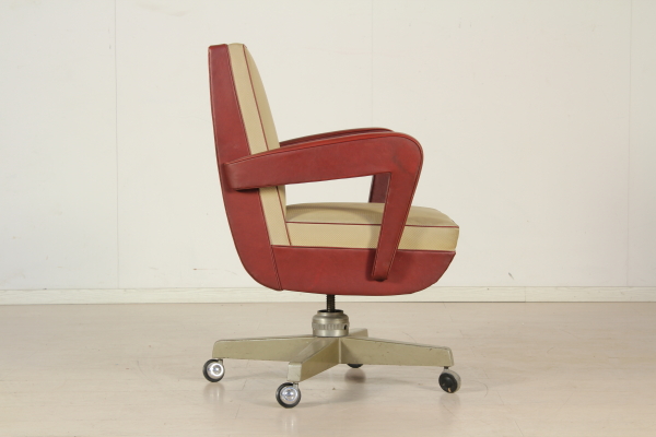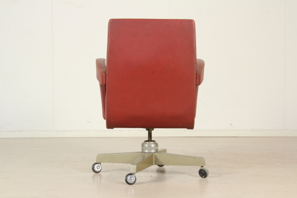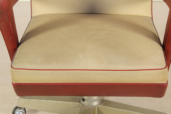Poltrona girevole; imbottitura in espanso, rivestimento in skai, metallo. Buone condizioni, presenta piccoli segni di usura.