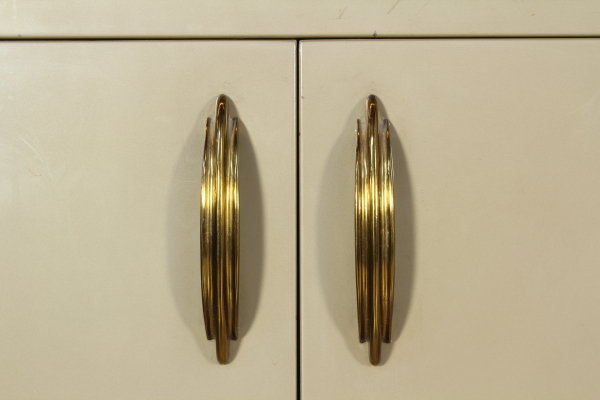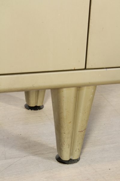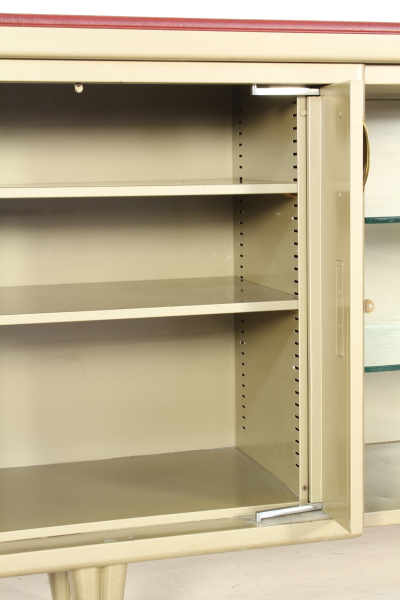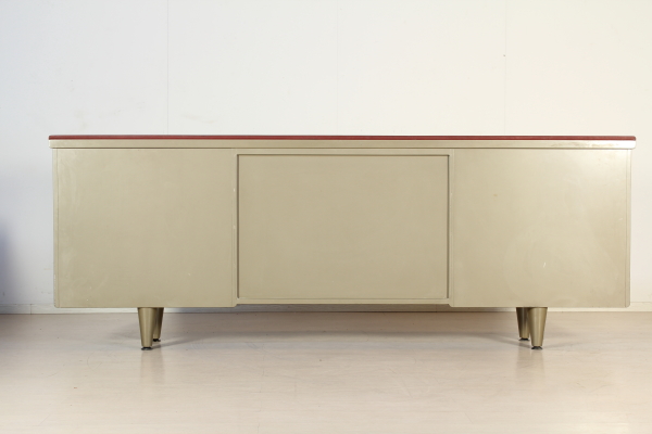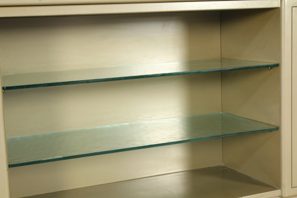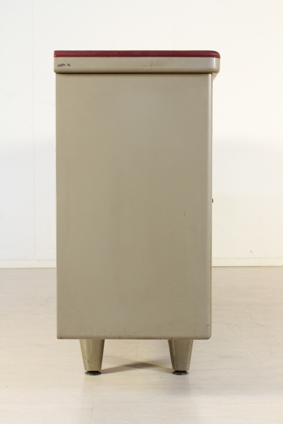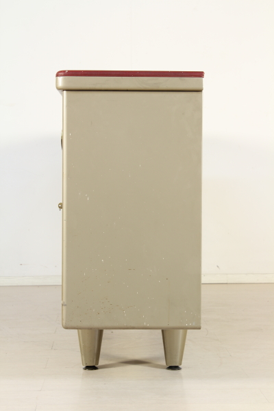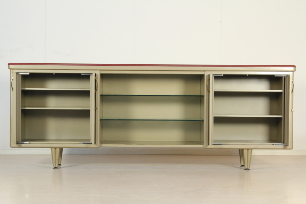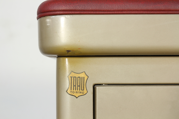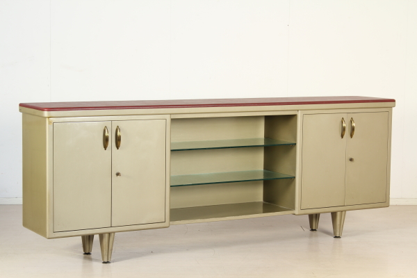 Mobile; metallo, vetro, ottone, piano ricoperto in skai. Buone condizioni, presenta piccoli segni di usura.