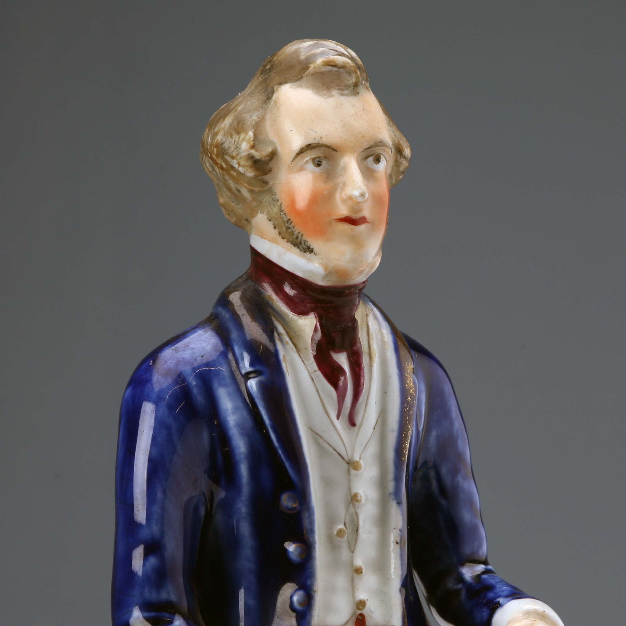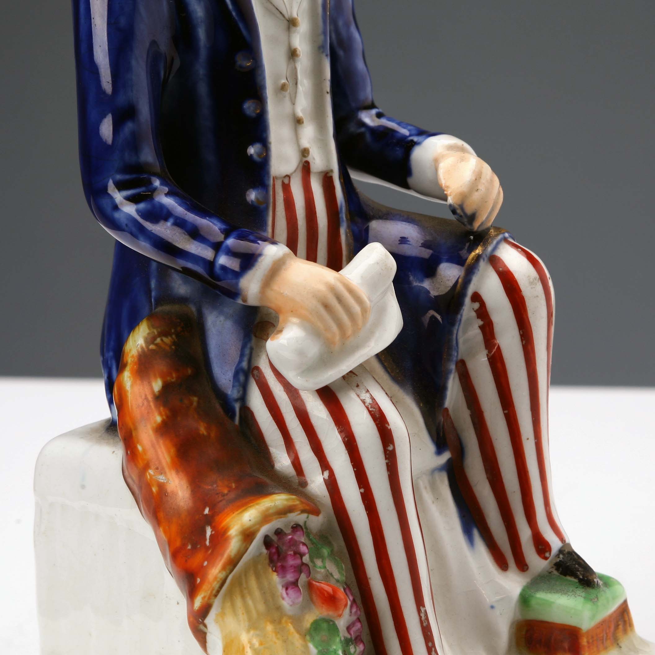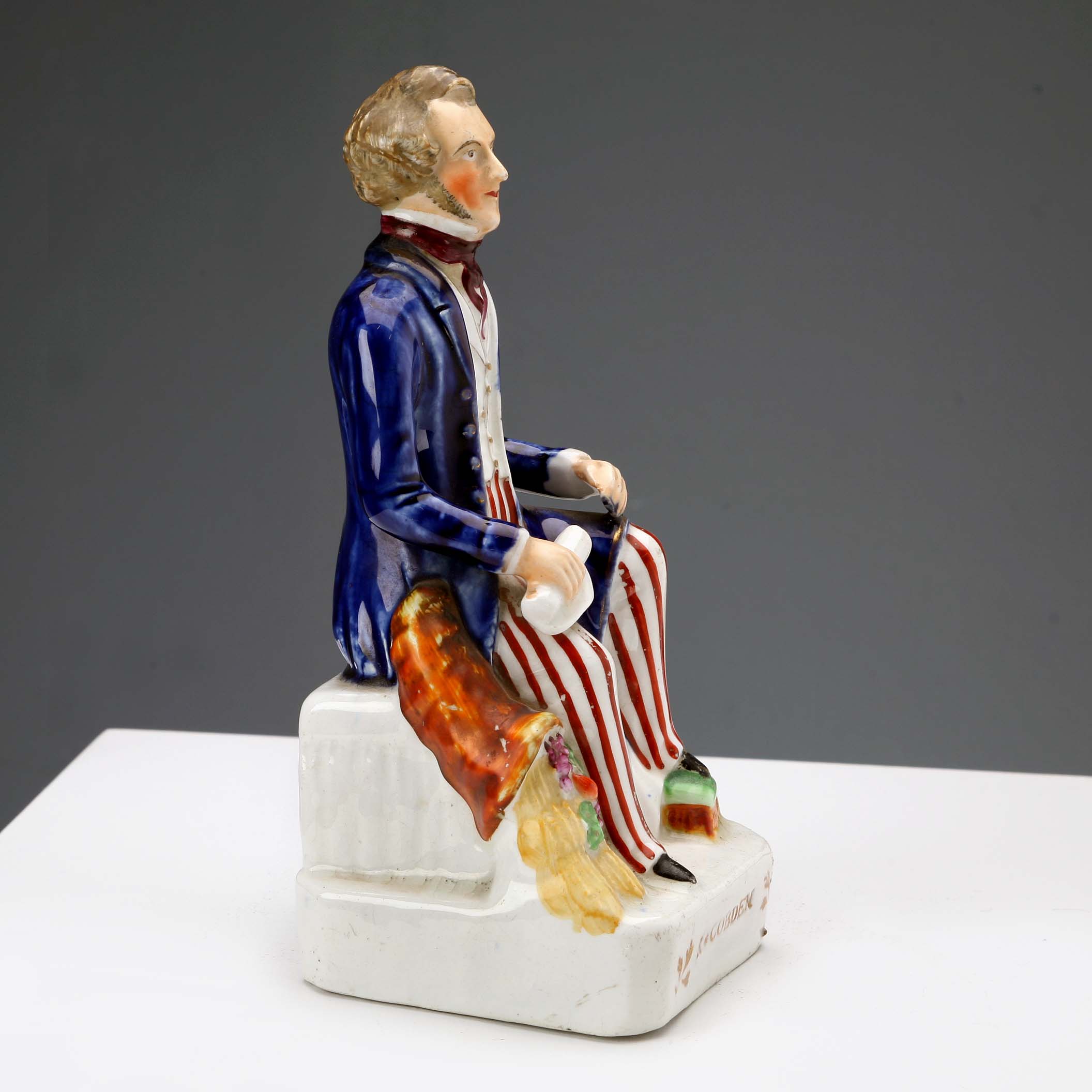 Scultura in ceramica policroma raffigurante Richard Cobden, politico inglese dell'epoca, seduto con pergamena in mano e cornucopia fiorita al fianco.