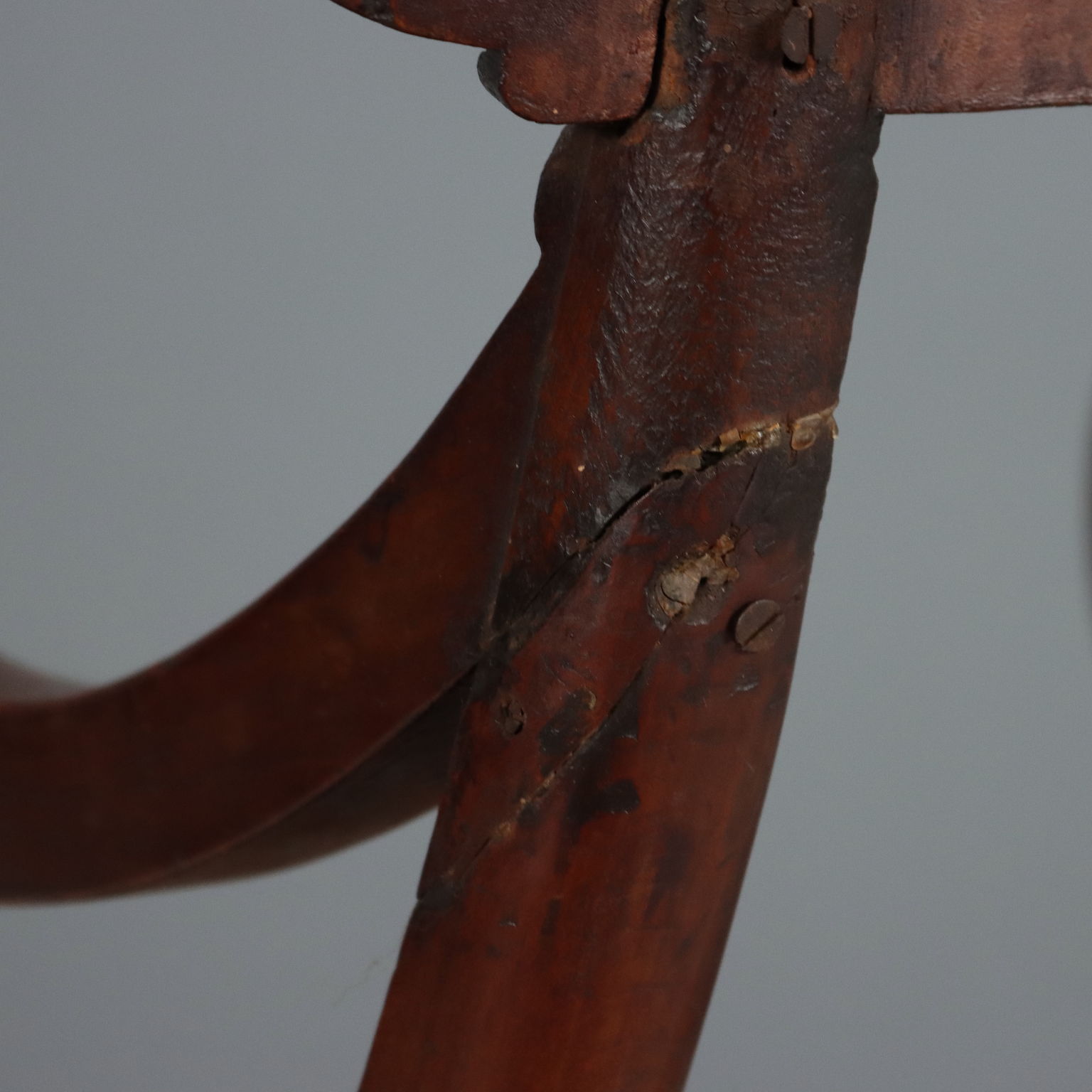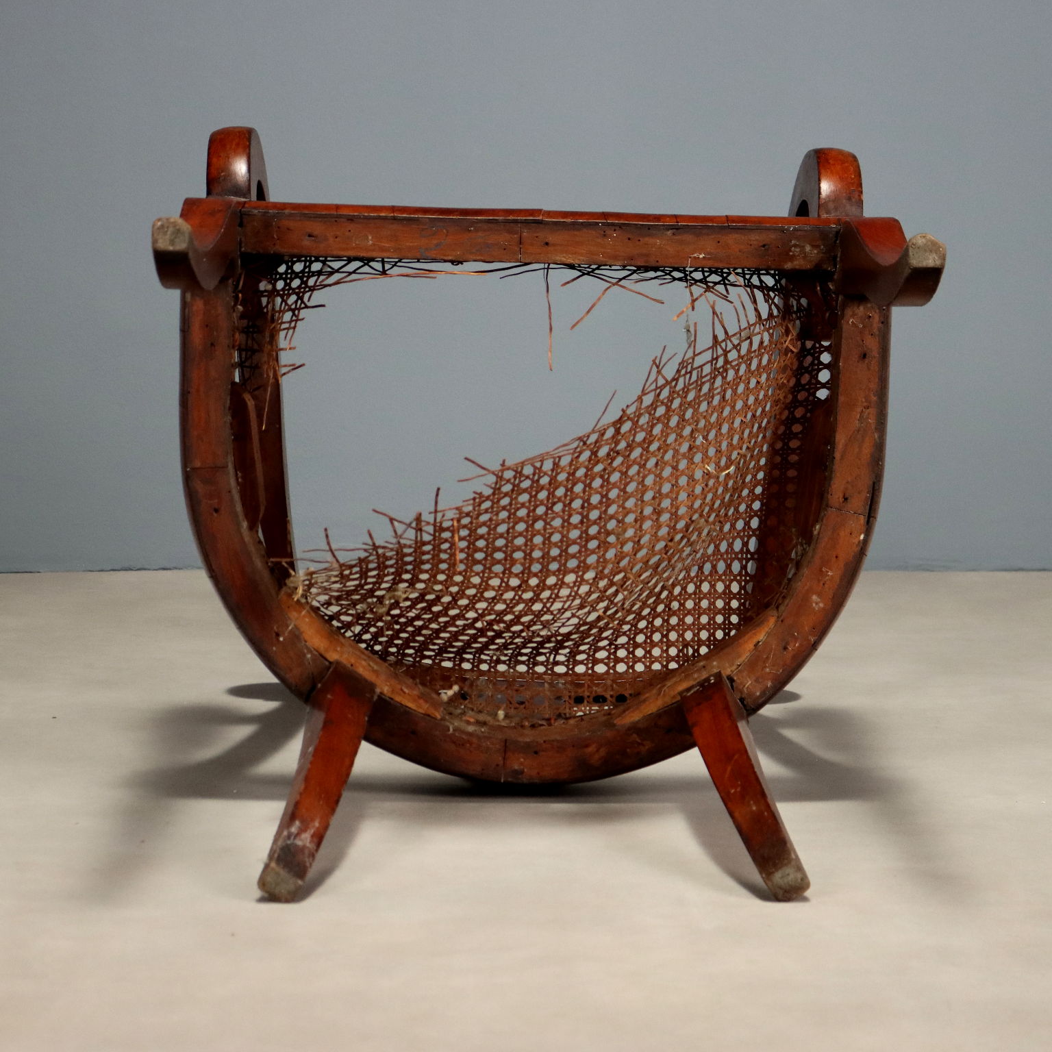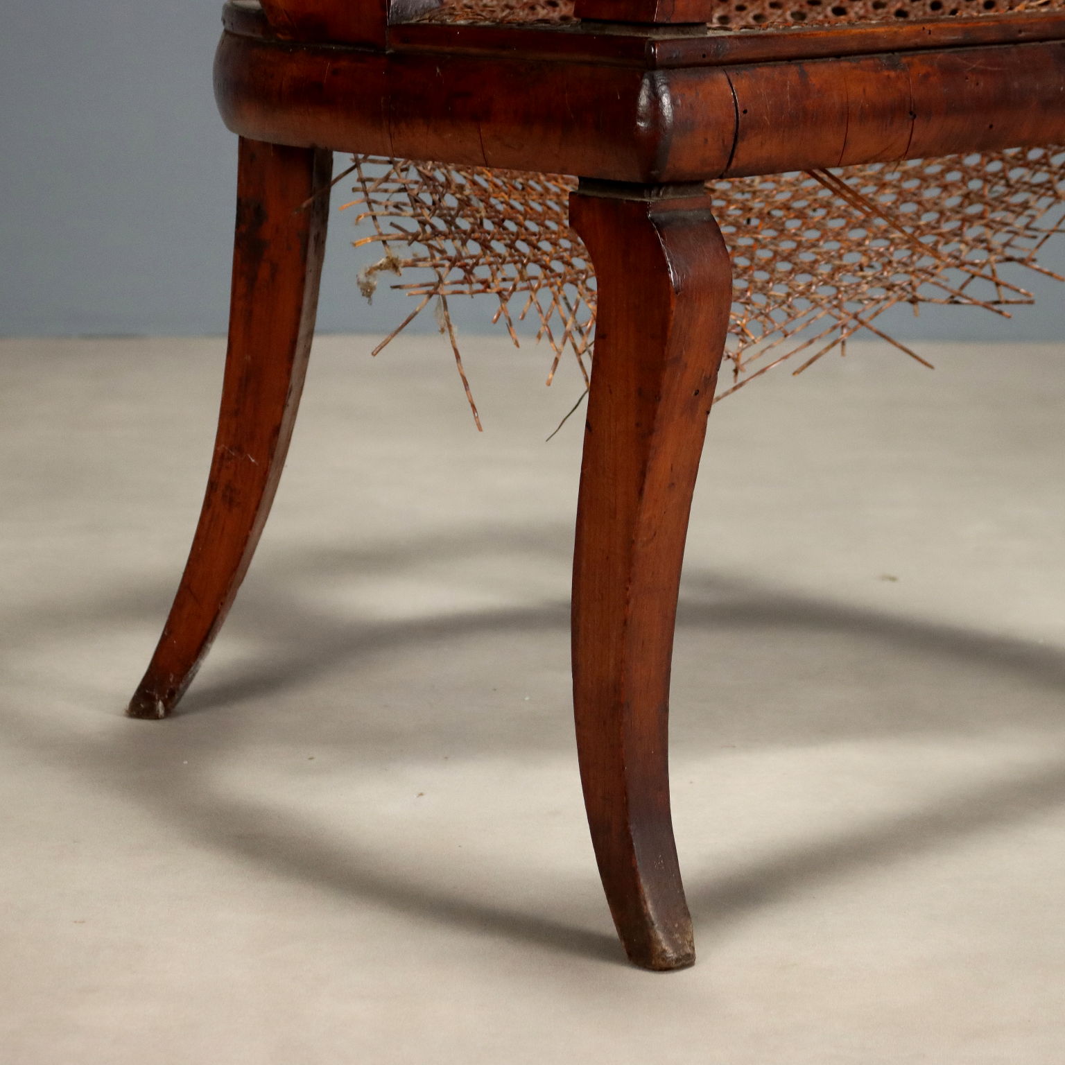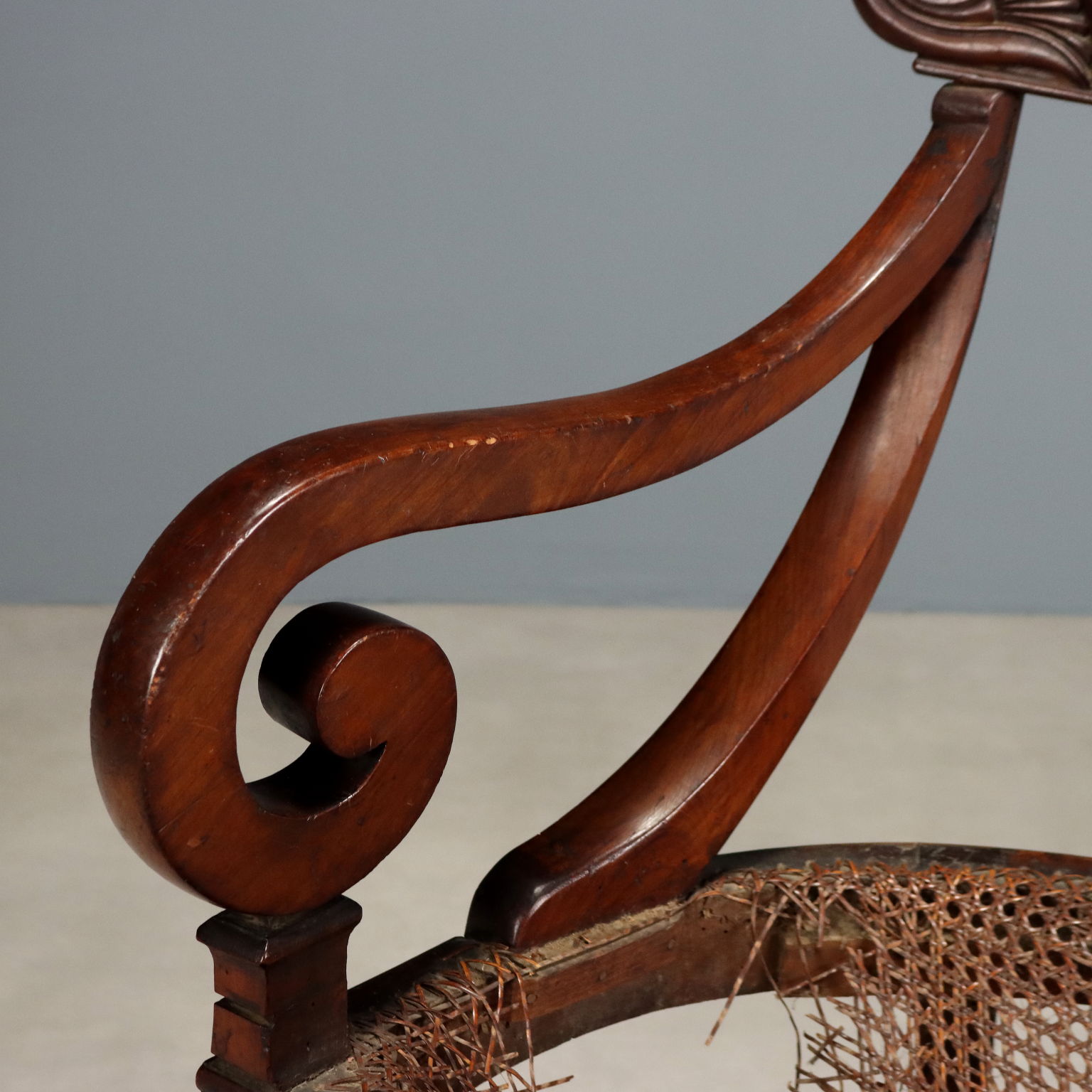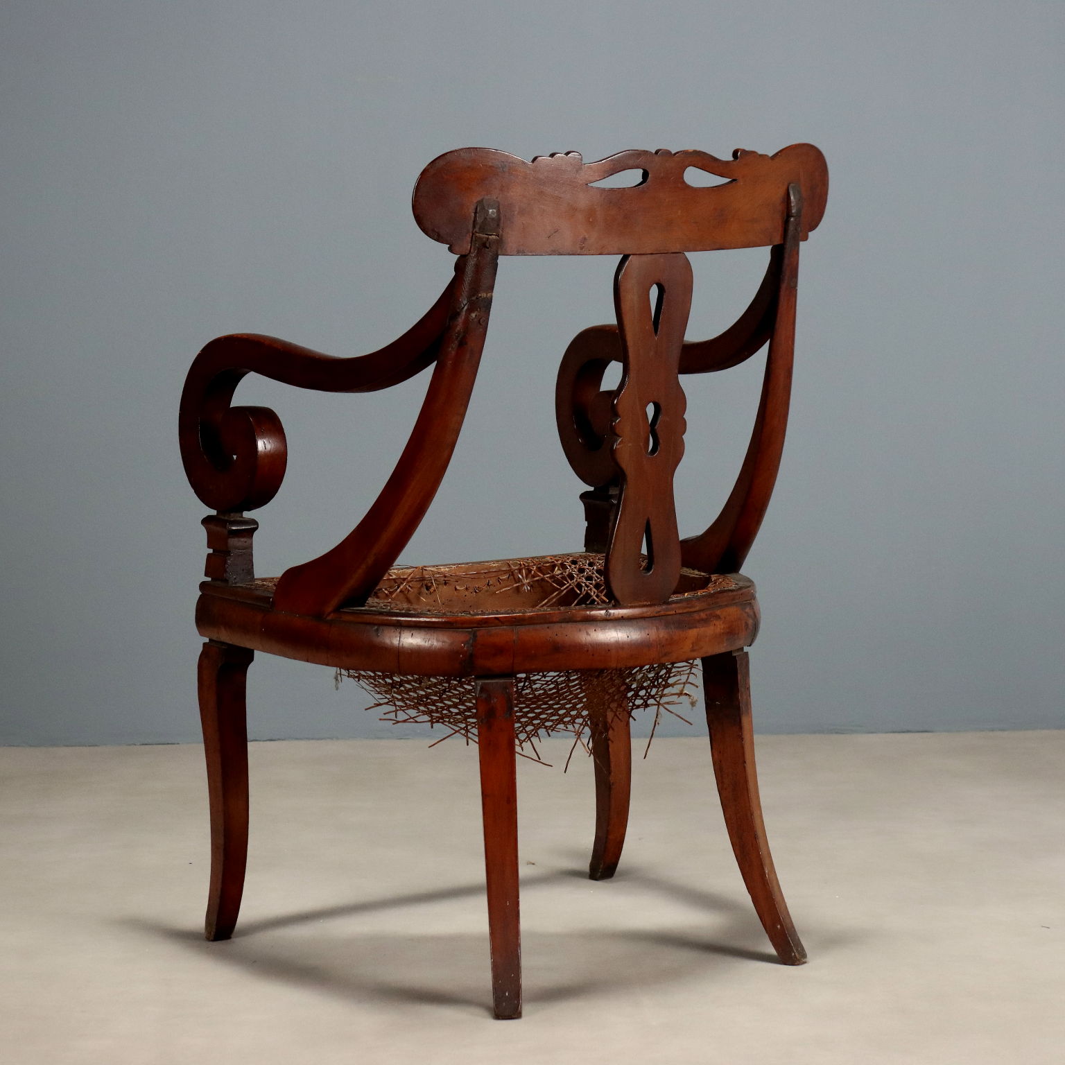 Poltroncina Luigi Filippo in mogano. Schienale a giorno con intagli a volute e braccioli a ricciolo, seduta incannucciata da rifare. Italia, secondo quarto XIX Secolo.