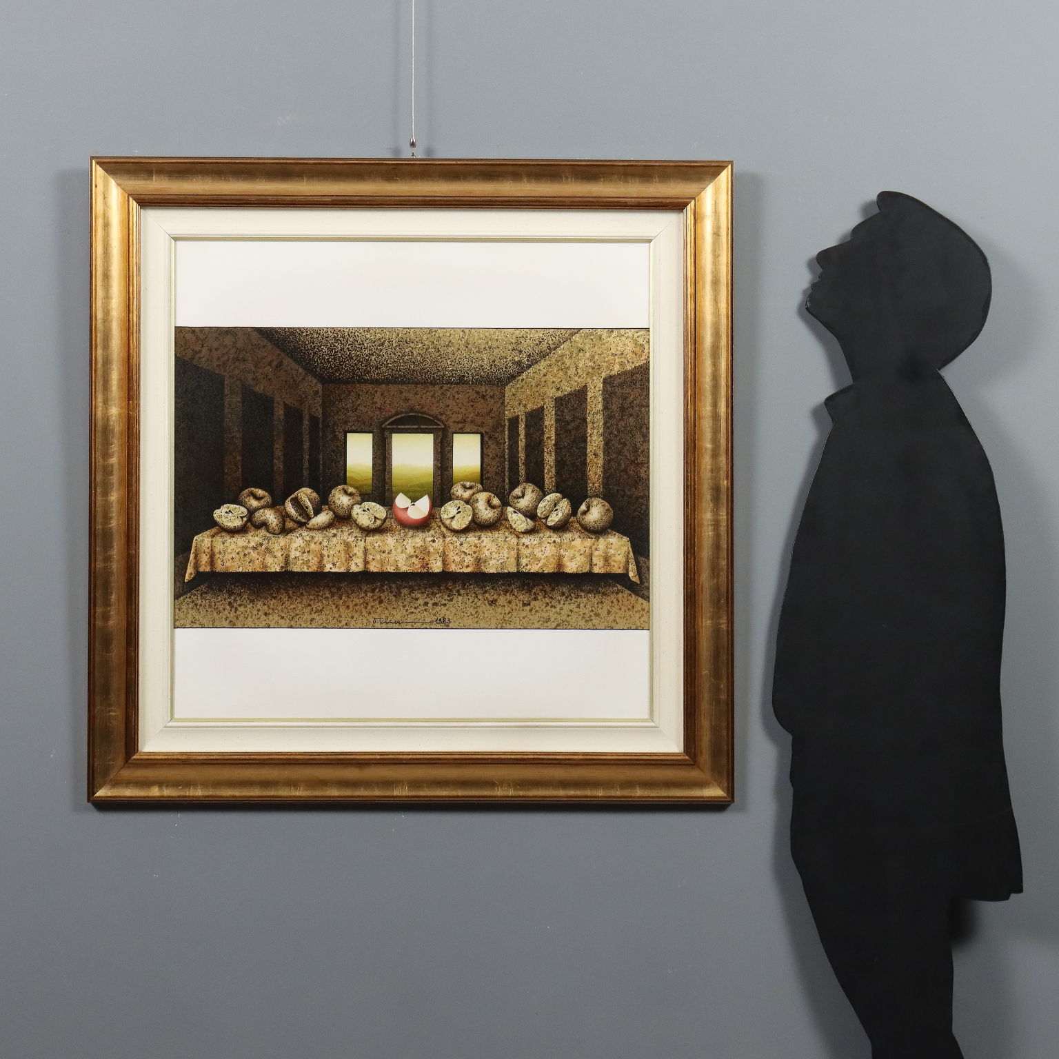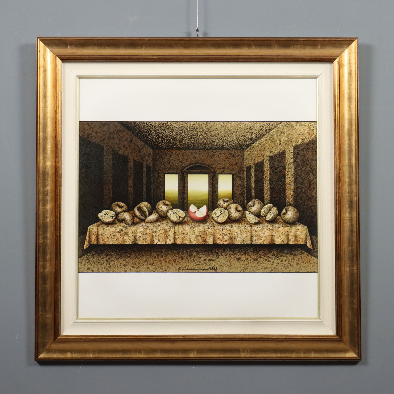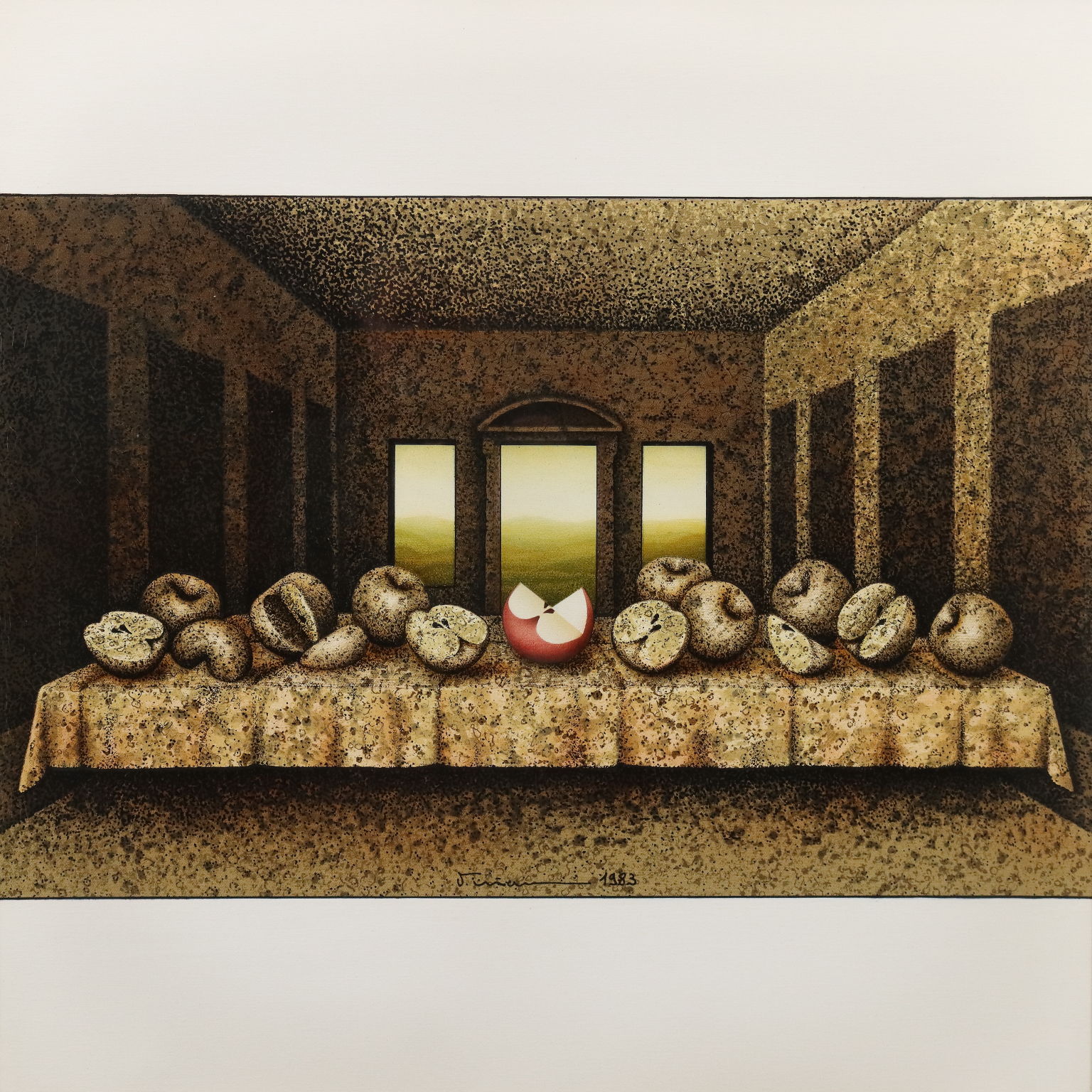 Dipinto su supporto serigrafico, numero di serie 14/15. Firmato e datato in basso al centro. Al retro il titolo e ulteriore firma. L'artista nel 1983 ha riproposto in quindici versioni diverse la celebre opera leonardesca dell' Ultima Cena. La produzione pittorica di Vanni Viviani è stata improntata dapprima sulla figurazione pittorica e scultorea, per poi passare ad una matrice surrealista di stampo magrittiano. Soggetto ricorrente nelle sue opere è la Mela, intesa come simbolo allusivo ed erotico, frutto delle religioni, delle favole, della scienza e degli eroi, che evoca importanti momenti del passato, fino a diventare simbolo di vita, di sensualità, luogo delle idee. Opera presentata in cornice.