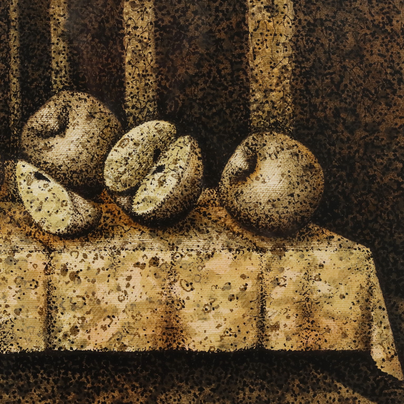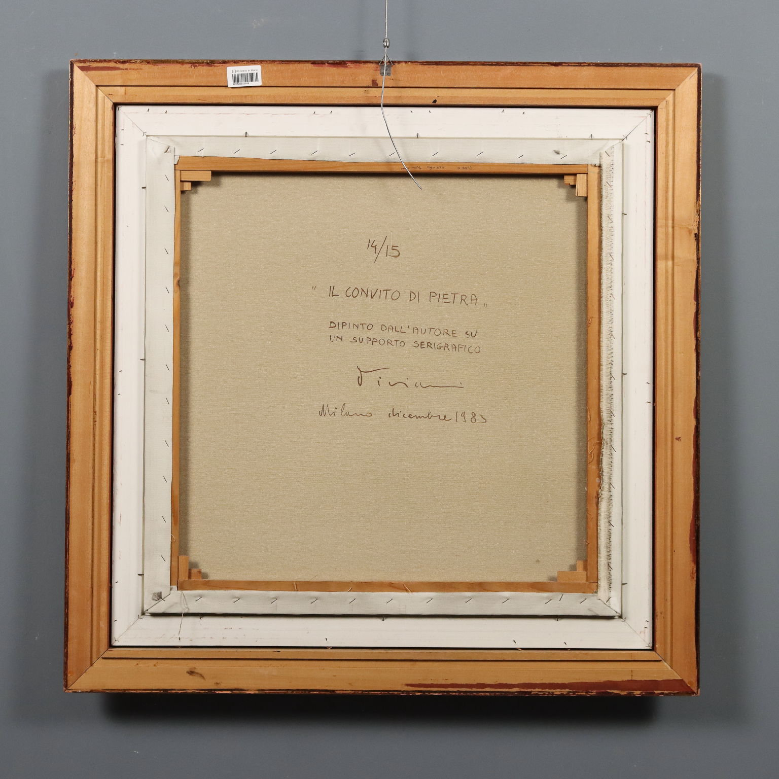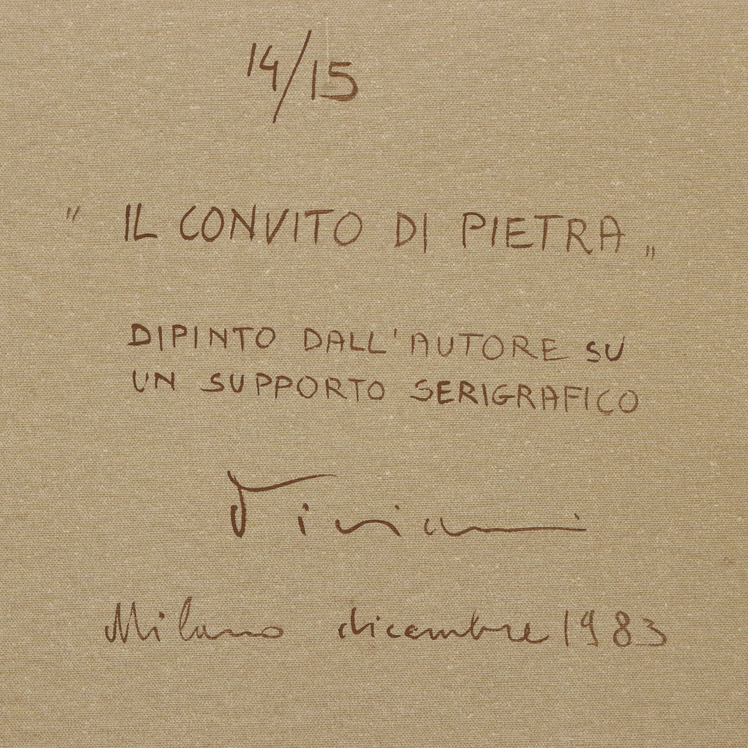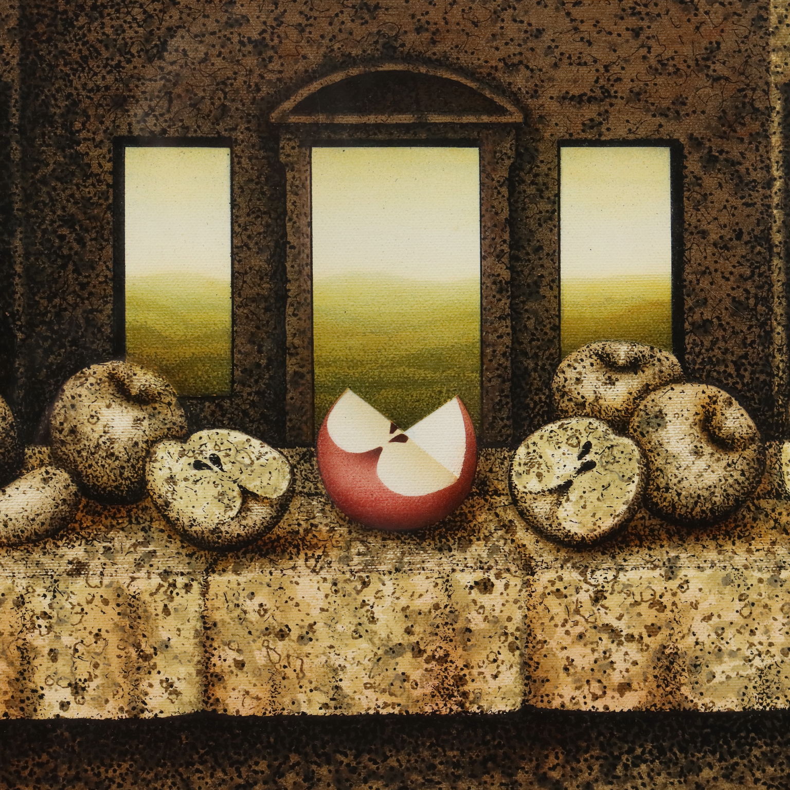 Dipinto su supporto serigrafico, numero di serie 14/15. Firmato e datato in basso al centro. Al retro il titolo e ulteriore firma. L'artista nel 1983 ha riproposto in quindici versioni diverse la celebre opera leonardesca dell' Ultima Cena. La produzione pittorica di Vanni Viviani è stata improntata dapprima sulla figurazione pittorica e scultorea, per poi passare ad una matrice surrealista di stampo magrittiano. Soggetto ricorrente nelle sue opere è la Mela, intesa come simbolo allusivo ed erotico, frutto delle religioni, delle favole, della scienza e degli eroi, che evoca importanti momenti del passato, fino a diventare simbolo di vita, di sensualità, luogo delle idee. Opera presentata in cornice.