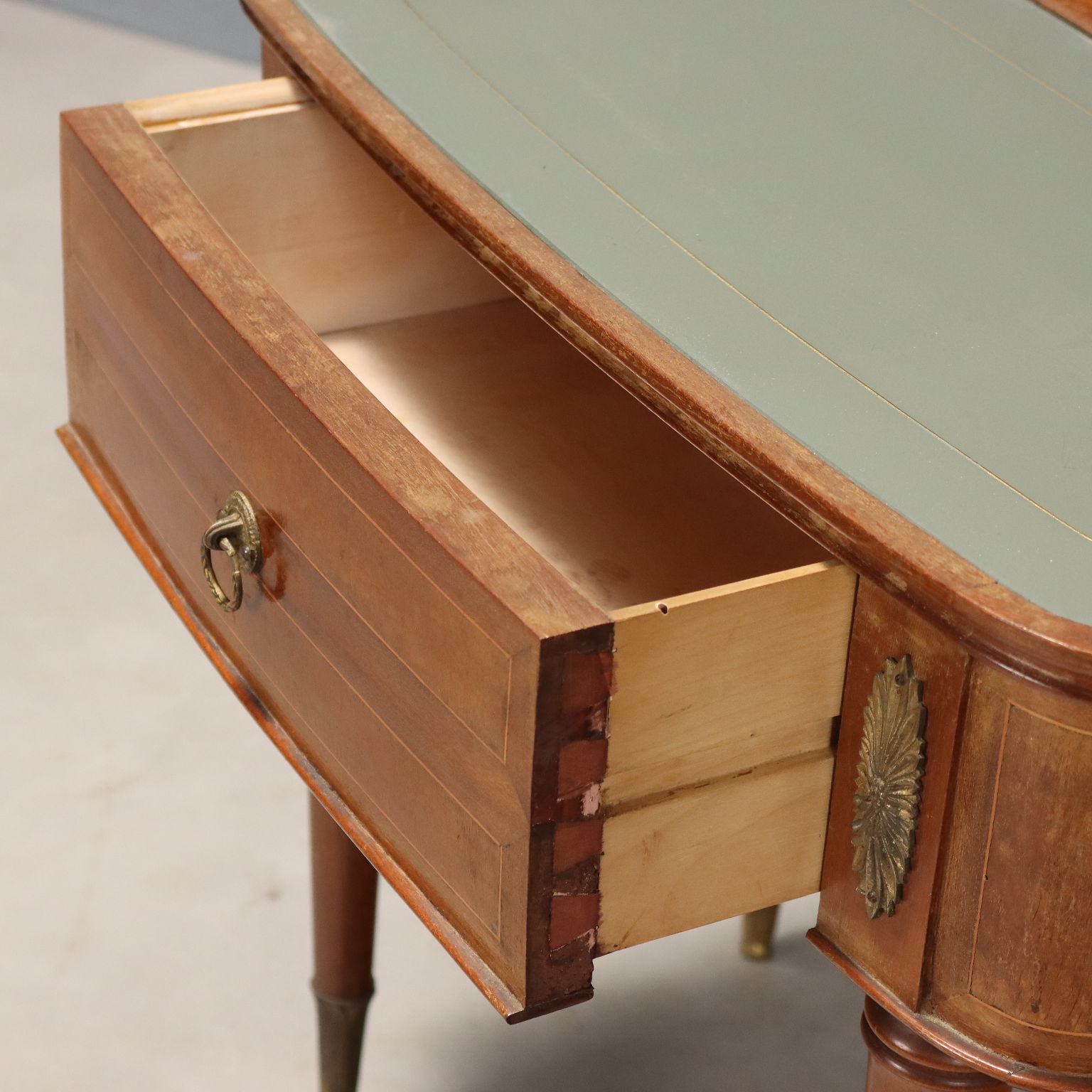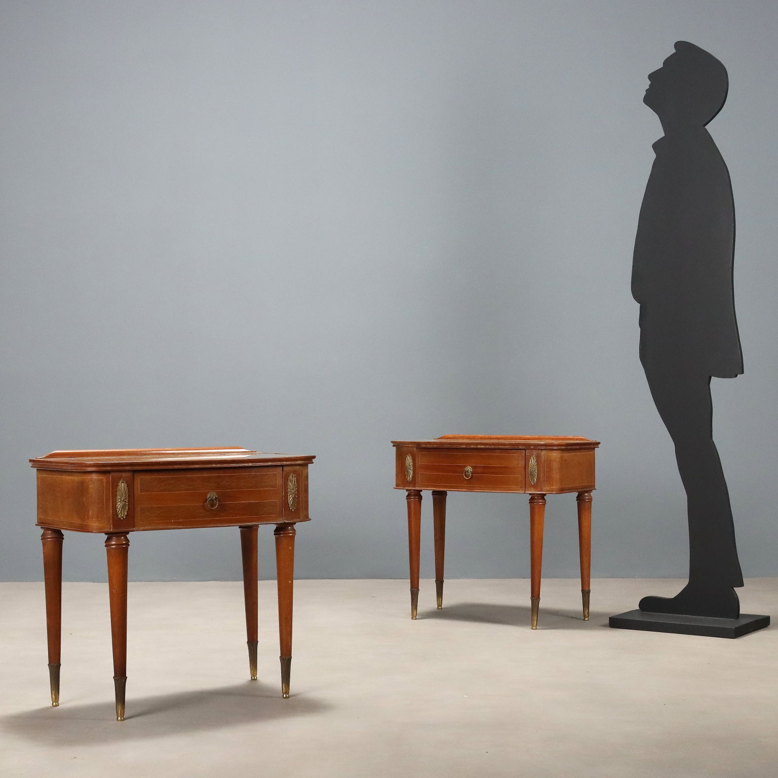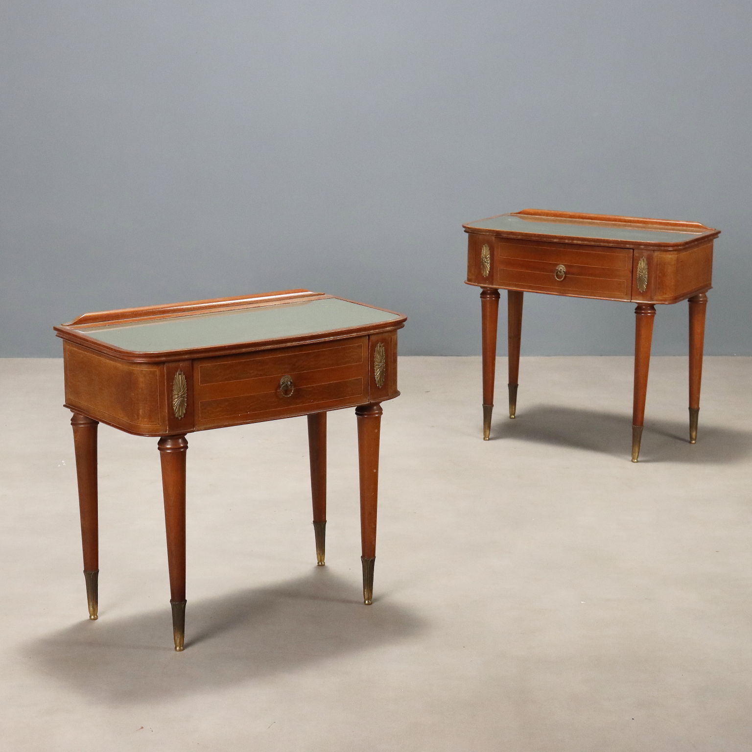 Comodini con cassetto sotto piano, legno impiallacciato radica, gambe in legno di Faggio tinto, piano in vetro retro trattato, particolari decorativi in ottone.