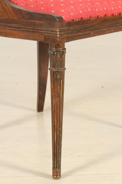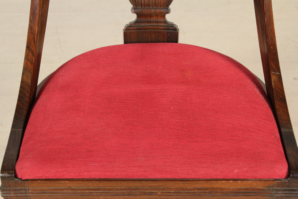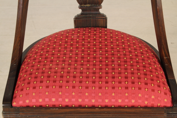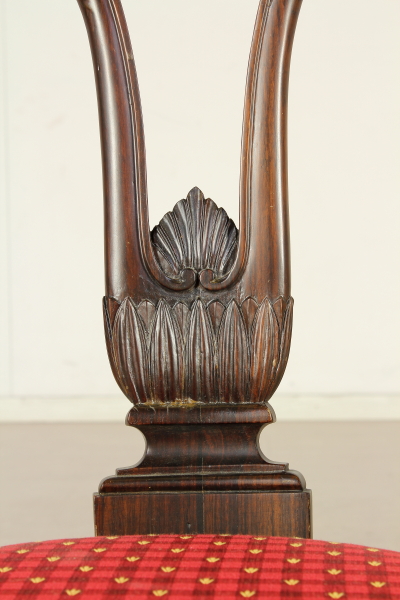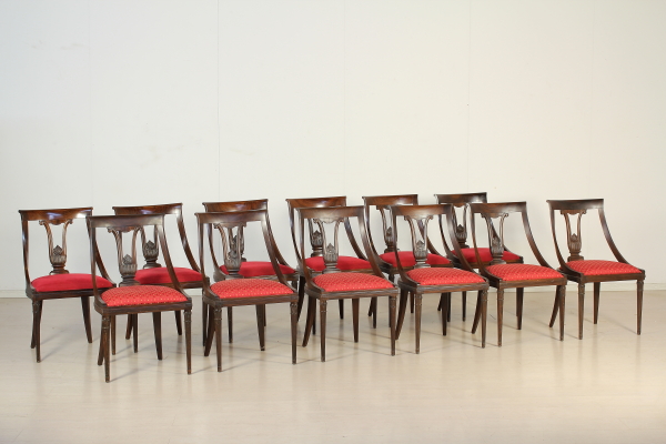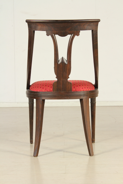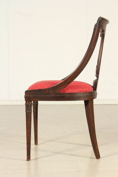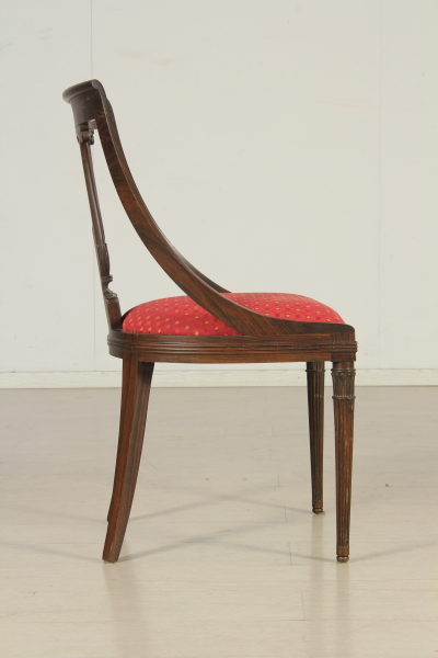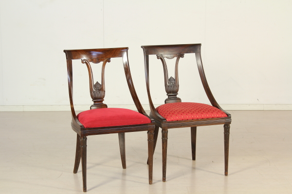 Sedie "a gondola" con gambe anteriori e cartella intagliate. Seduta imbottita e schienale a giorno.