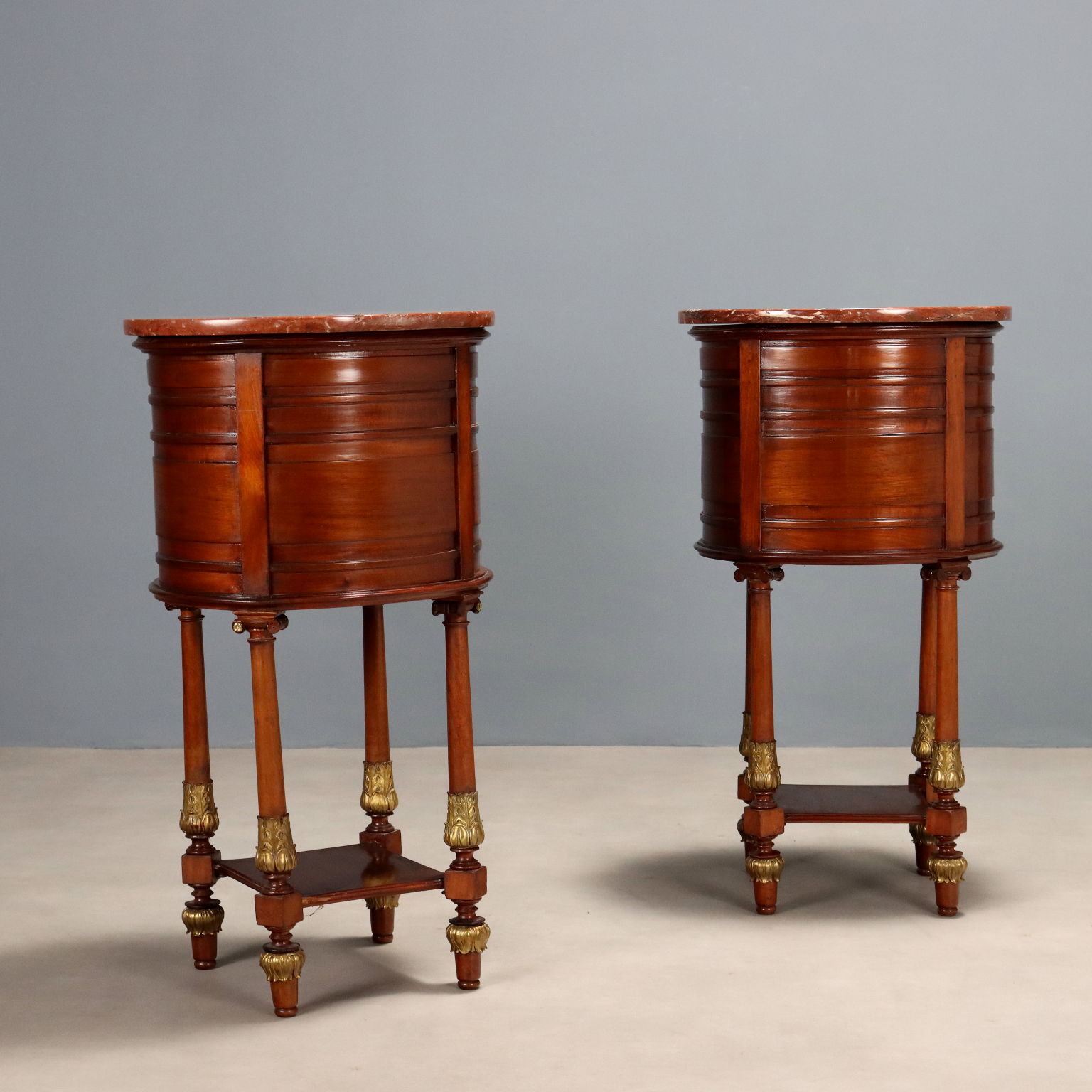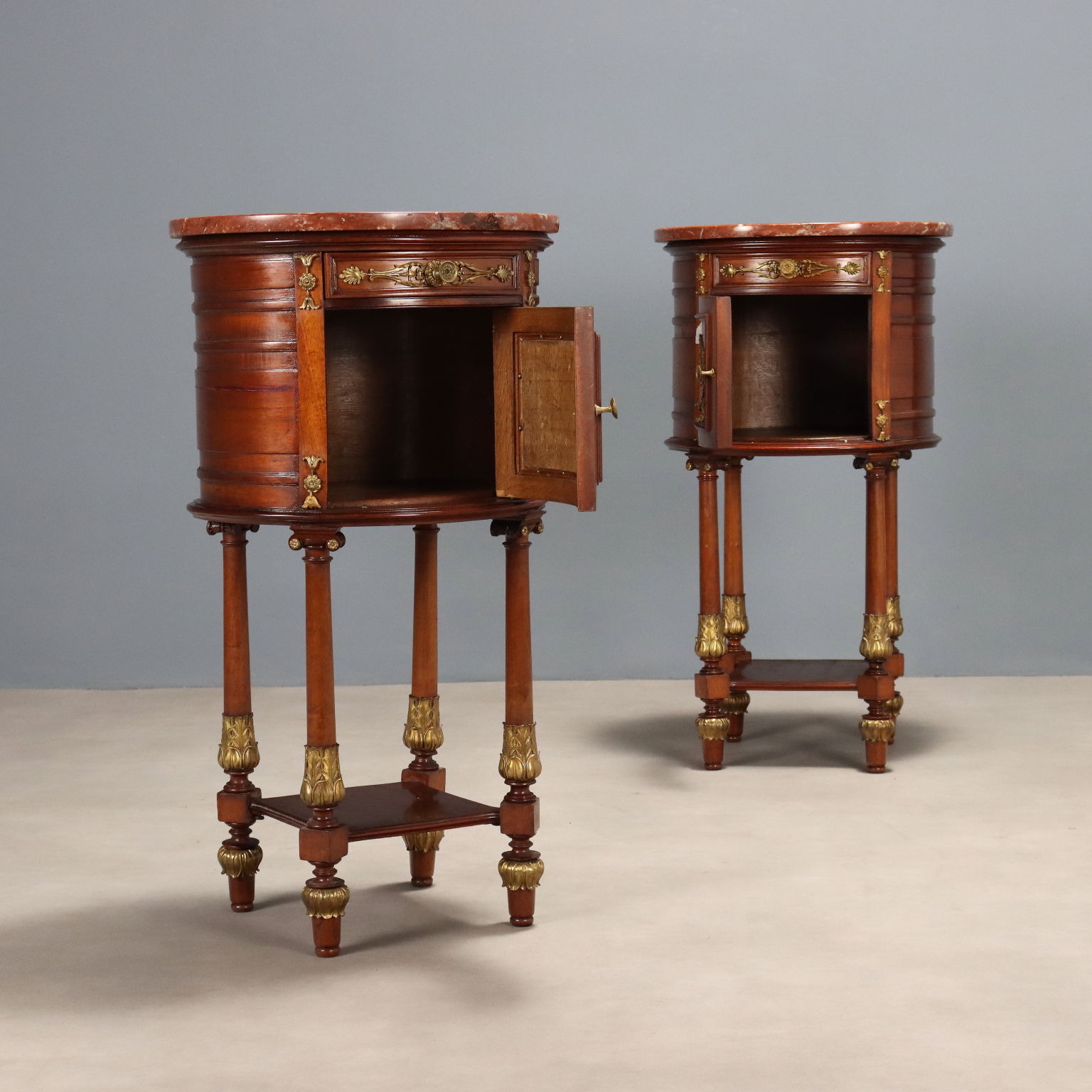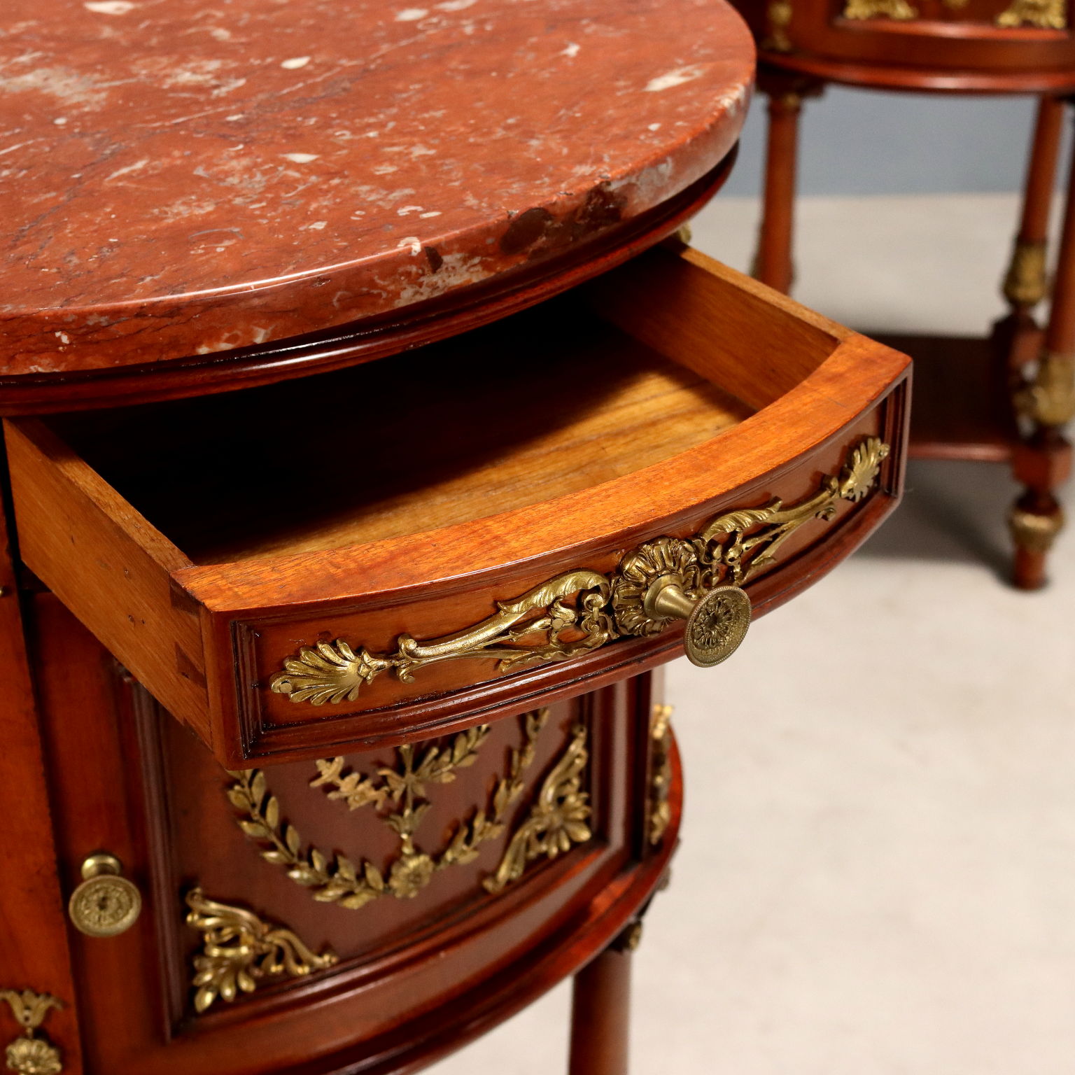 Coppia di comodini ovali in mogano. Piano in marmo rosso, cassettino nella fascia sotto piano e anta centrale, quattro gambe tornite e unite alla base da ripiano. Applicazioni in bronzo cesellato e dorato sul fronte e nelle gambe, interni in rovere. Francia, inizio XX Secolo.