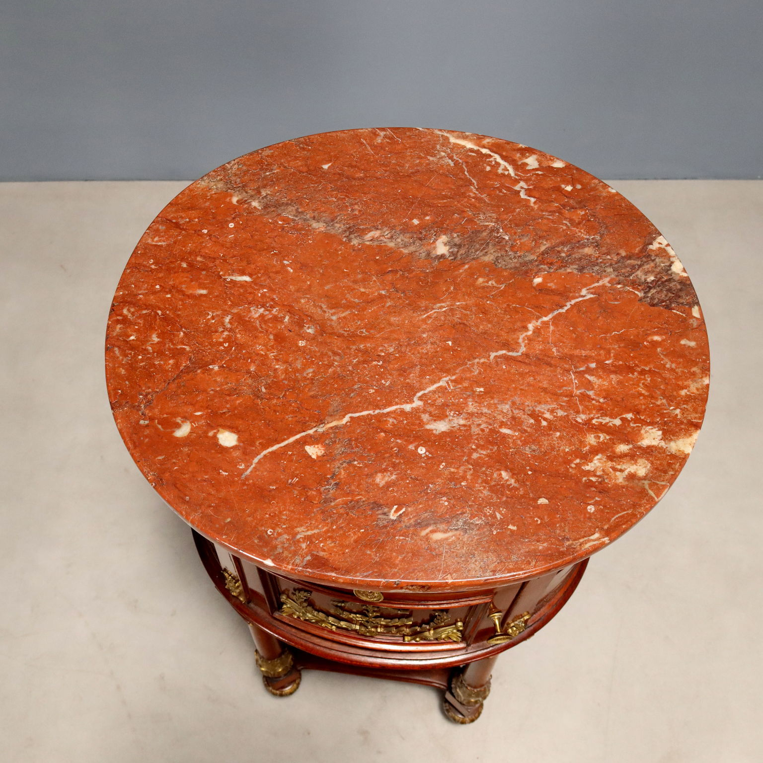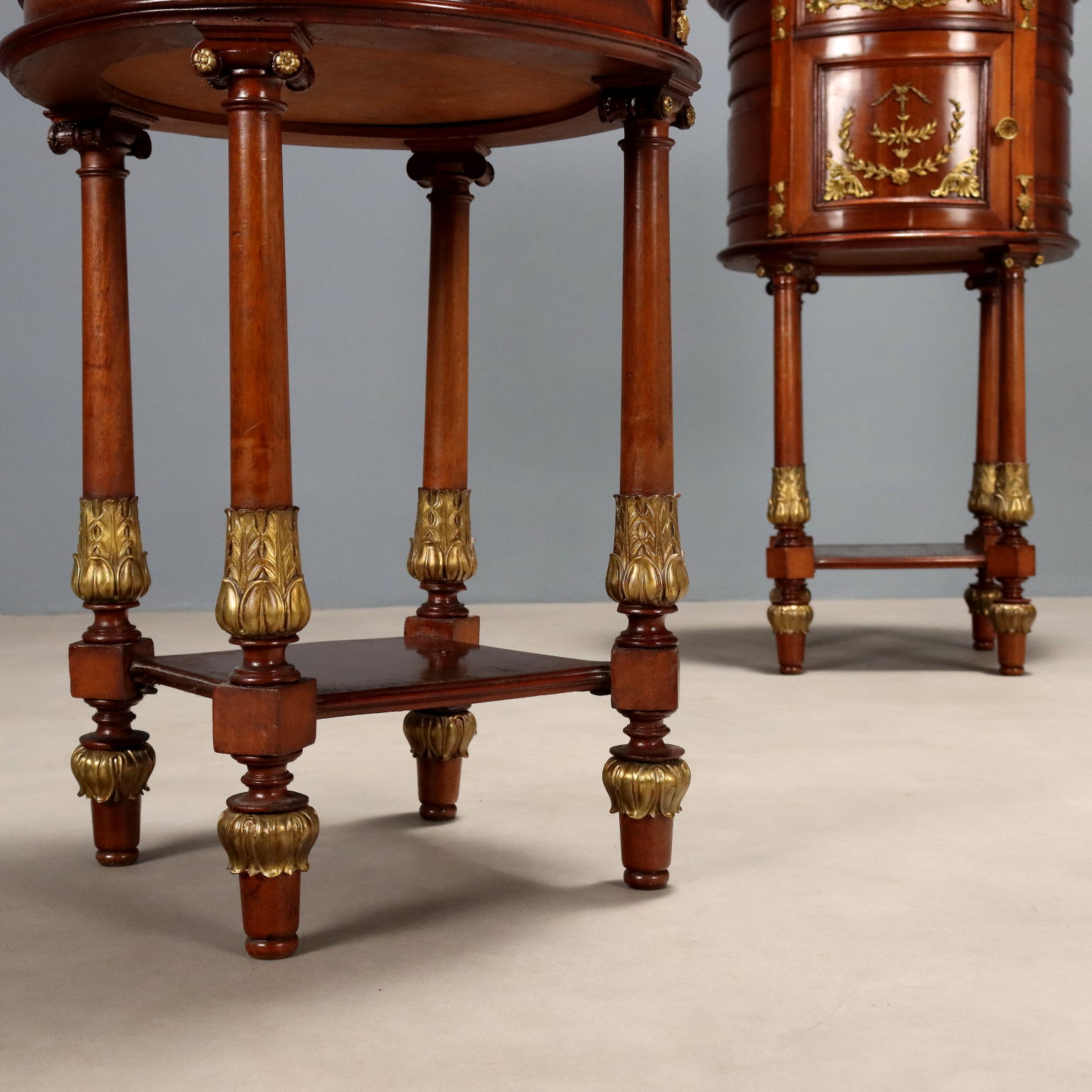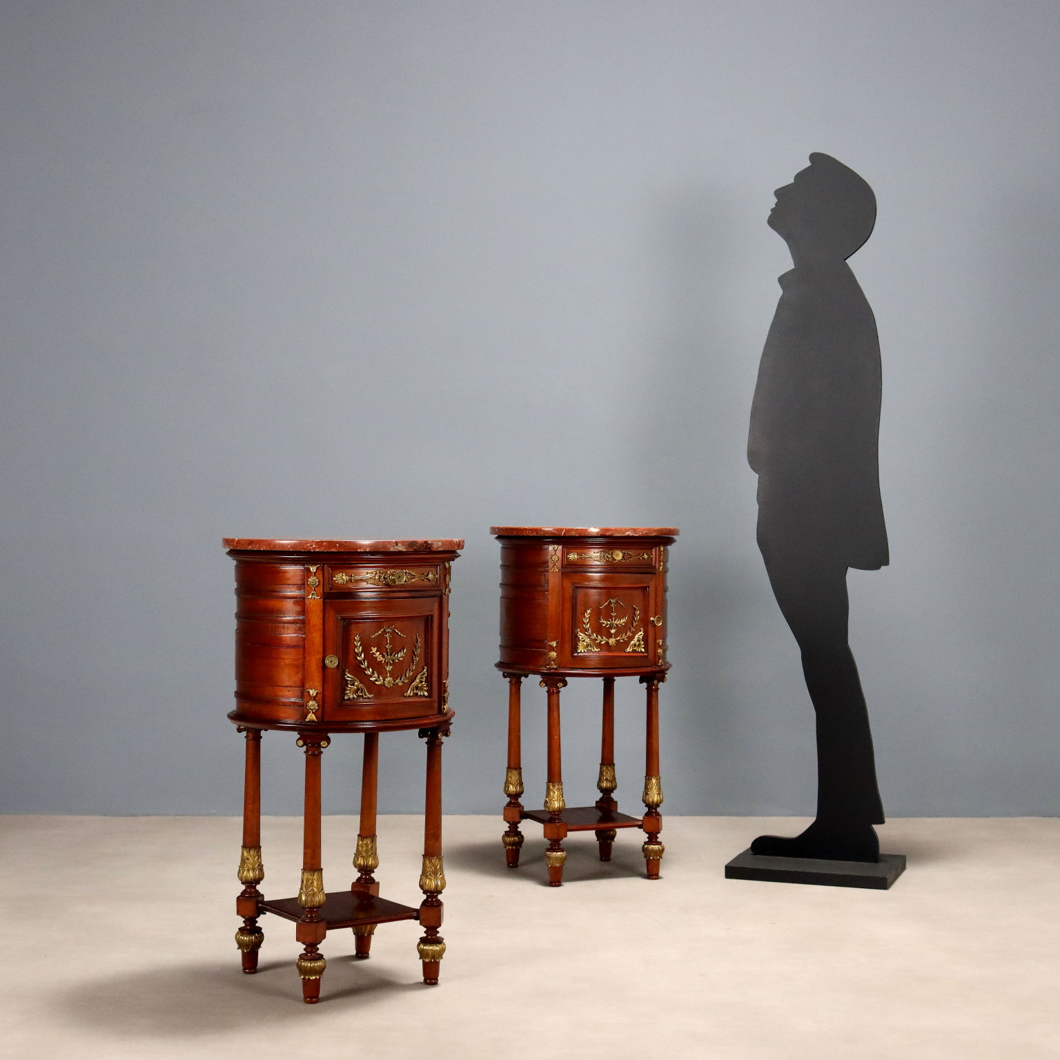Coppia di comodini ovali in mogano. Piano in marmo rosso, cassettino nella fascia sotto piano e anta centrale, quattro gambe tornite e unite alla base da ripiano. Applicazioni in bronzo cesellato e dorato sul fronte e nelle gambe, interni in rovere. Francia, inizio XX Secolo.