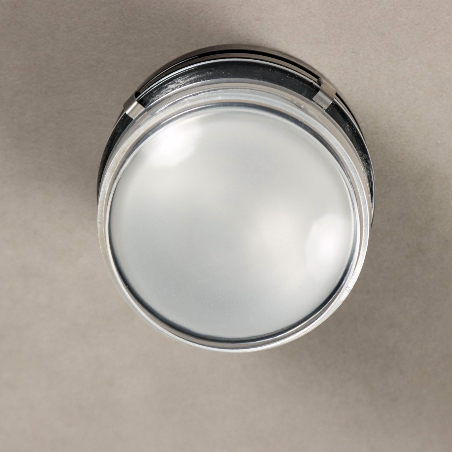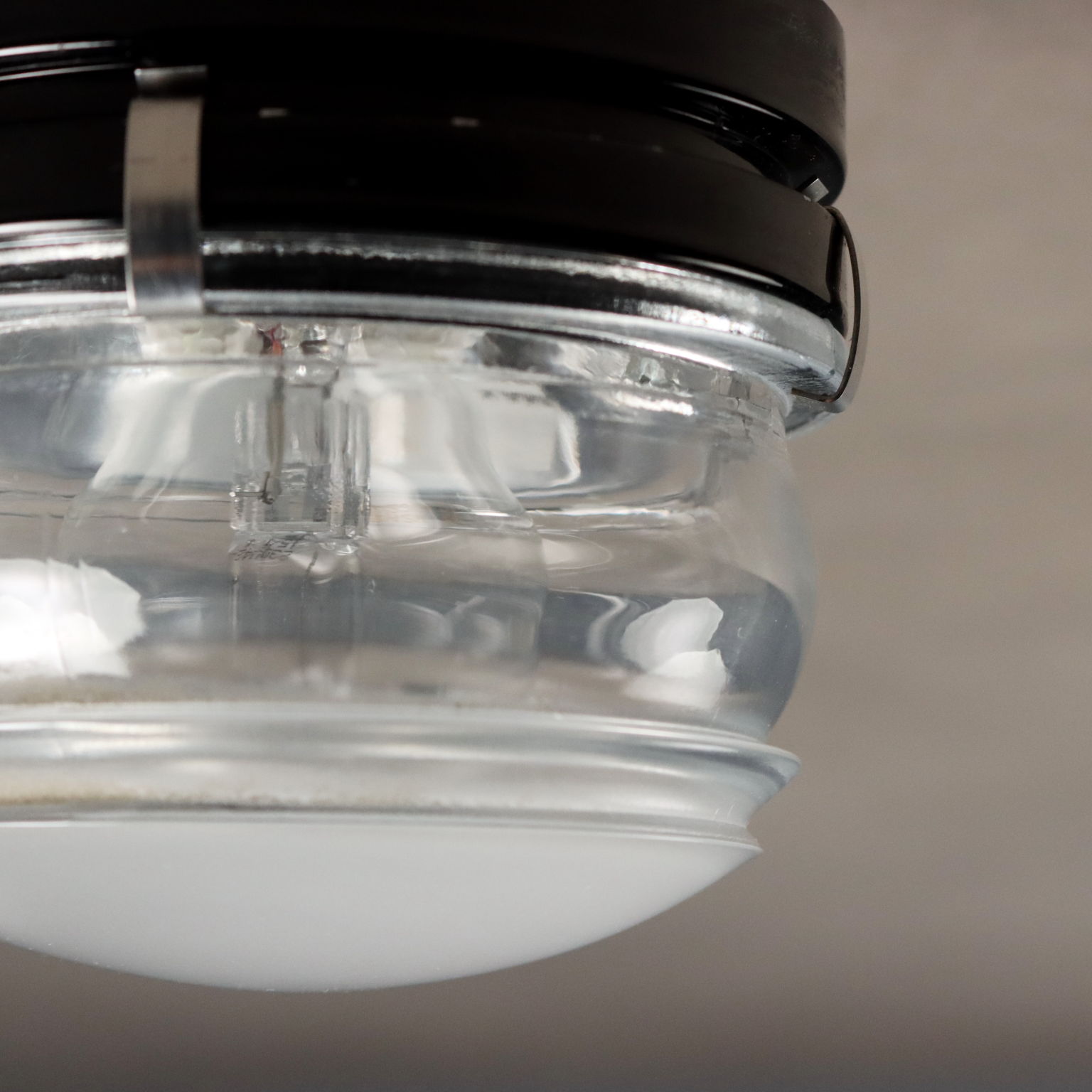 Set di lampade da soffitto o parete per ambienti domestici o esterni disegnate negli anni '60 da Joe Colombo. Presentano il corpo in metallo smaltato nero e il diffusore in vetro in lente Fresnel. Presenta 1 Attacco E14.