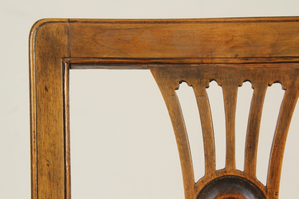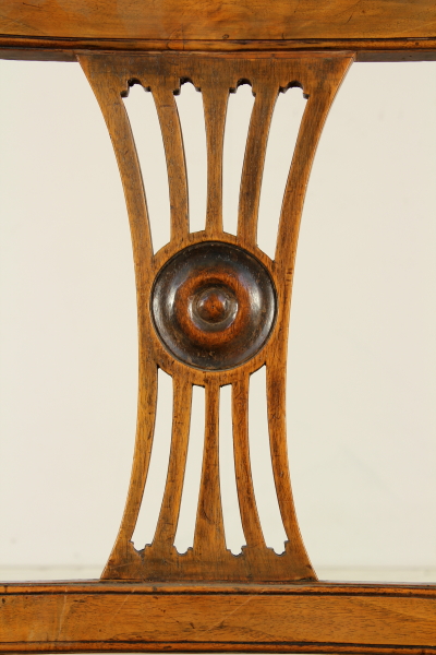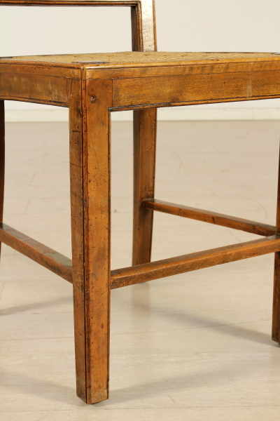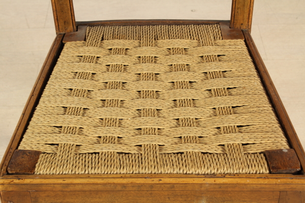 Gambe raccordate da traverse, schienale a giorno con cartella traforata. Seduta in corda.