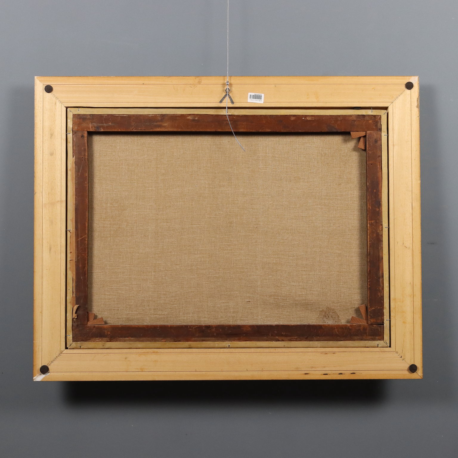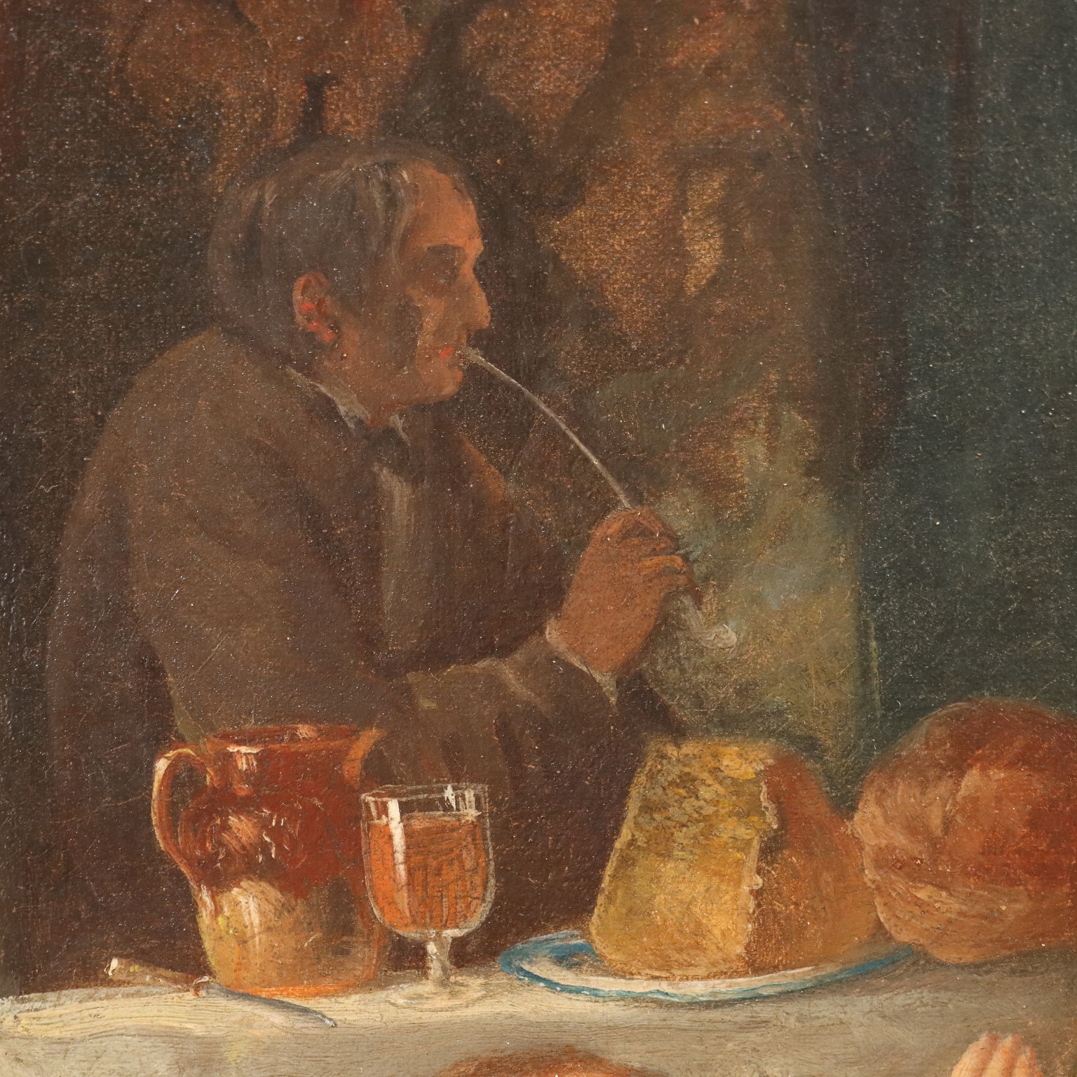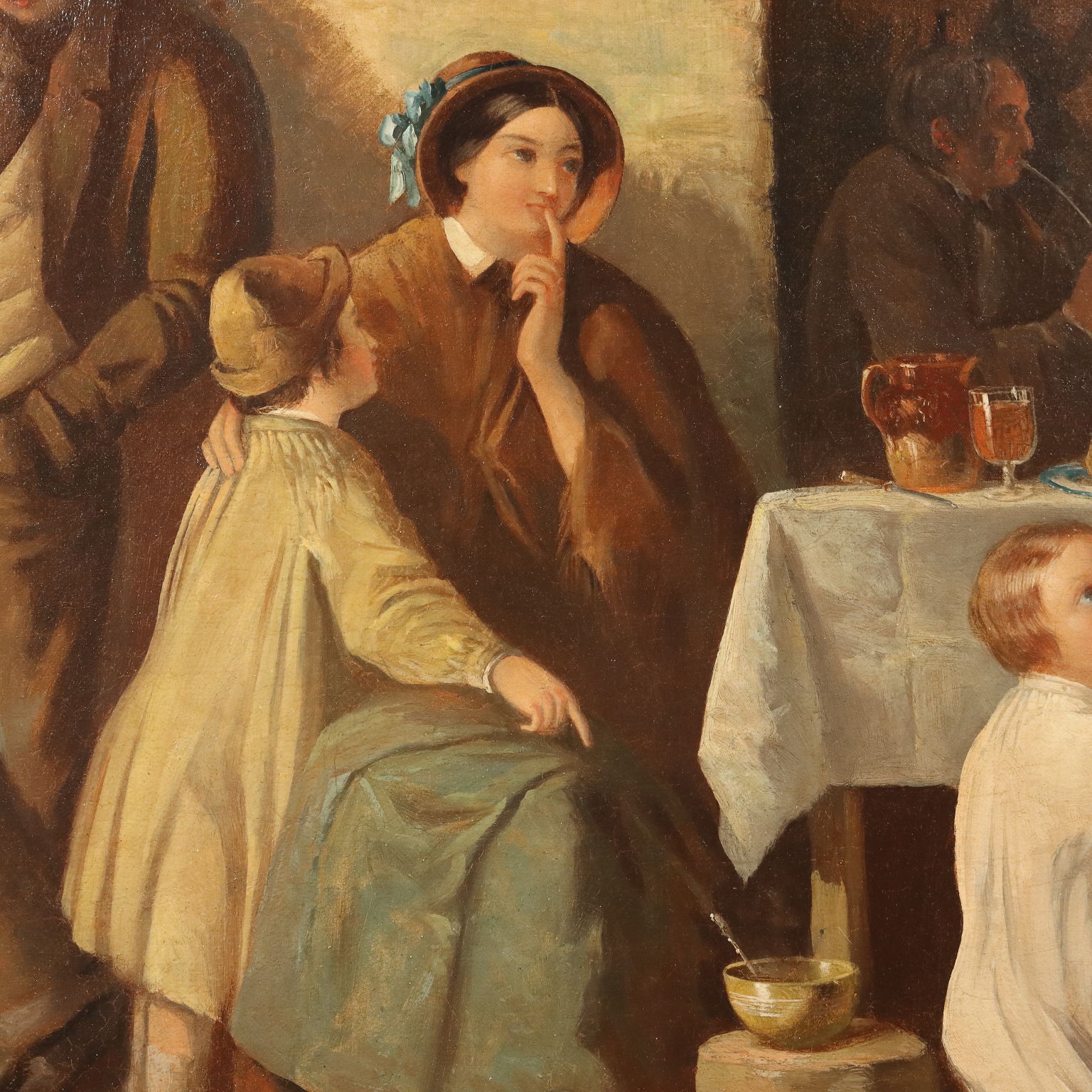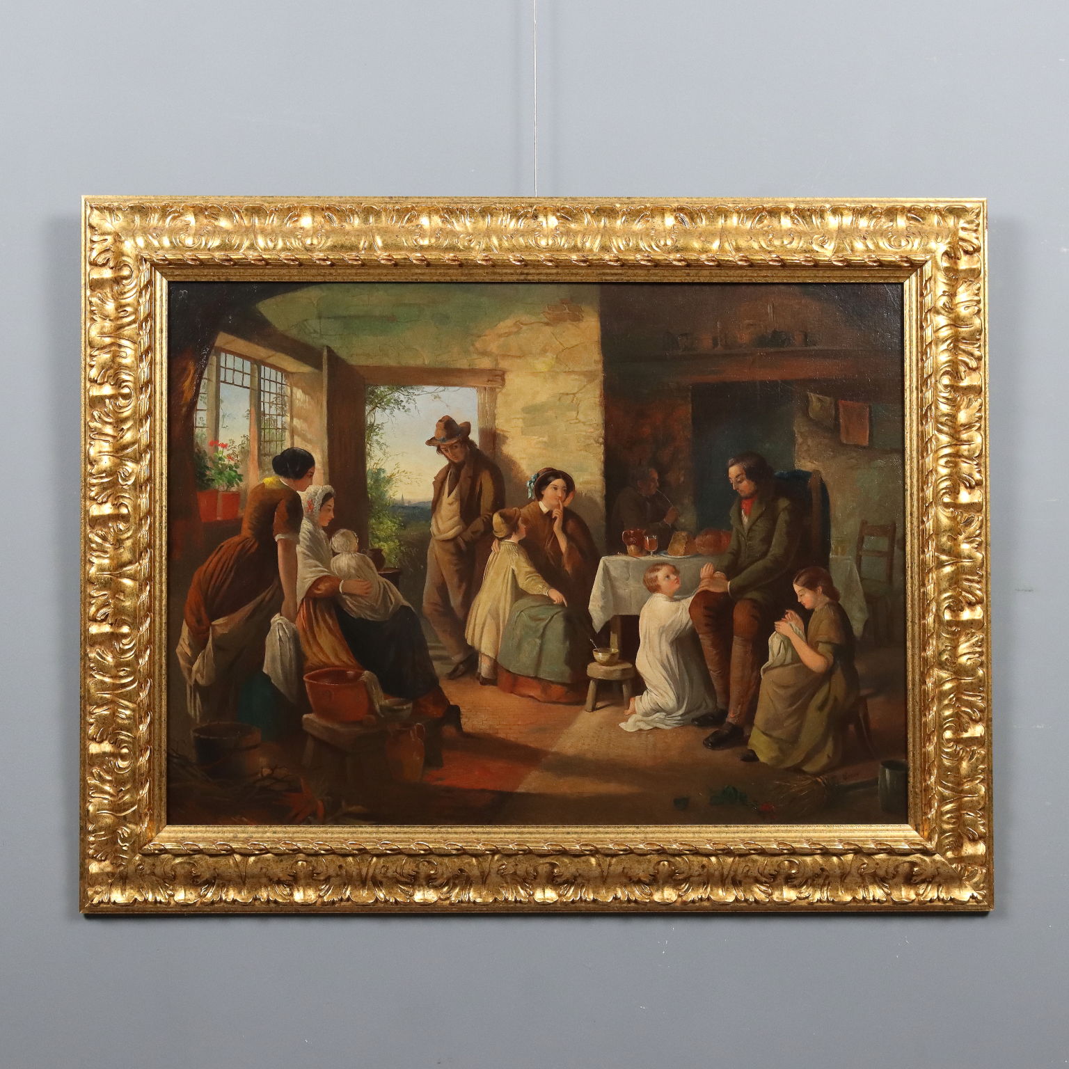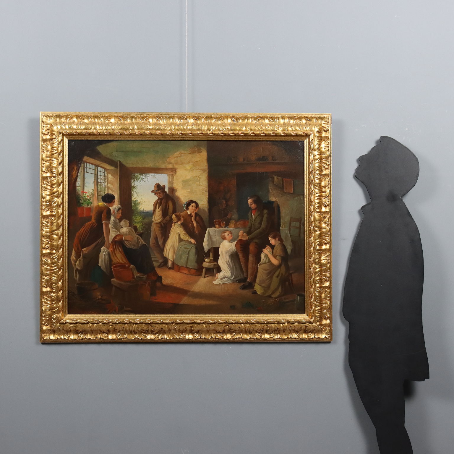 Olio su tela. Scuola inglese di inizio '900. Firma non identificata in basso a destra. L'opera riprende il filone ottocentesco che raffigura interni con scene familiari. In questa scena. che si svolge all' interno probabilmente di un posto di ristoro, la madre e i tre figlioli sulla destra sembra stiano salutando il padre in partenza, mentre sulla sinistra un altro nucleo osserva, insieme alla servetta che sta facendo le pulizie. Non c'è dramma, anche il fanciullino in ginocchio davanti al padre pare piuttosto che gli stia chiedendo affettuosamente un ultimo abbraccio. Il dipinto è presentato in cornice in stile.