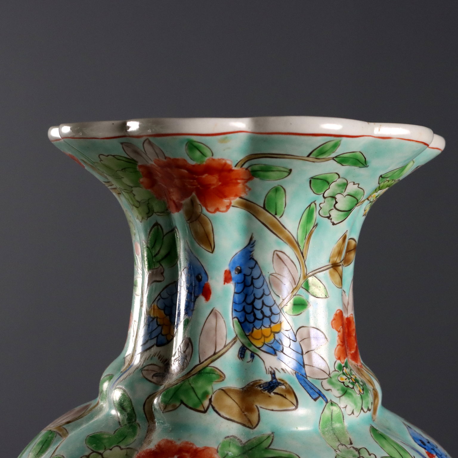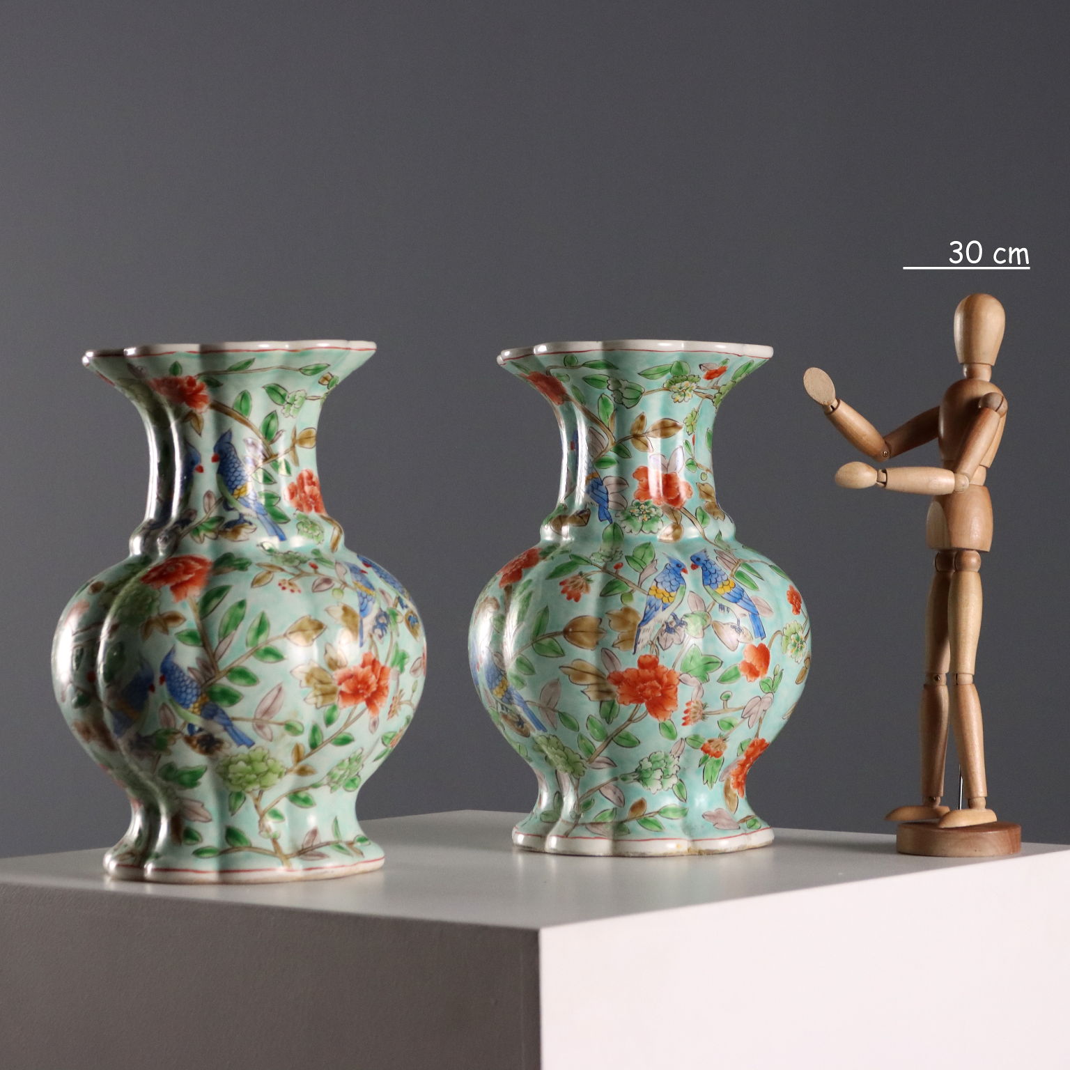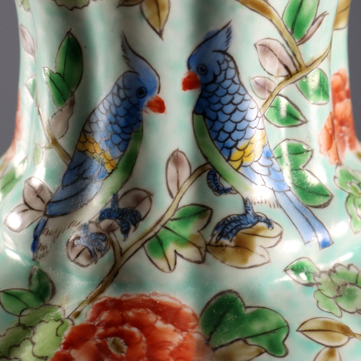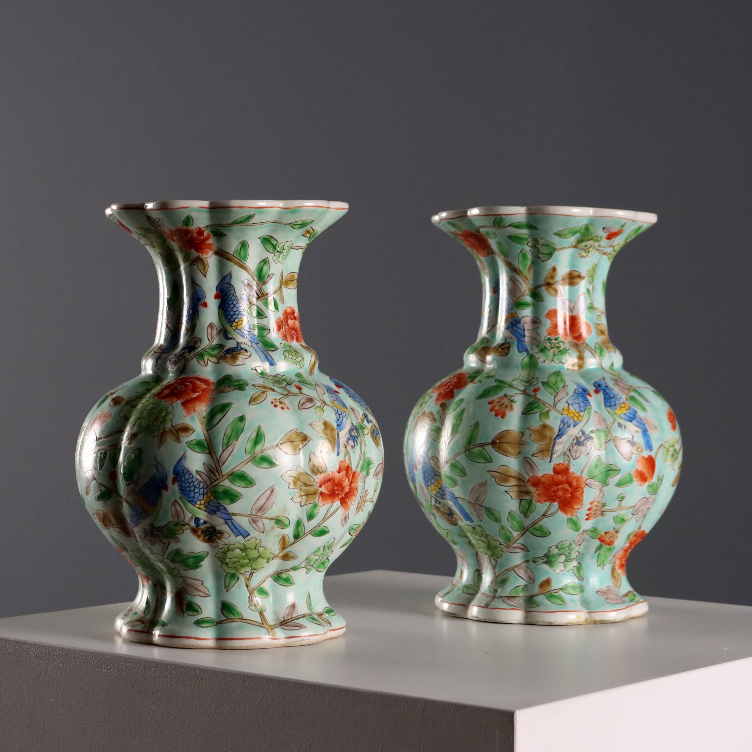 Coppia di vasi in porcellana color celadon con decori policromi a fiori, peonie e uccelli. Marchio sotto la base.