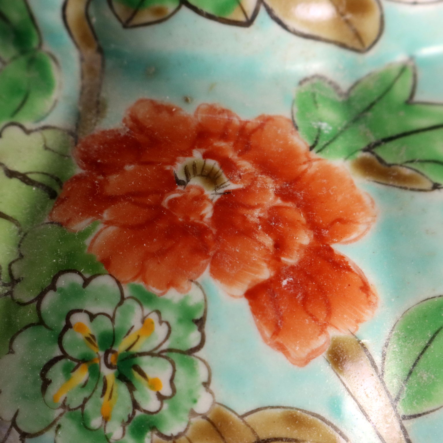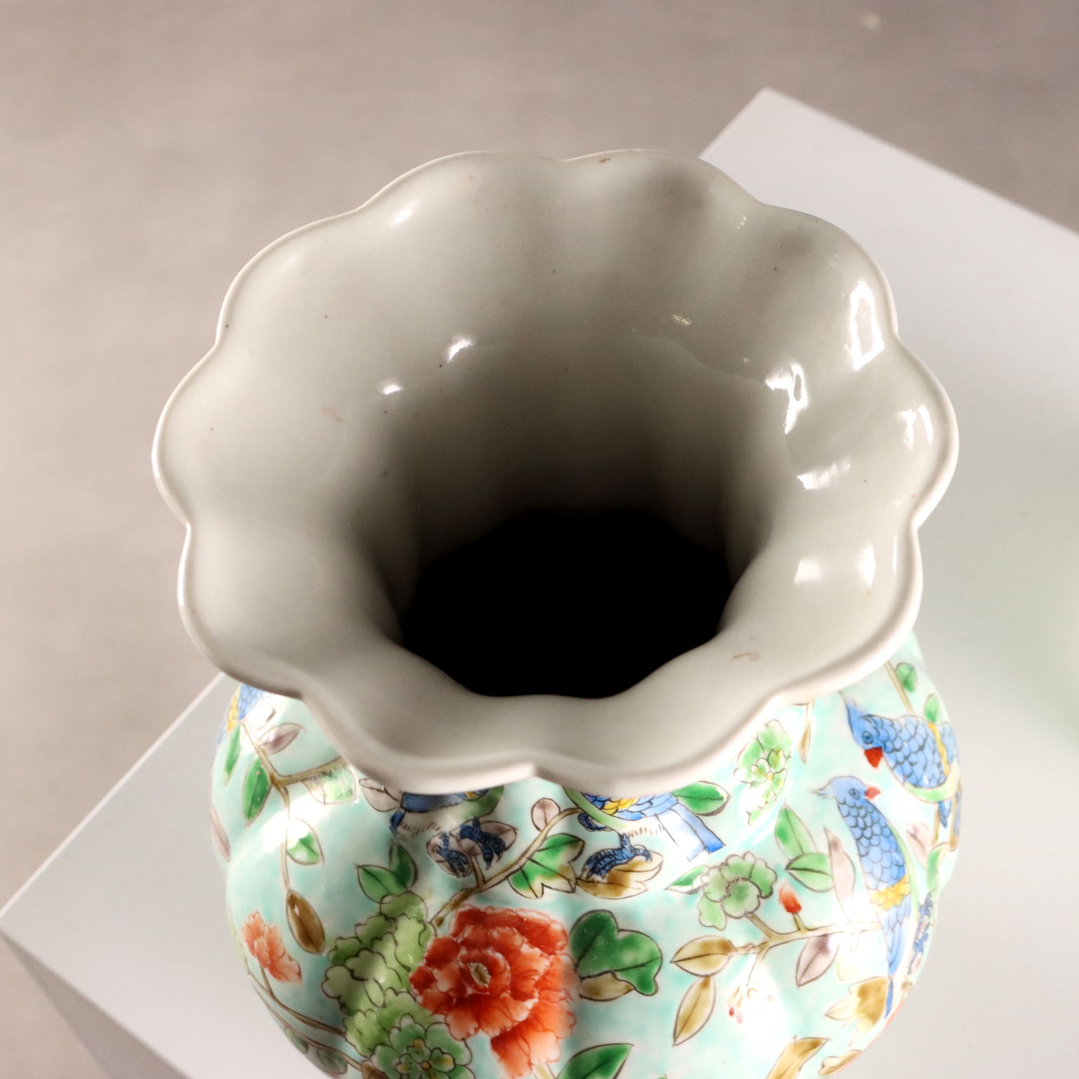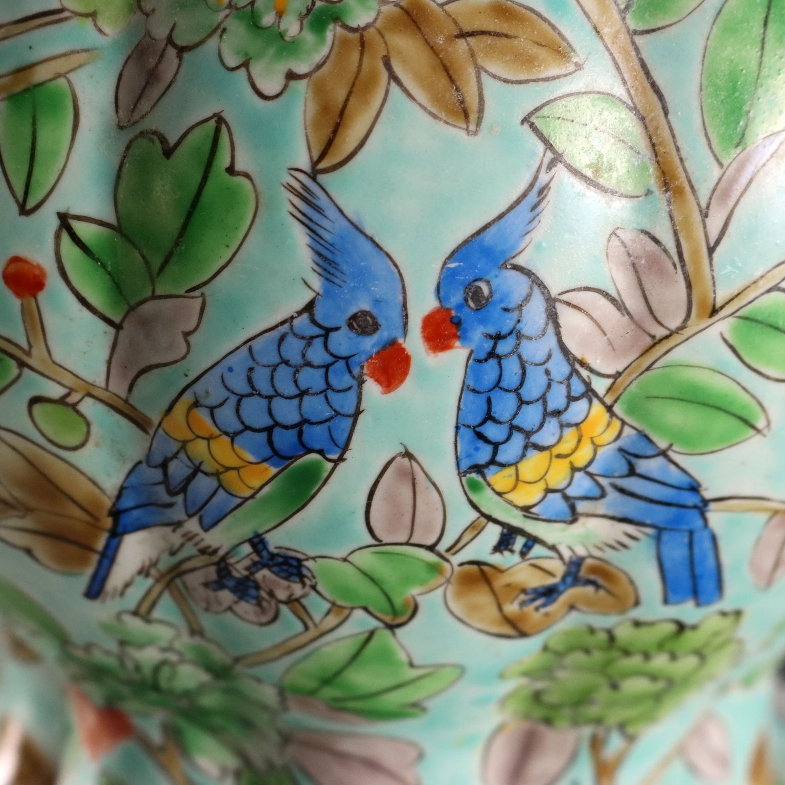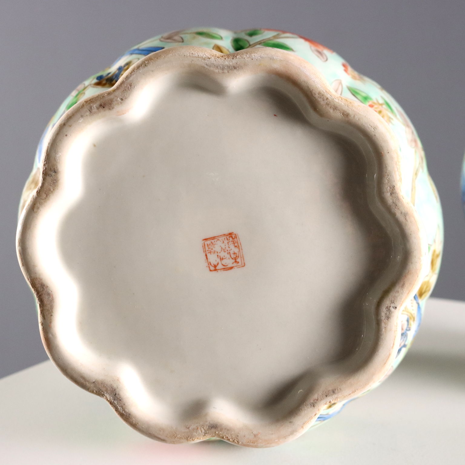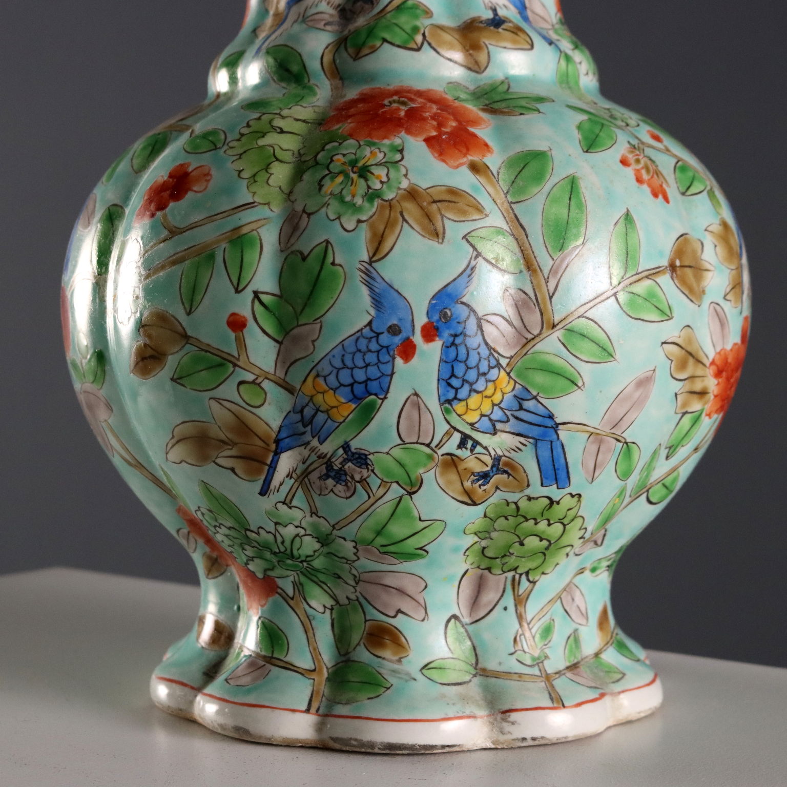 Coppia di vasi in porcellana color celadon con decori policromi a fiori, peonie e uccelli. Marchio sotto la base.