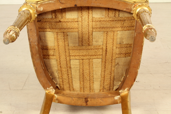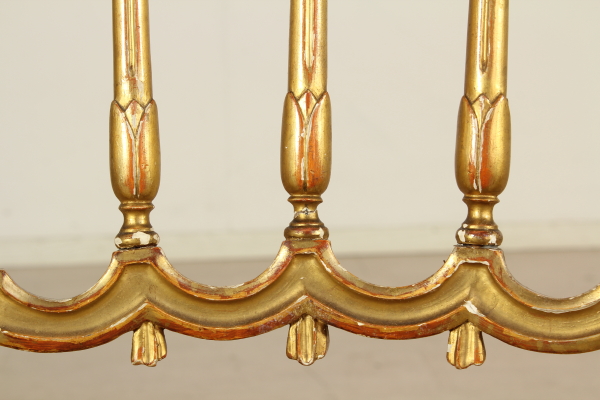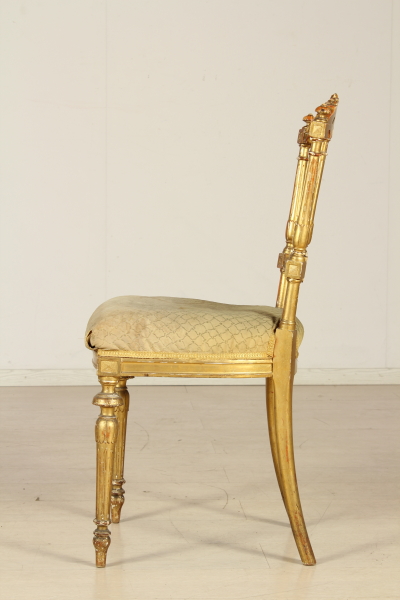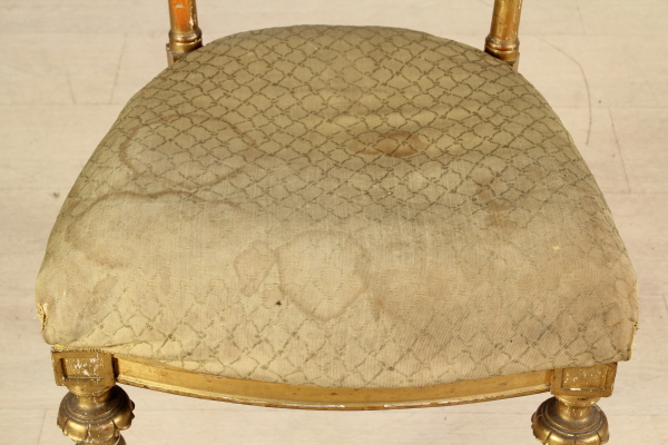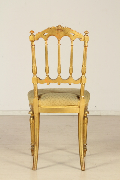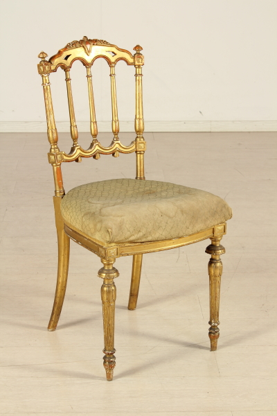 Gambe anteriori tornite e intagliate. Schienale a giorno con torniture e intagli. Seduta imbottita. Interamente dorata.