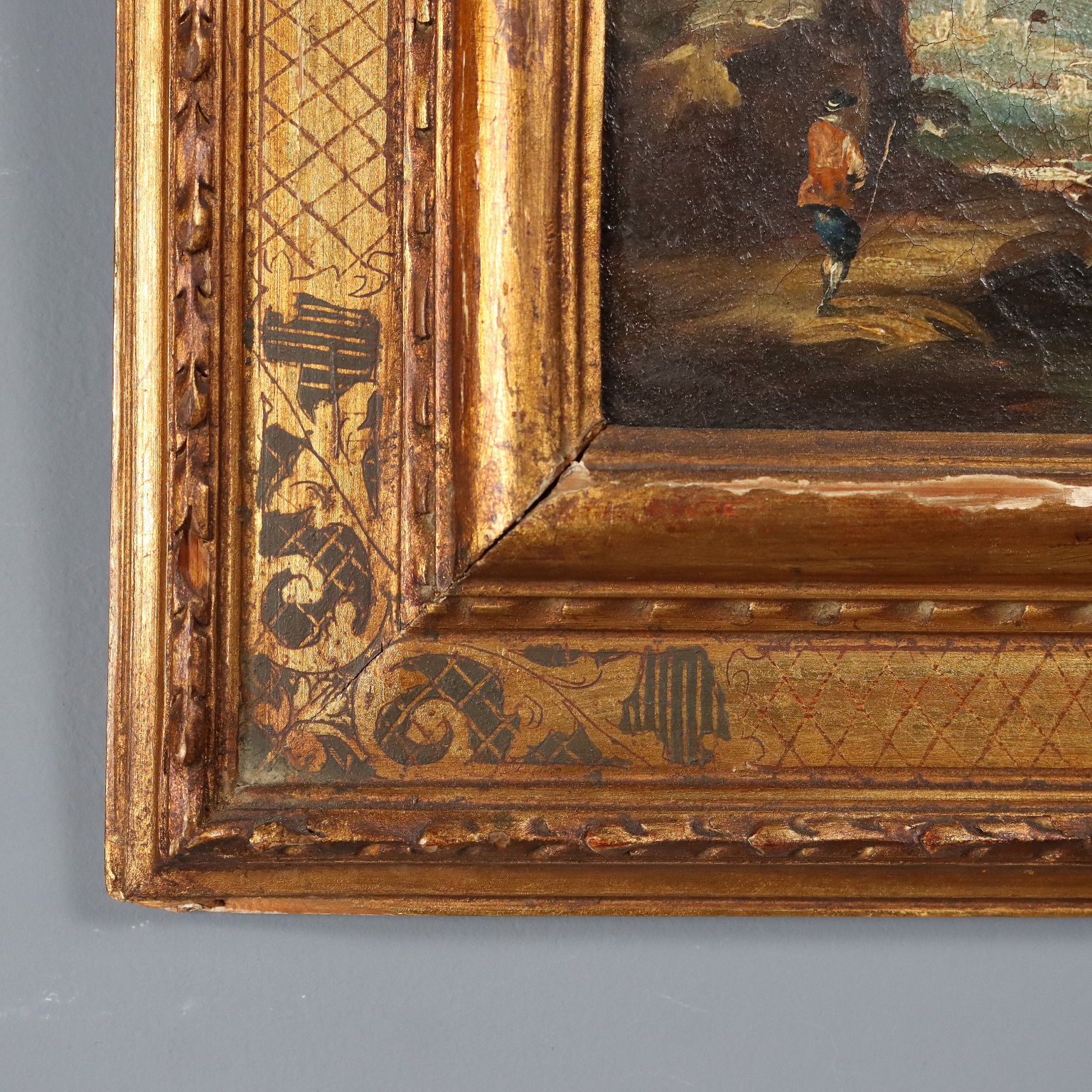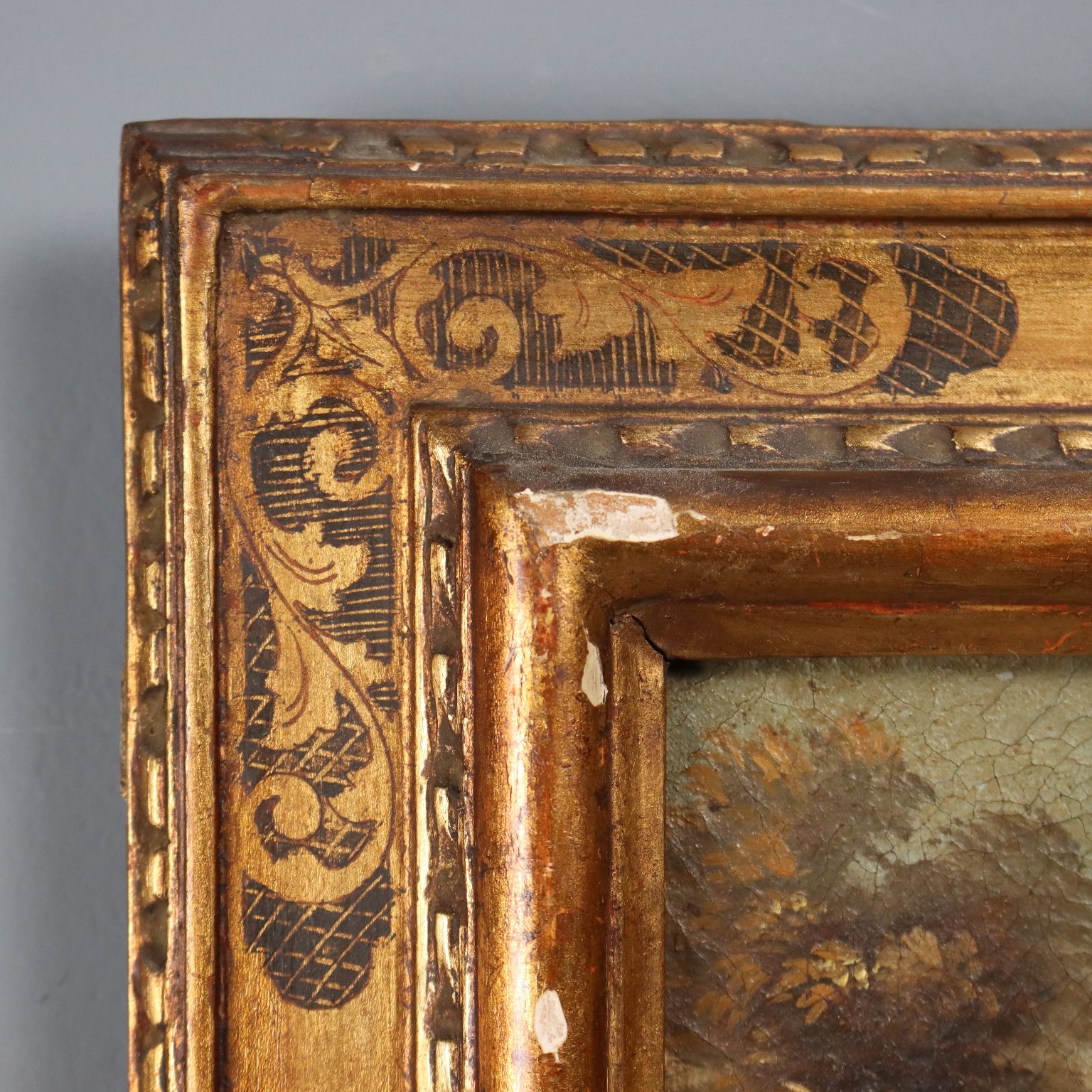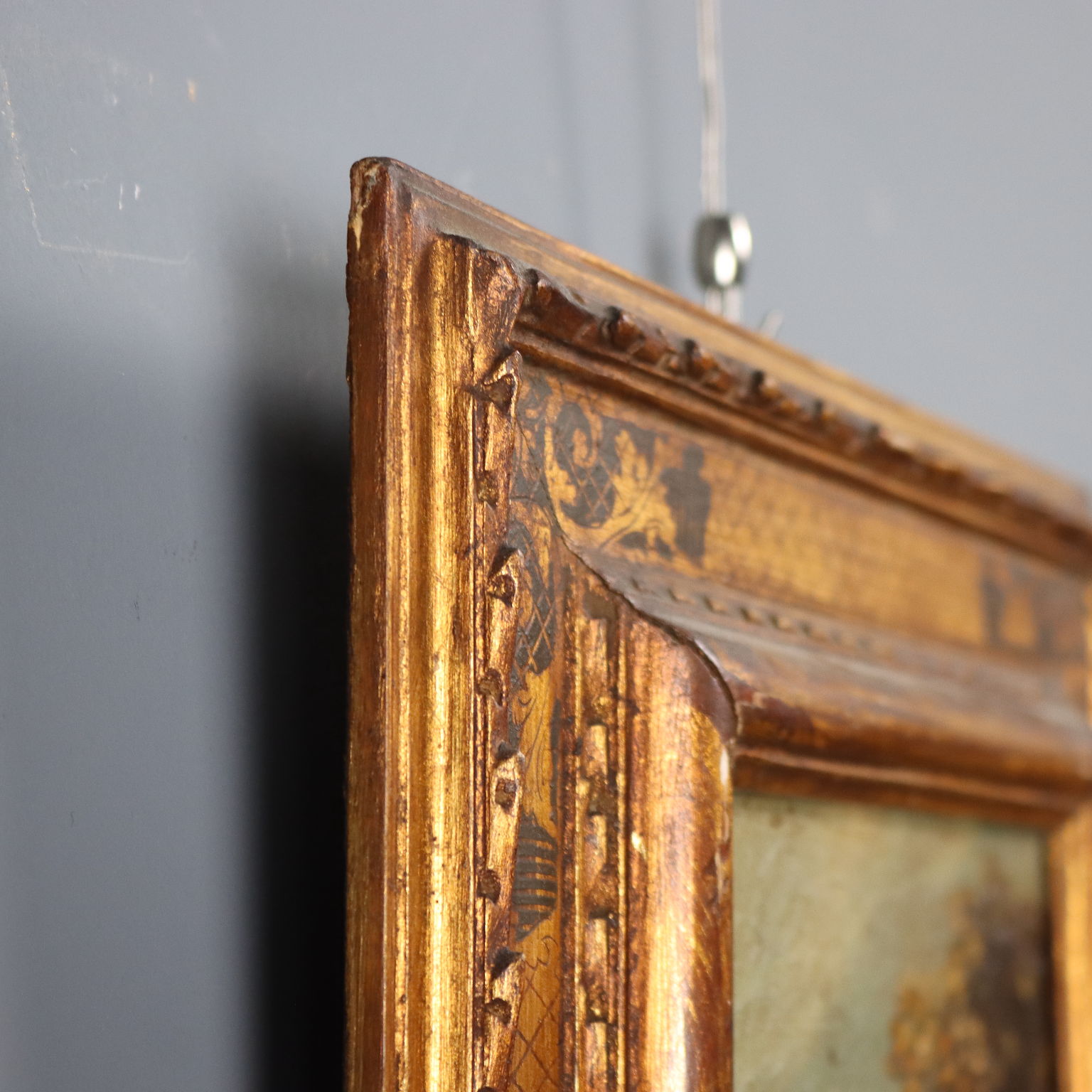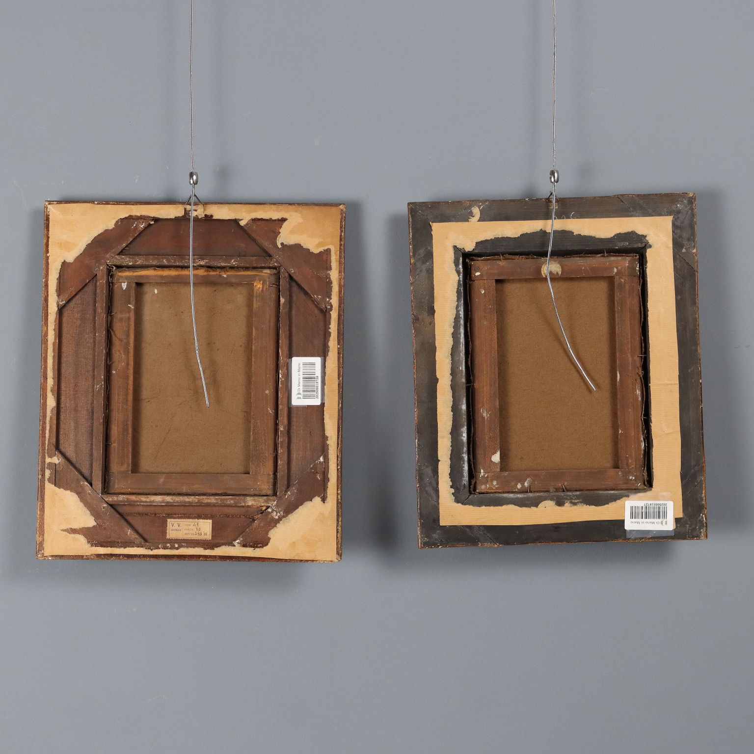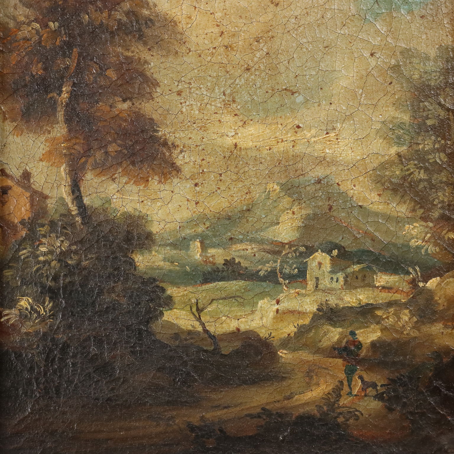 Olio su tela. I due piccoli paesaggi, che propongono scorci di campagna, l'uno con un torrente l'altro con un sentiero che conduce ad un piccolo borgo, e animati da figure, imitano la pittura paesaggistica del XVIII secolo. Sono presentati in cornici in stile.