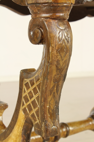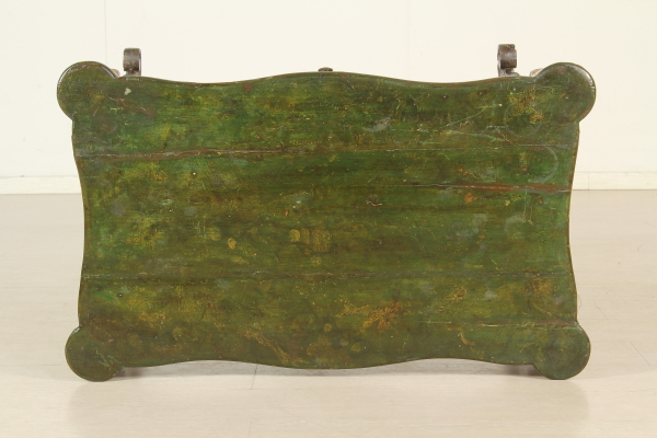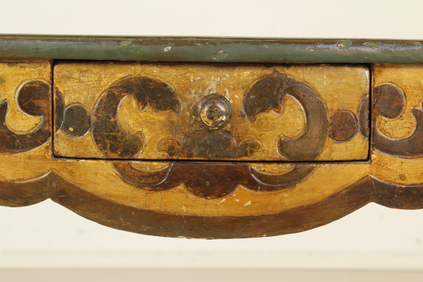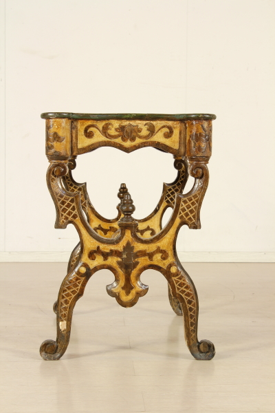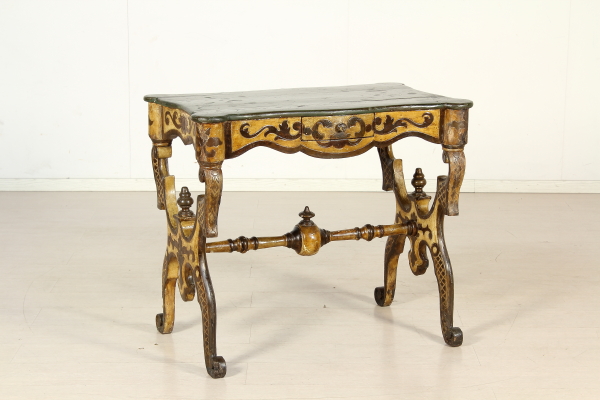 Retto da gambe mosse e intagliate raccordate da traversa tornita, presenta una fascia sagomata e intagliata che cela al suo interno un cassetto. Il piano è sagomato. Il tavolo è interamente laccato e decorato in policromia.