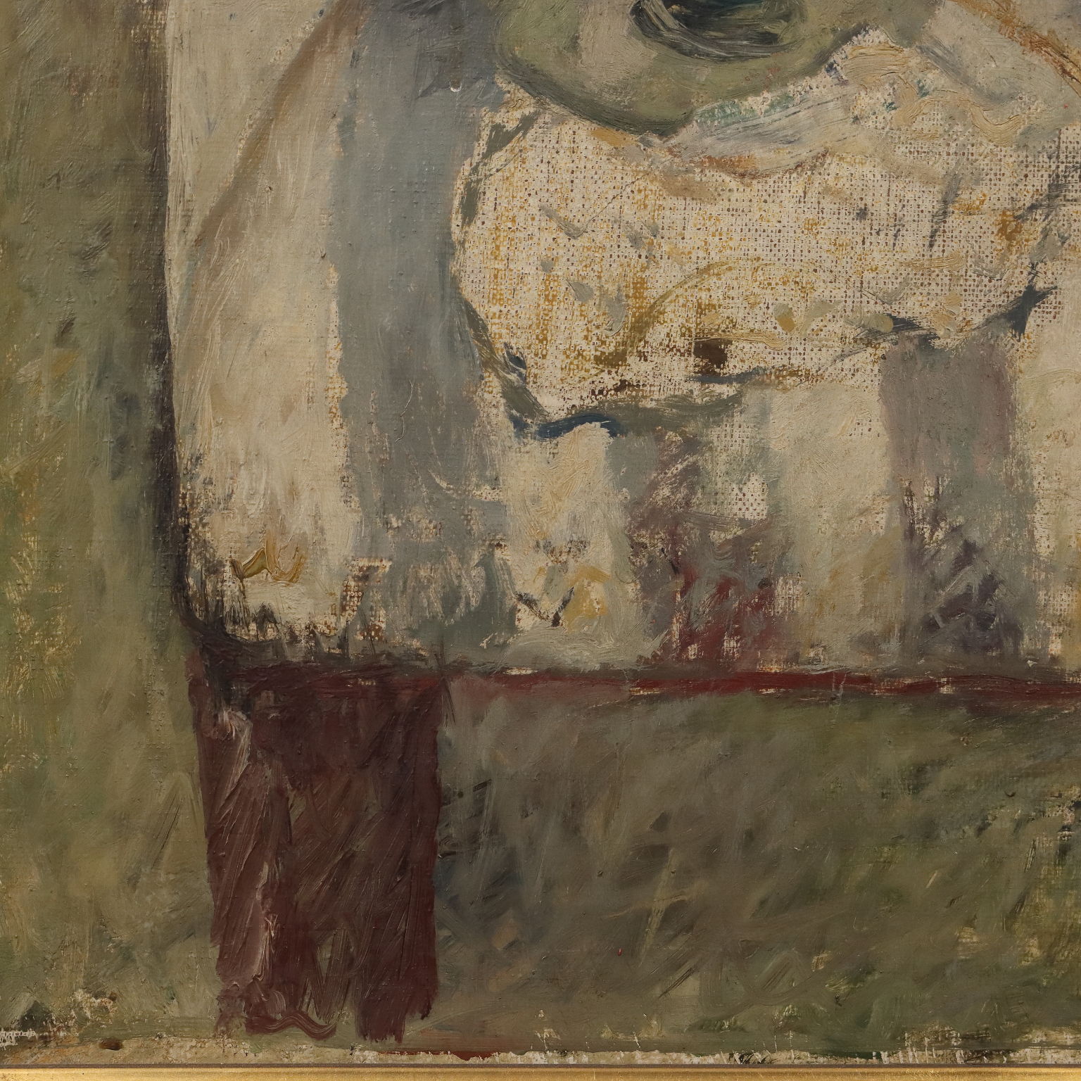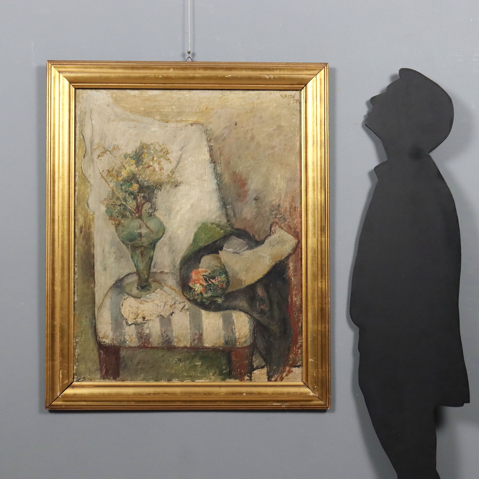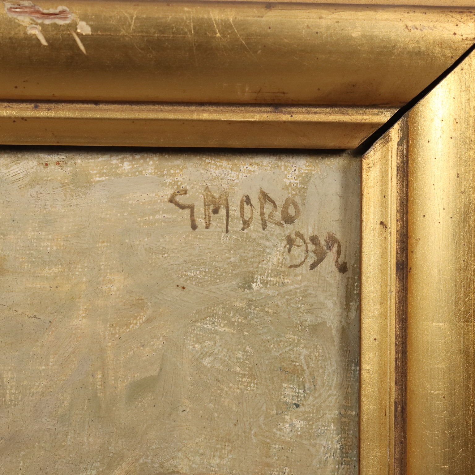 Olio su tela. Firmato e datato in alto a destra. Il pittore milanese Gino Moro si dedicò nella prima parte della sua carriera alla pittura di paesaggio, alle nature morte e ai nudi, realizzati con toni cromatici "bassi", mentre si avvicinò ad una pittura più informale e dai toni squillanti dalla fine degli anni '50. L'opera è presentata in cornice coeva.
