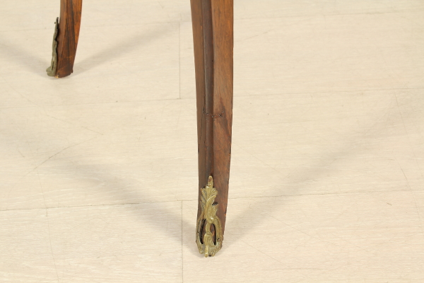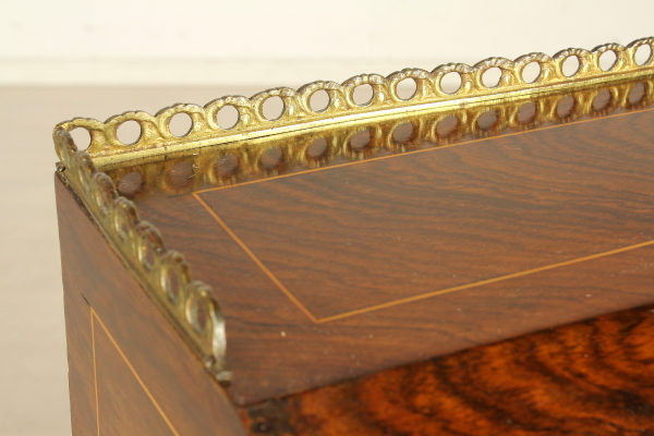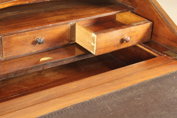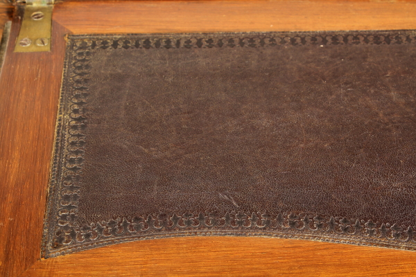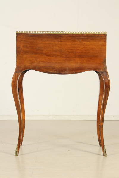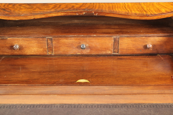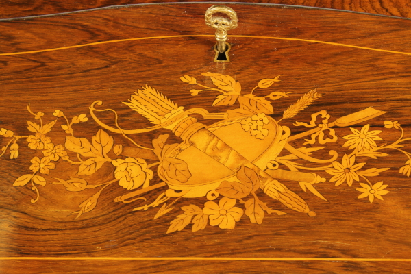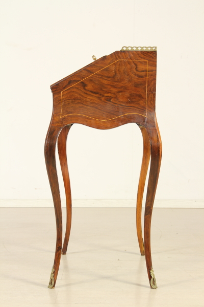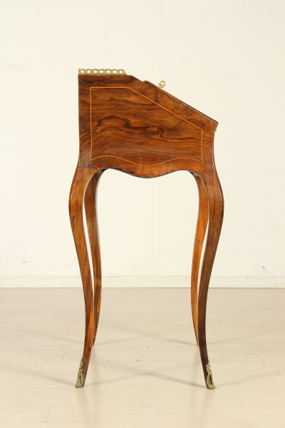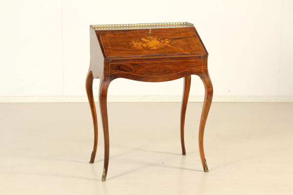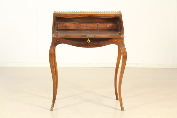 Retta da gambe mosse, presenta fascia e anta a ribalta sagomate. All'interno tre cassettini e vano a giorno. Pianetto in pelle e piano interno scorrevole che svela segreto. Anta riccamente intarsiata. Fregi in ottone.