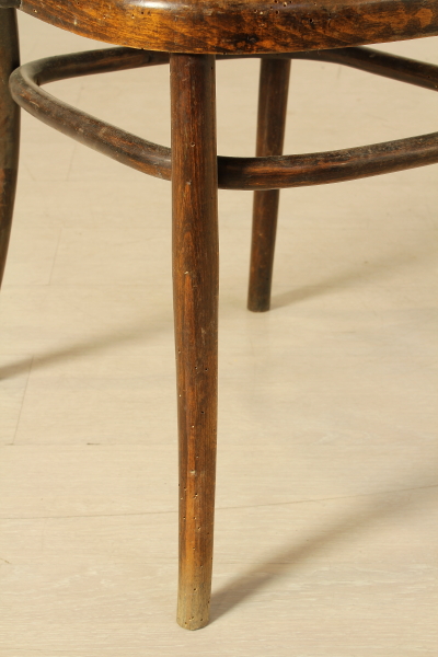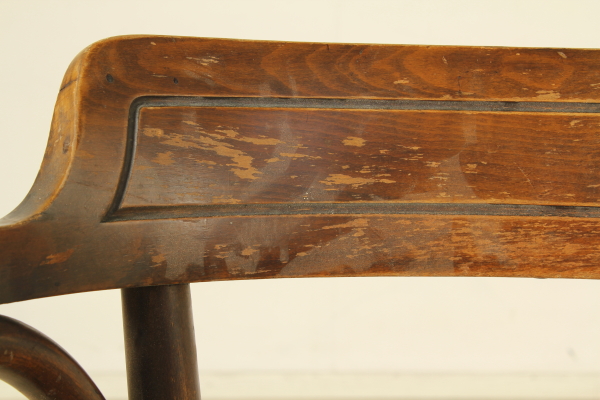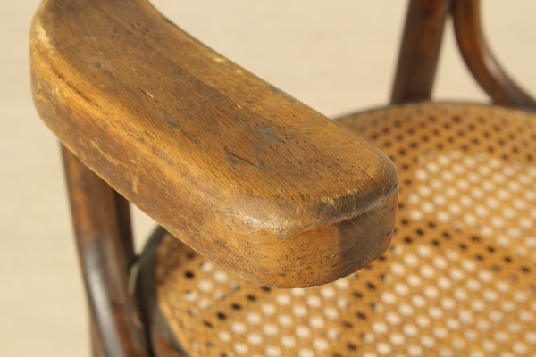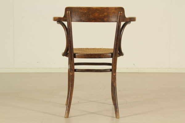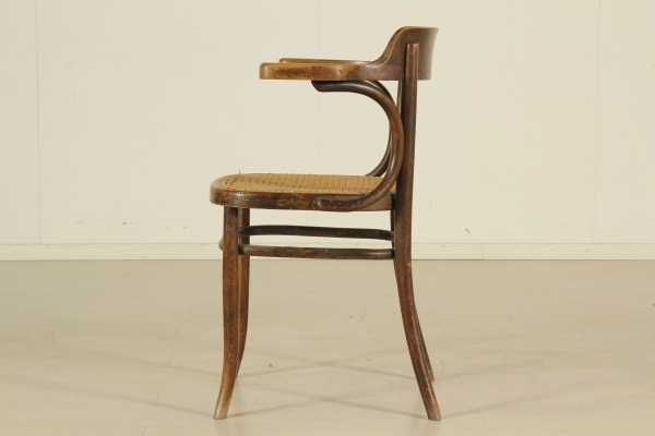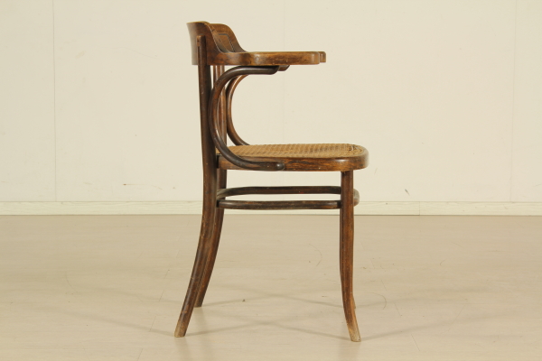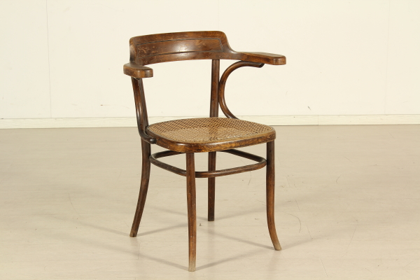 In faggio curvato a vapore; schienale e braccioli a scanno, seduta incannucciata. Etichetta FISCHEL sotto la seduta.